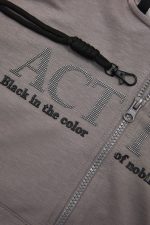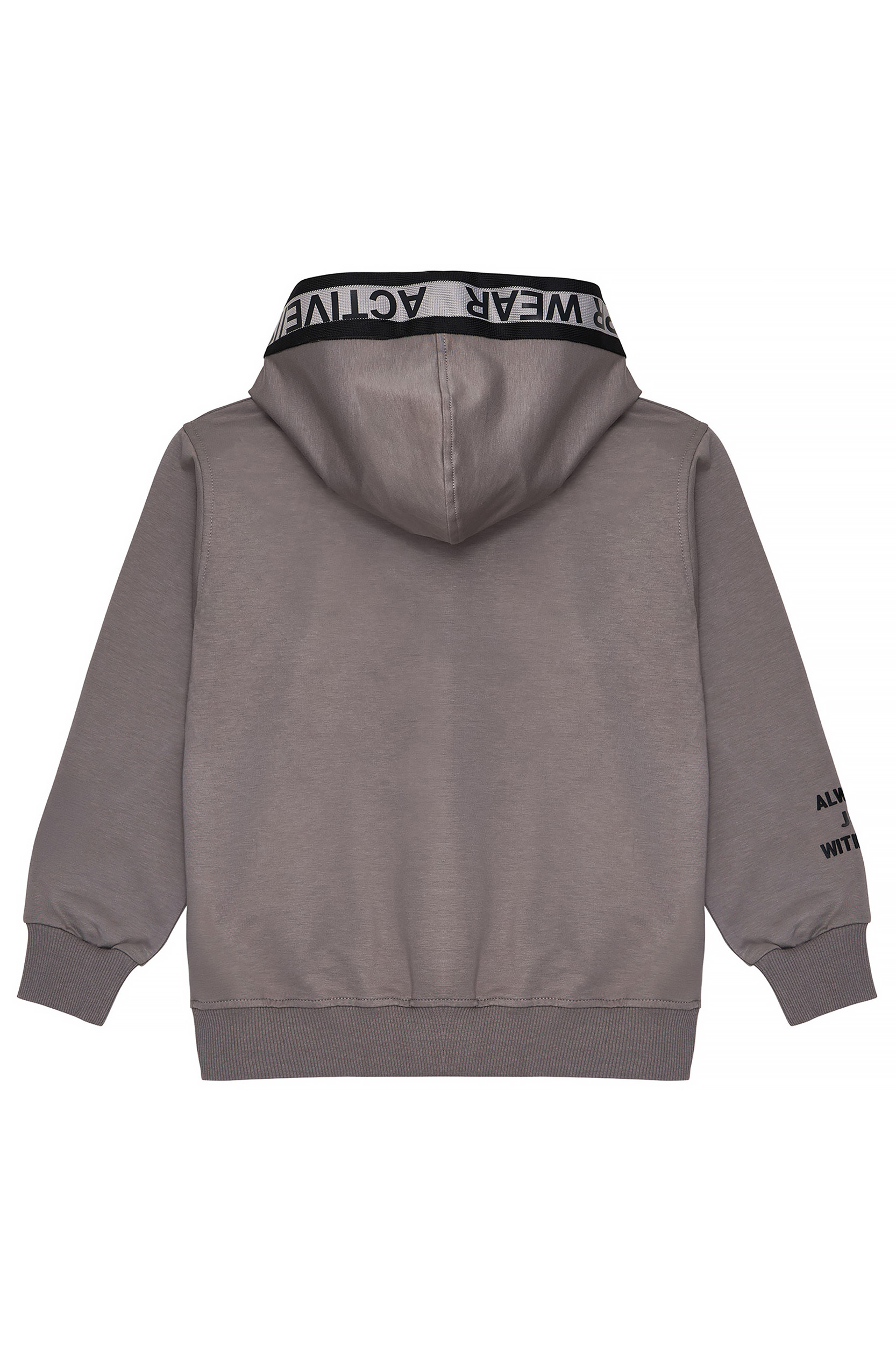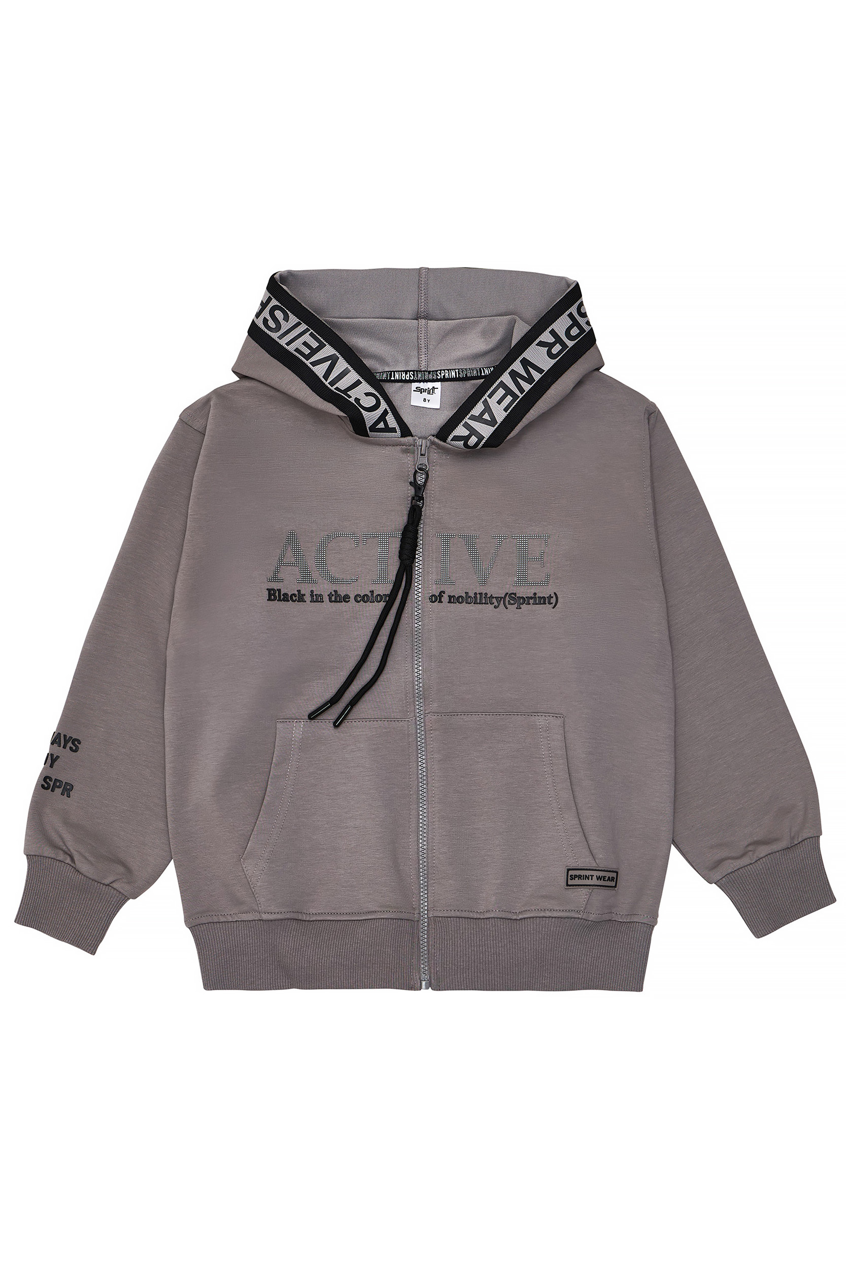 - Children’s hooded sweatshirt cardigan. Front zip fastening and pocket, front and sleeve print with embossed texture and rubber SPRINT label. Two-color straight-line ribbing on hood with “Active wear” lettering.