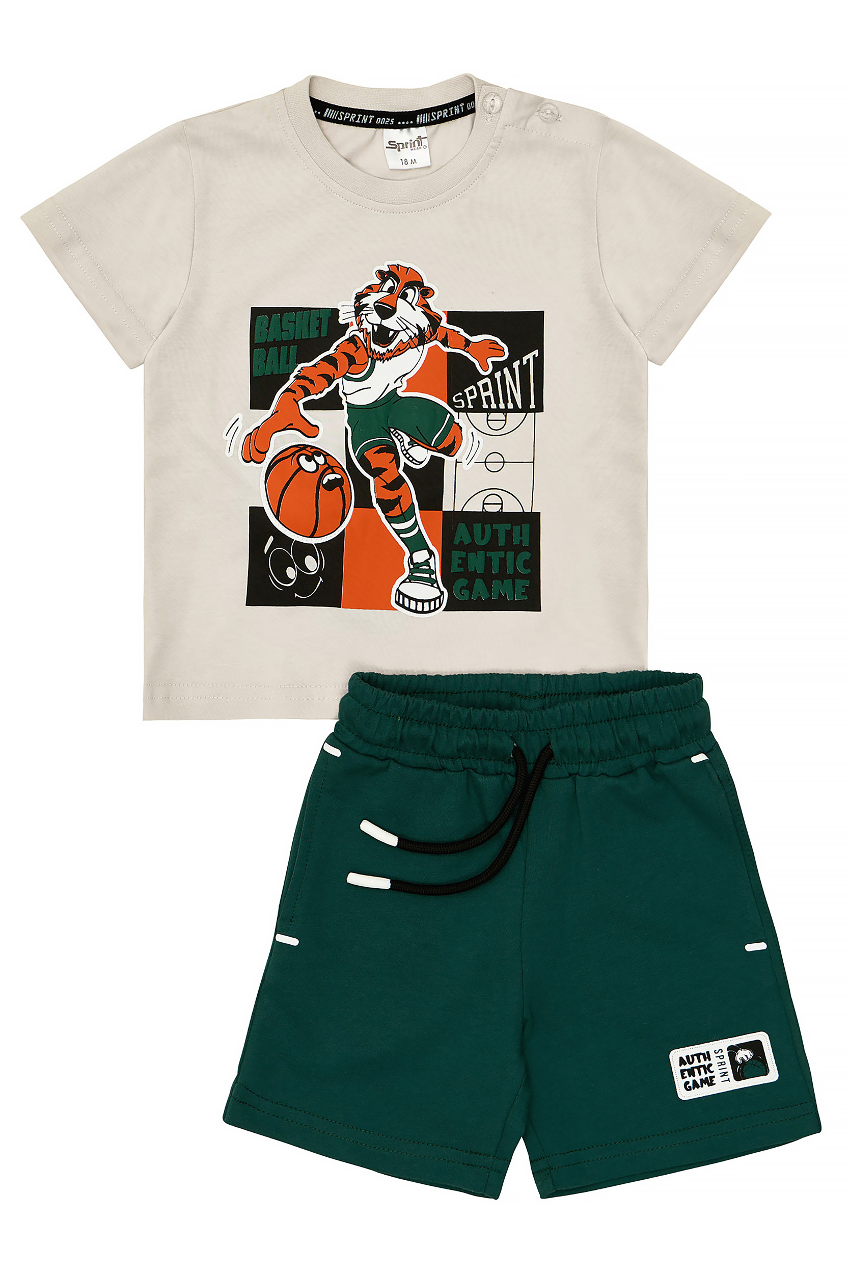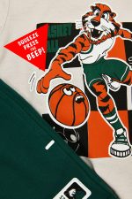 • Children’s set of 2 pieces. Printed front shirt with a “cool” tiger playing basketball and an inner horn that makes a sound. Sweatshirt shorts with elastic waistband and adjustable drawstrings, side pockets and print on the bottom.