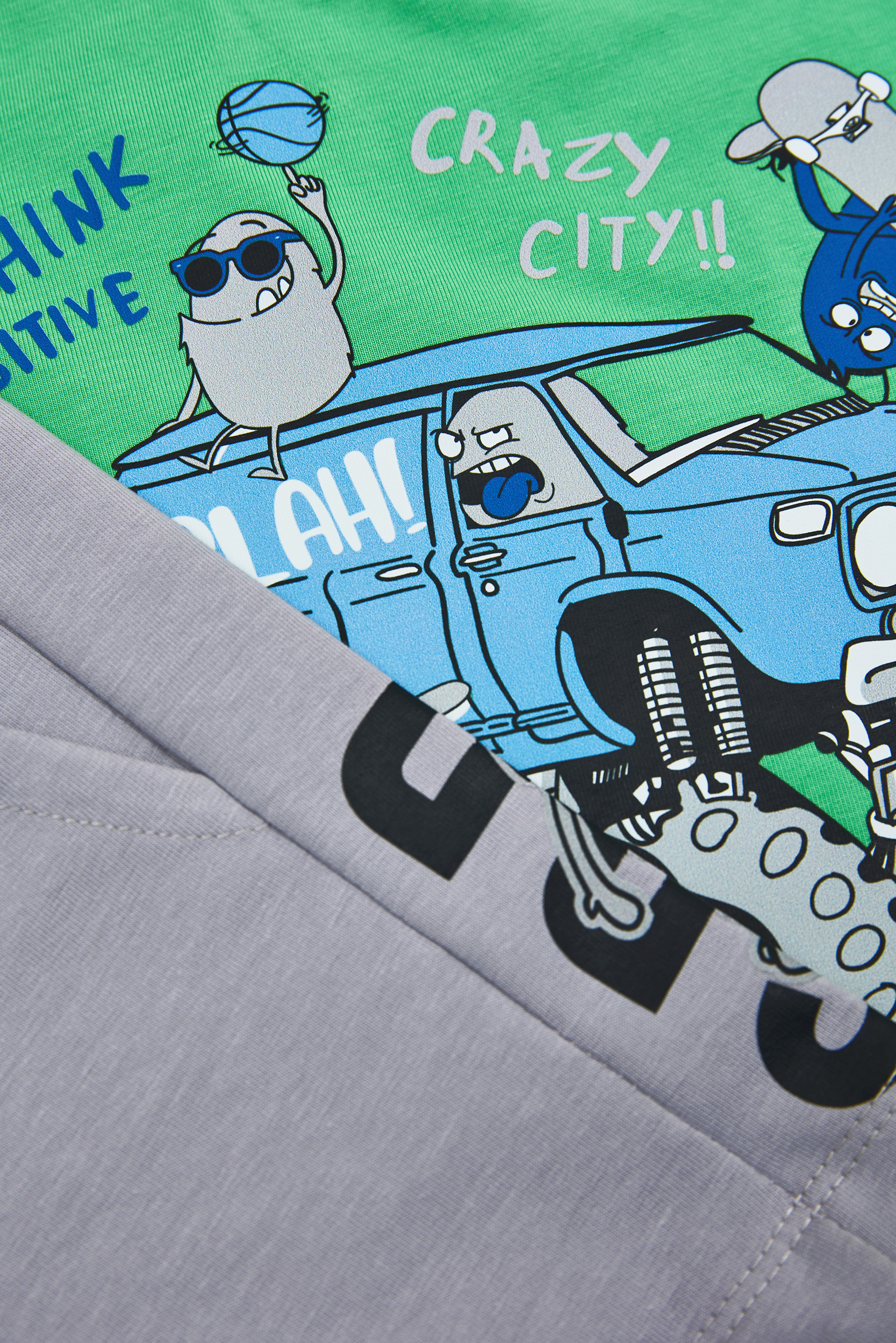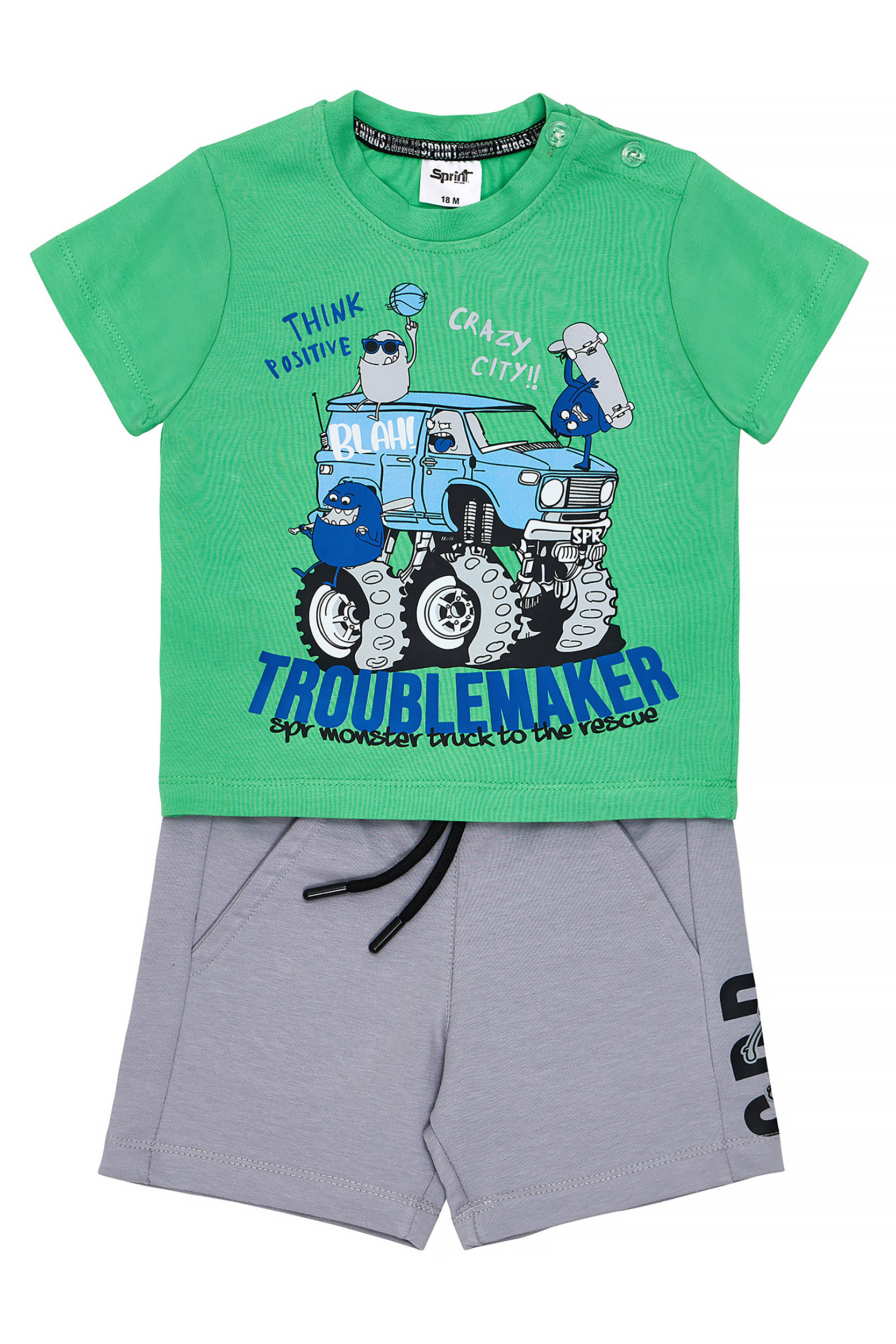 - Children’s set of 2 pieces. Blouse with print on front and back with “Monster Troublemakers” ready for adventure! Shorts hoodie with elastic waistband and adjustable drawstrings. Front slant pockets and print.