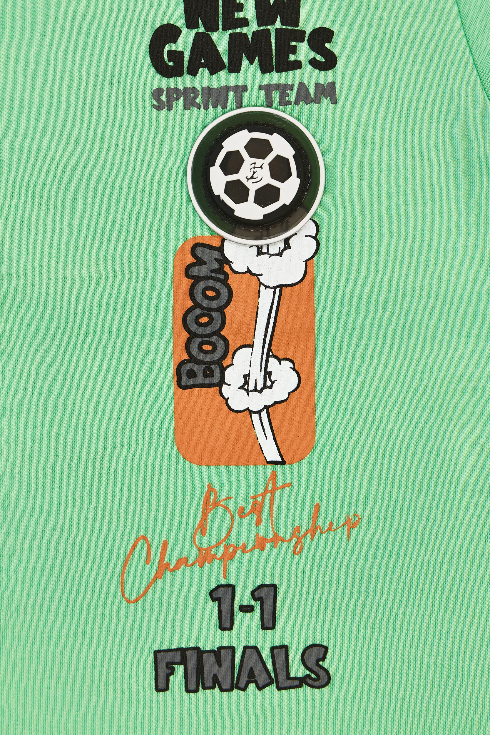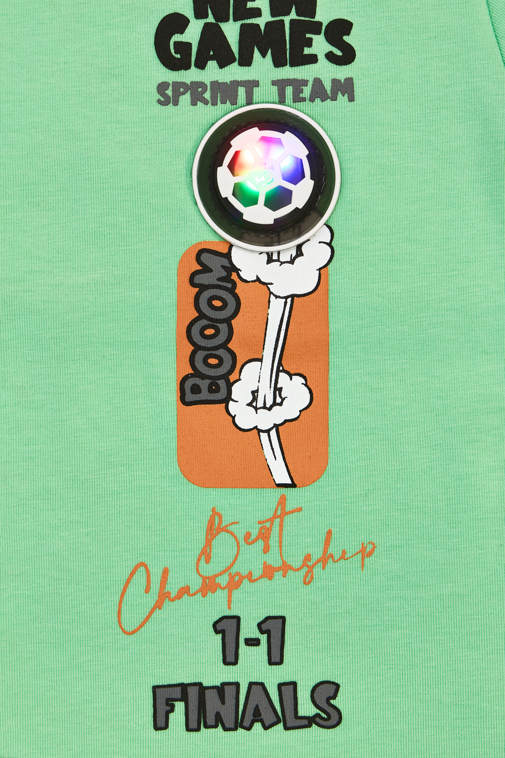 - Children’s set of 2 pieces. Blouse with embossed dynamic graphic print “New Soccer Games” on the front with flashing light bulb ball and back flip “SPRINT PLAYER” on the back. Sweatshirt shorts with elastic waistband and adjustable drawstrings, side pockets and print with subtle decorative chain all around bottom.