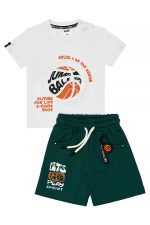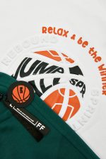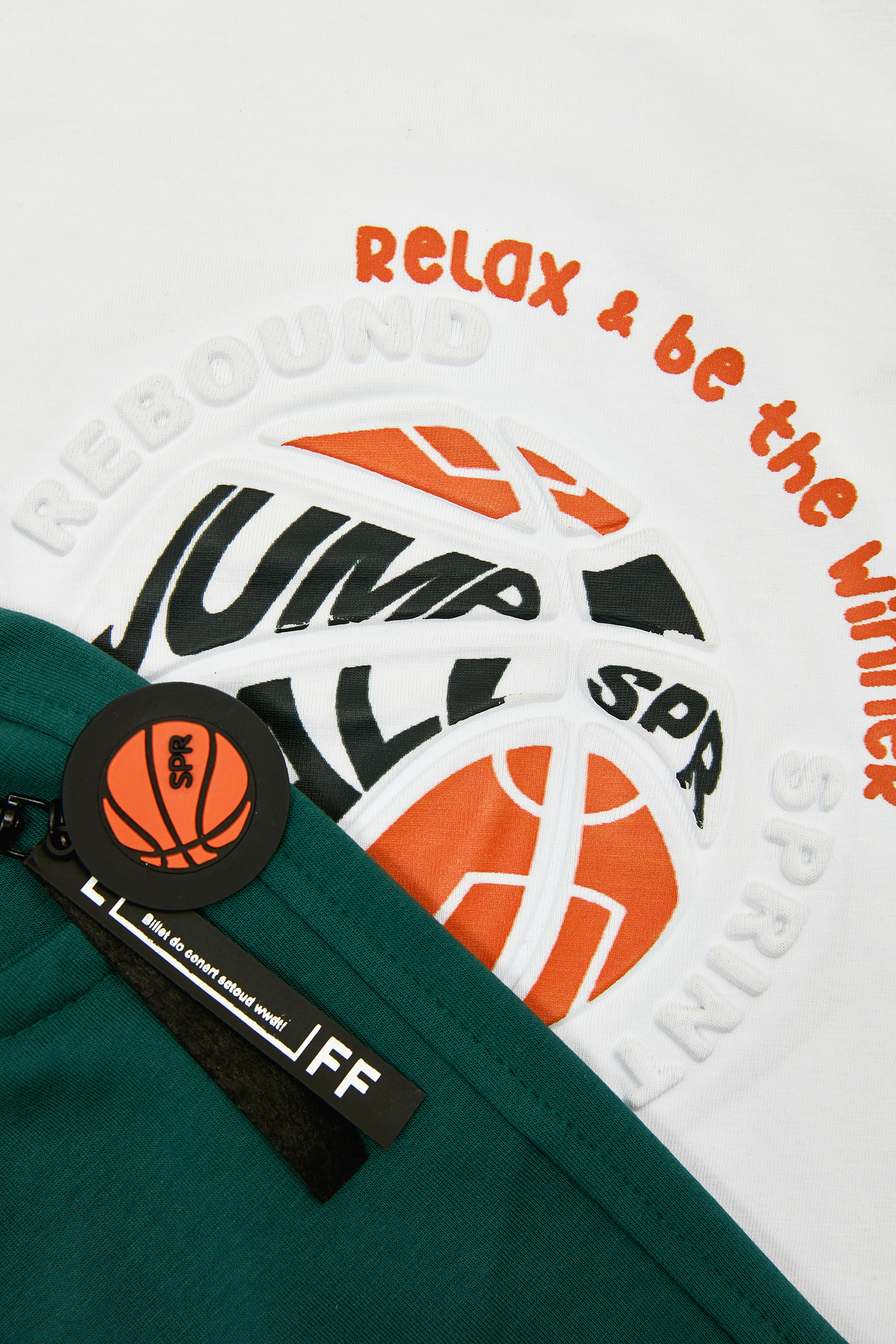 - Children’s set of 2 pieces. T-shirt with embossed 3D basketball print on the front with the slogan “Relax & be the winner”. Sweatshirt shorts with elastic waistband and adjustable drawstrings, front round pockets and print with accessory decorative key chain ball on the side.
