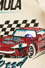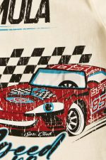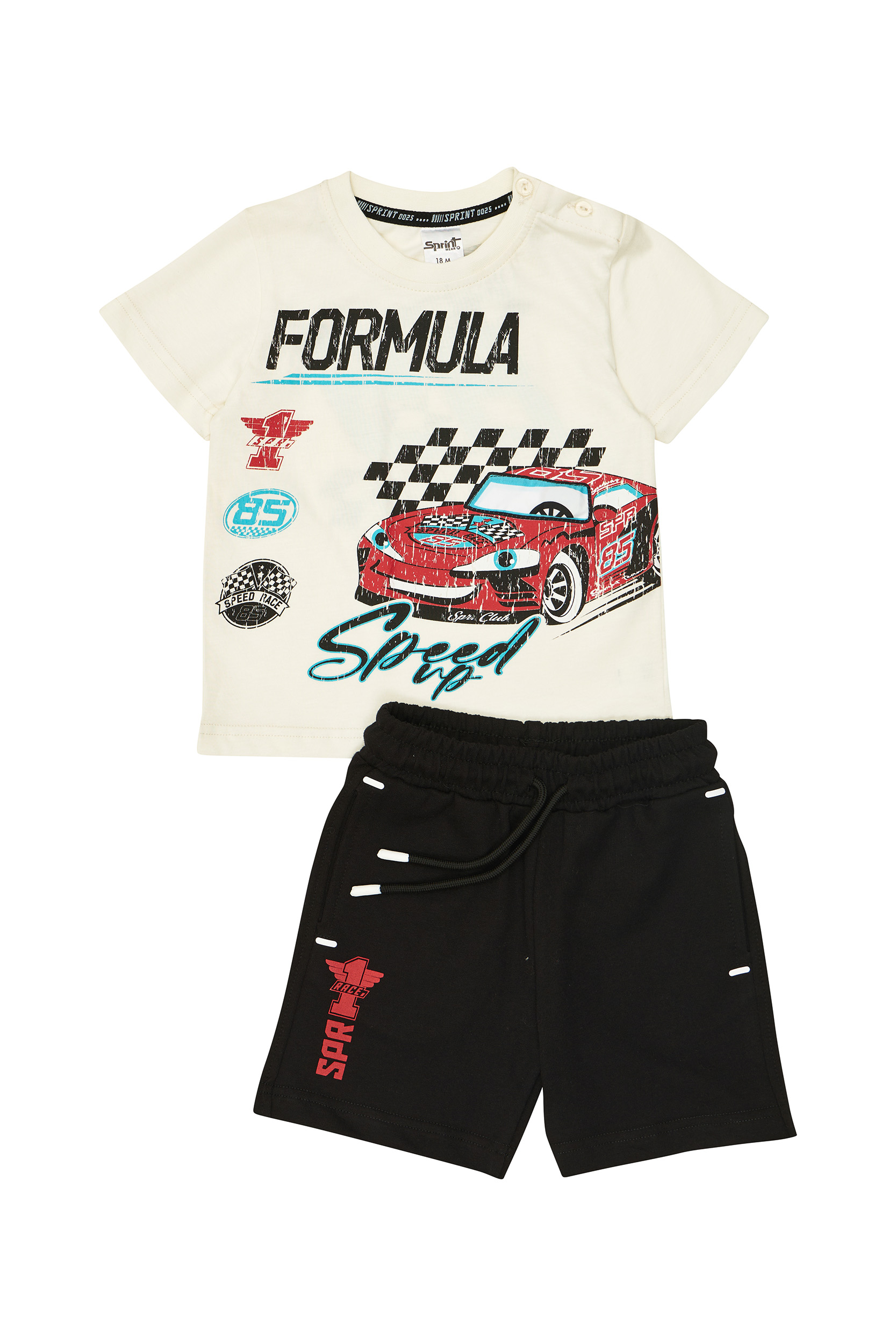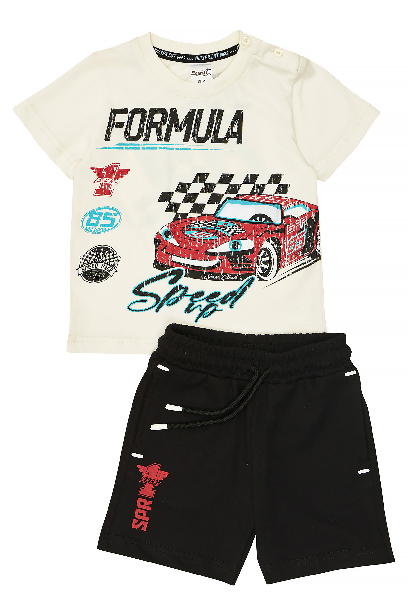- Children’s set of 2 pieces. T-shirt with full colour race car print, ready to cross the checkered flag at the finish line with built-in flashing light. Sweatshirt shorts with elasticated waistband and adjustable drawstrings, side pockets and print on the bottom.