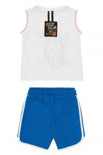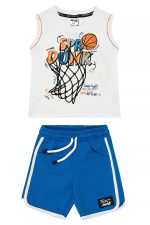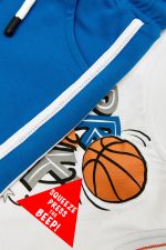 - Children’s set of 2 pieces. Sleeveless shirt with dynamic “DUNK” stamp and basketball theme with an internal horn that makes a sound. Sports hoodie shorts with elastic waistband and adjustable drawstrings, front round pockets and two-tone sports facings. SPRINT rubber label on the bottom.