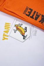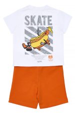- Children’s set of 2 pieces. Blouse with a print on the front of an awesome Hot Dog character, showing off on roller skates inside an “iconic” pocket and print on the back. Sweatshirt shorts with elastic waistband and adjustable drawstrings, side pockets and “SKATE” logo on the side.