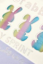 - Children’s set of 2 pieces of lycra. Blouse with print on the front with three bunnies in iridescent/pastel shades with rhinestones. Capri leggings with elastic waistband and rhinestones.