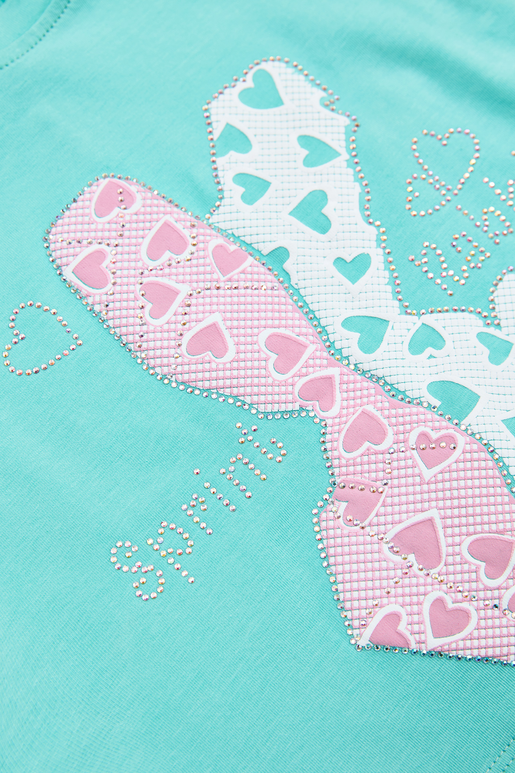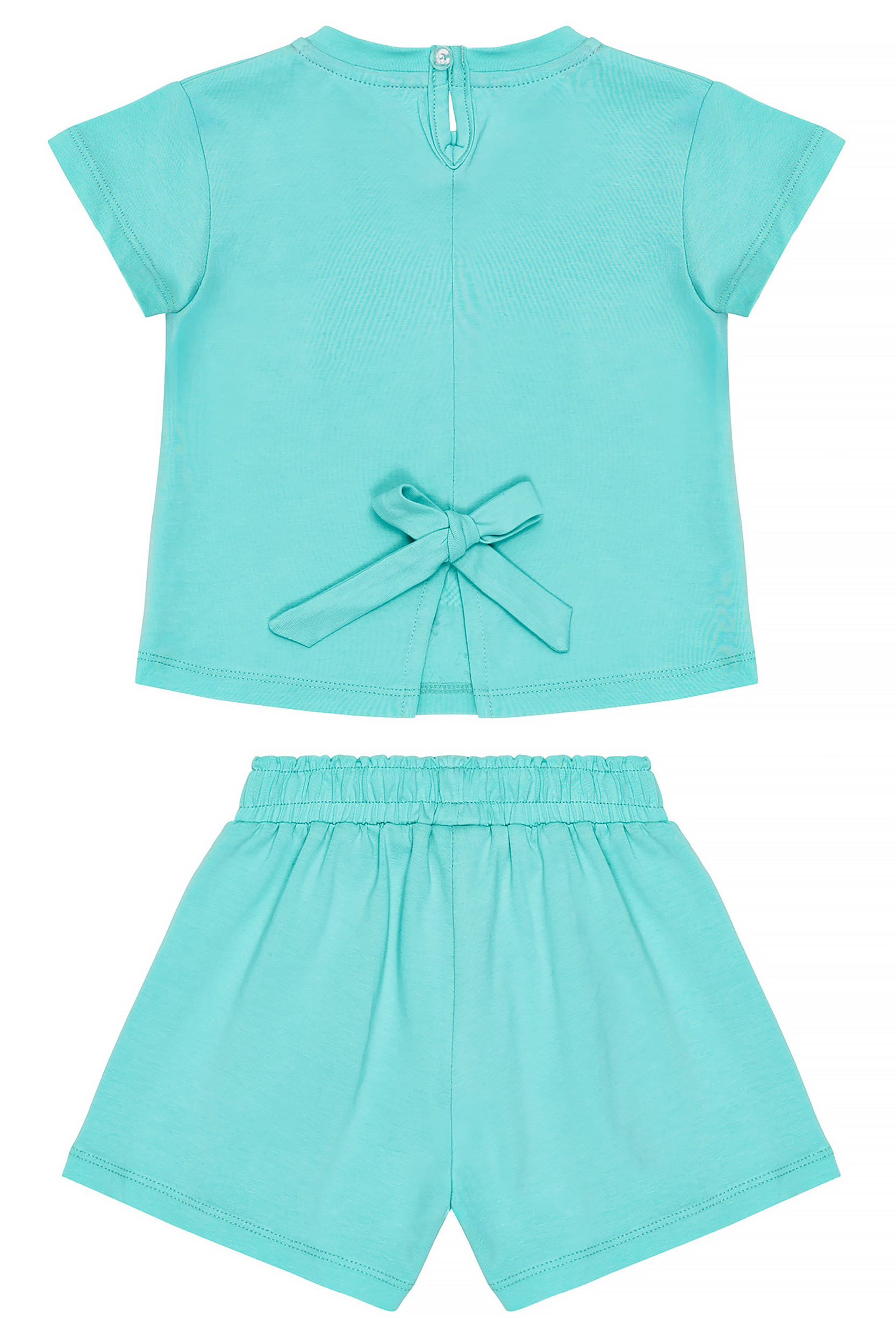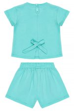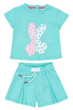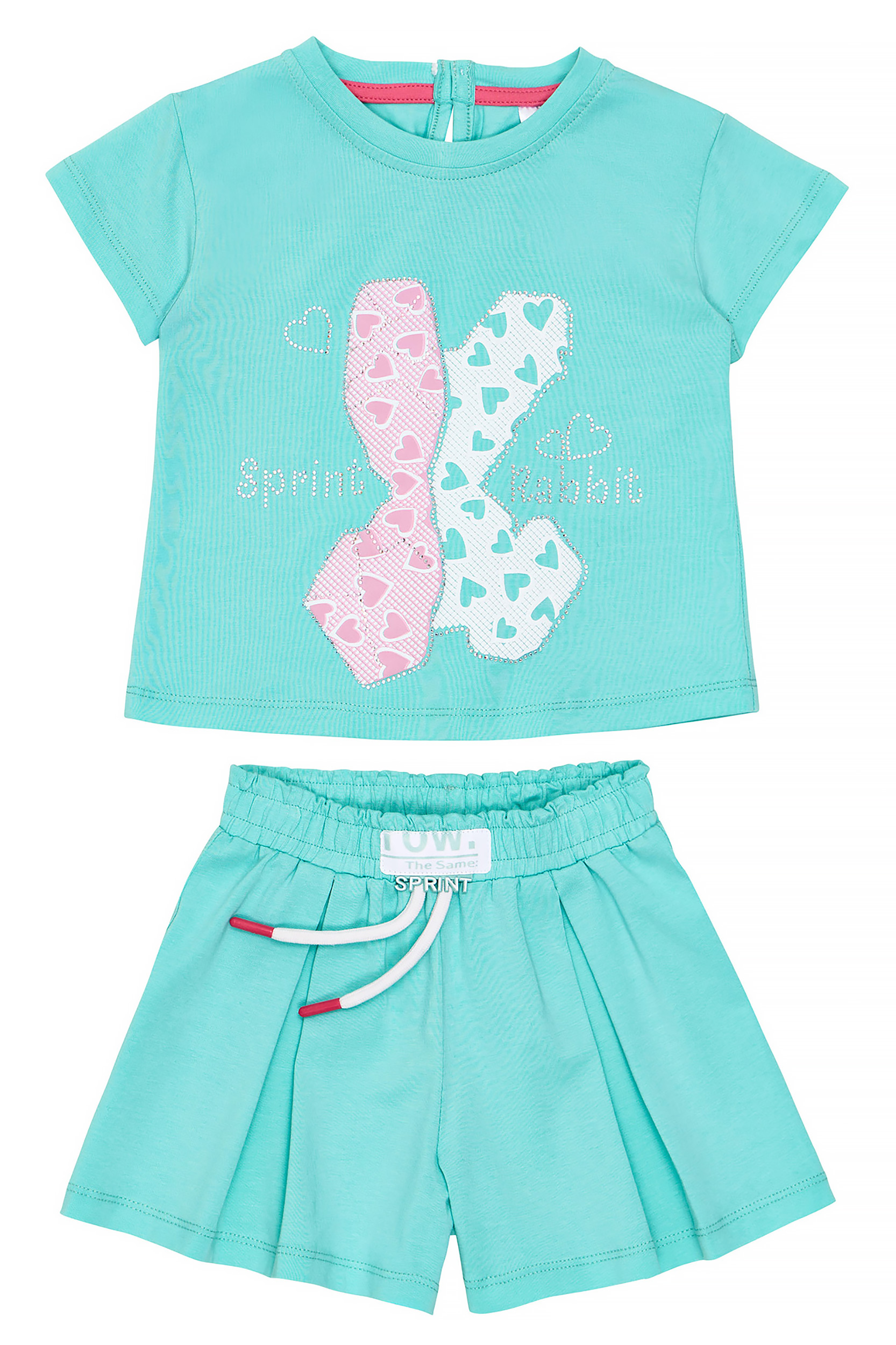 - Children’s set of 2 pieces of lycra. RABBIT printed blouse with embossed hearts and rhinestones on the front. Back with opening and decorative bow. Zip panty shorts with decorative drawstrings and rubber sprint tag.
