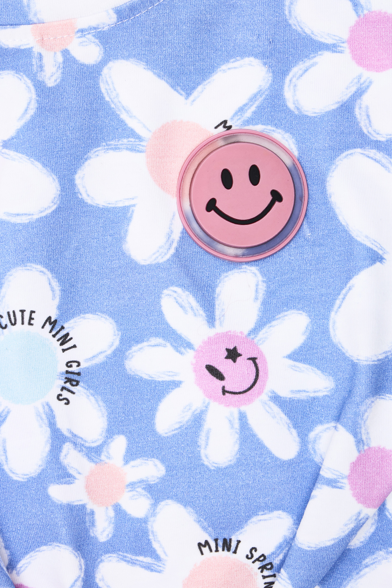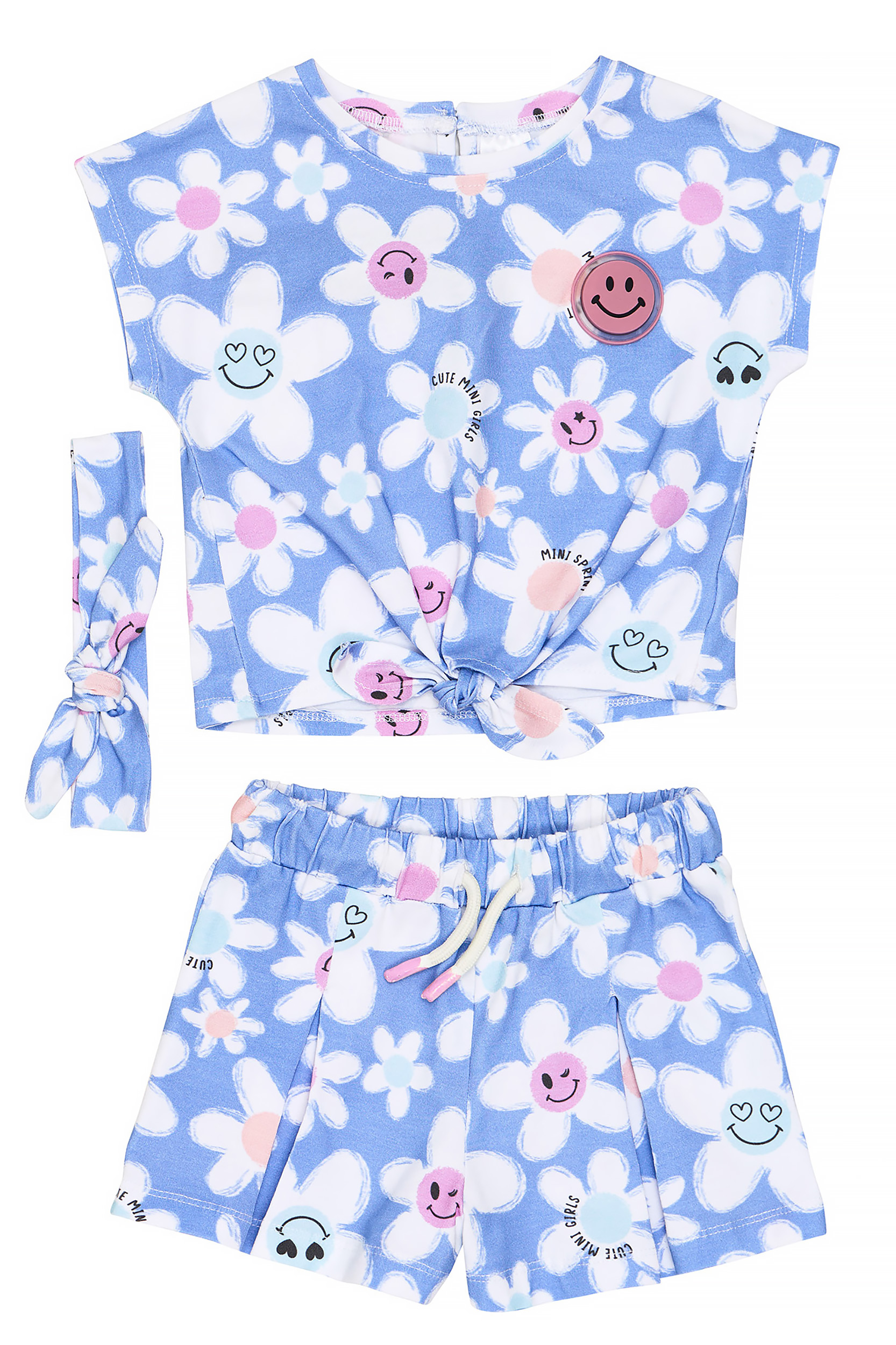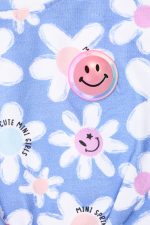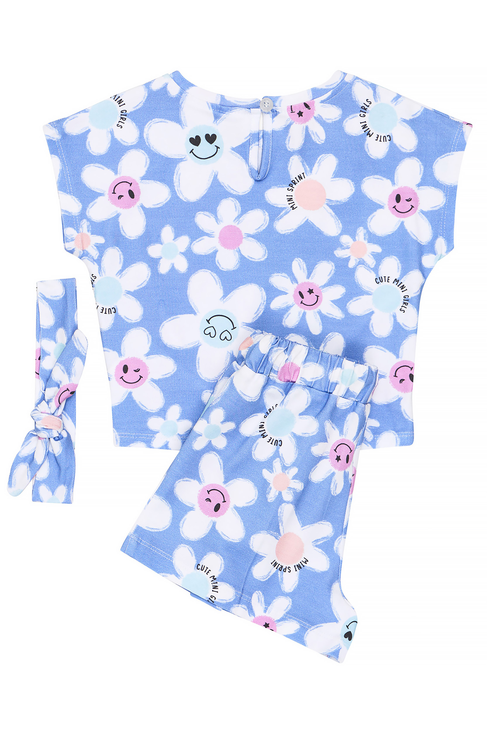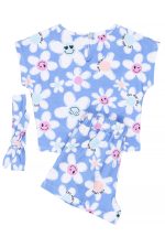 - Children’s set of 2 pieces of lycra. Blouse with all-over pattern “Happy Daisies”. Features a stylish tie (knot) on the front and a flashing light. Headband accessory. Shorts with matching floral pattern with elastic waistband and adjustable drawstrings with front wrap-around drawstrings.