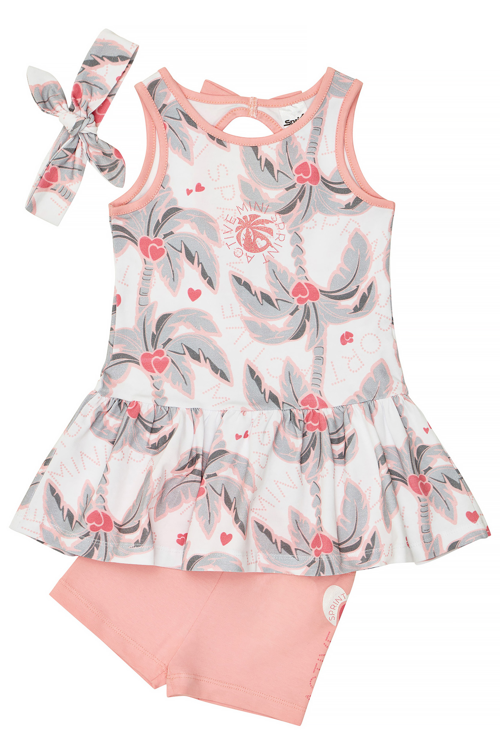 - Children’s lycra dress with ruffles at the waist, set with bicycle cologne. All-over tropical pattern with front print “MINI SPRINT ACTIVE” with sugar glitter detail. Athletic back with opening and decorative bow. Accessory headband.