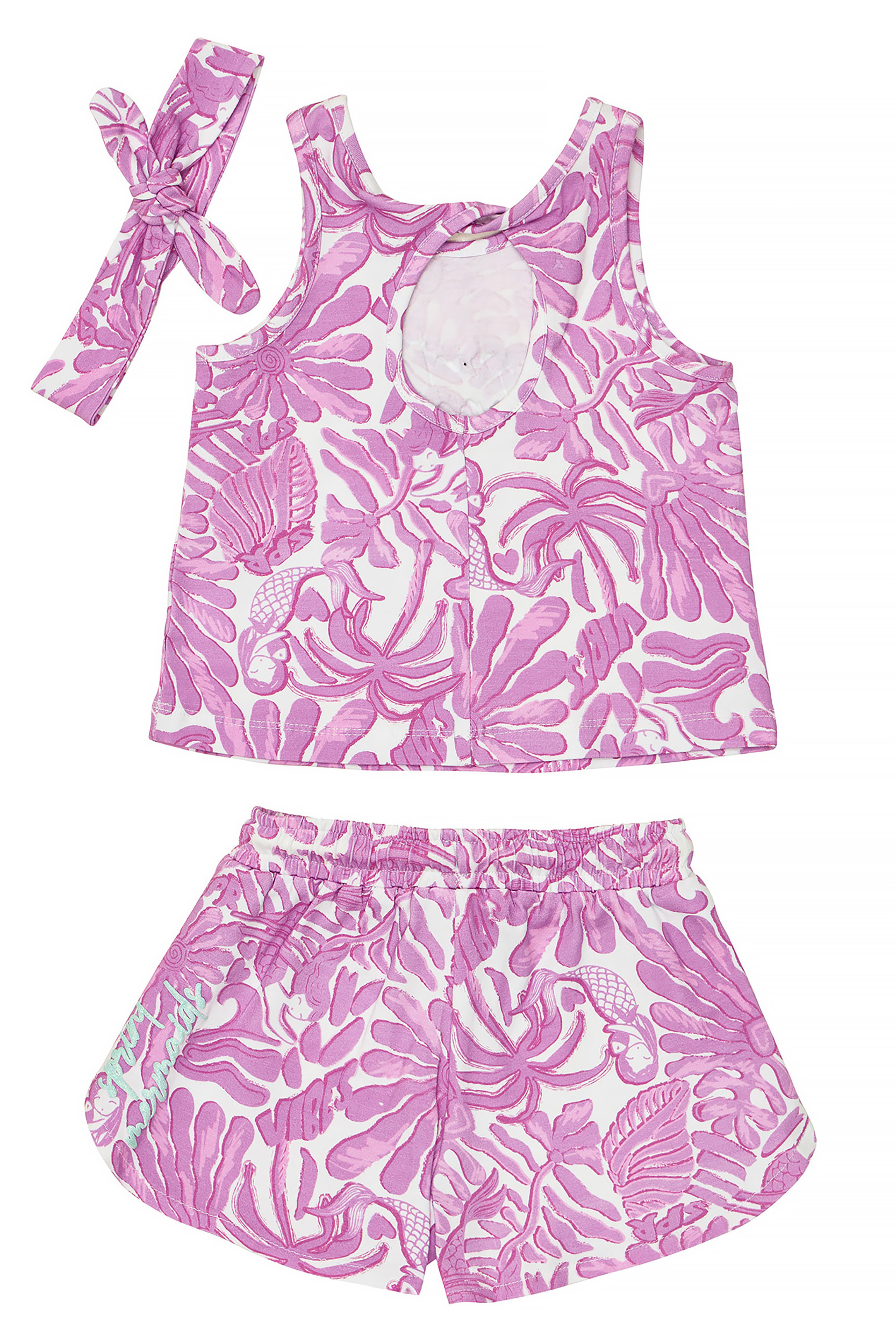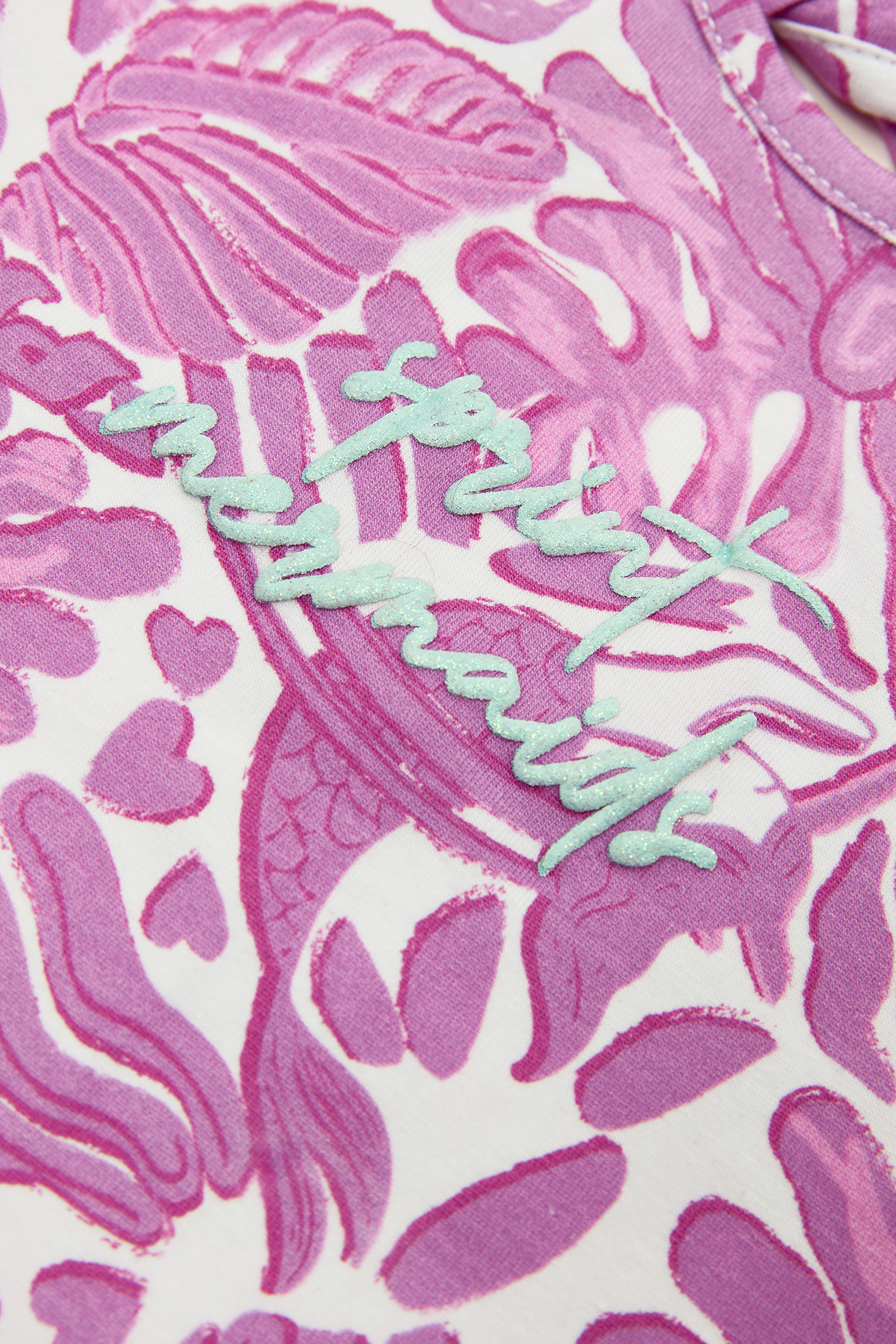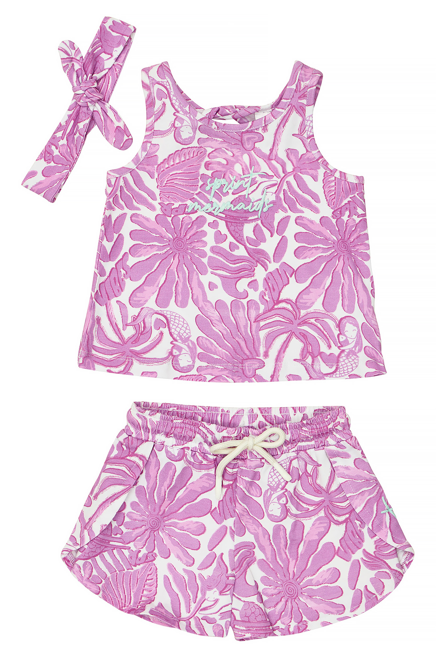 - Children’s set of 2 pieces of lycra. Sleeveless blouse with all-over “Mermaid vibes” pattern and embossed print on front with sugar glitter detail and back opening. Headband accessory. Shorts with matching pattern and elastic waistband with adjustable drawstring and embossed print at back.