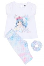 - Children’s set of 2 pieces of lycra. Blouse with front print in iridescent/pastel “Magical Mermaid” shades and built-in flashing light. Hair elastic accessory. Capri leggings with elastic waistband and all-over effect of multicolored scales reminiscent of a rainbow underwater.