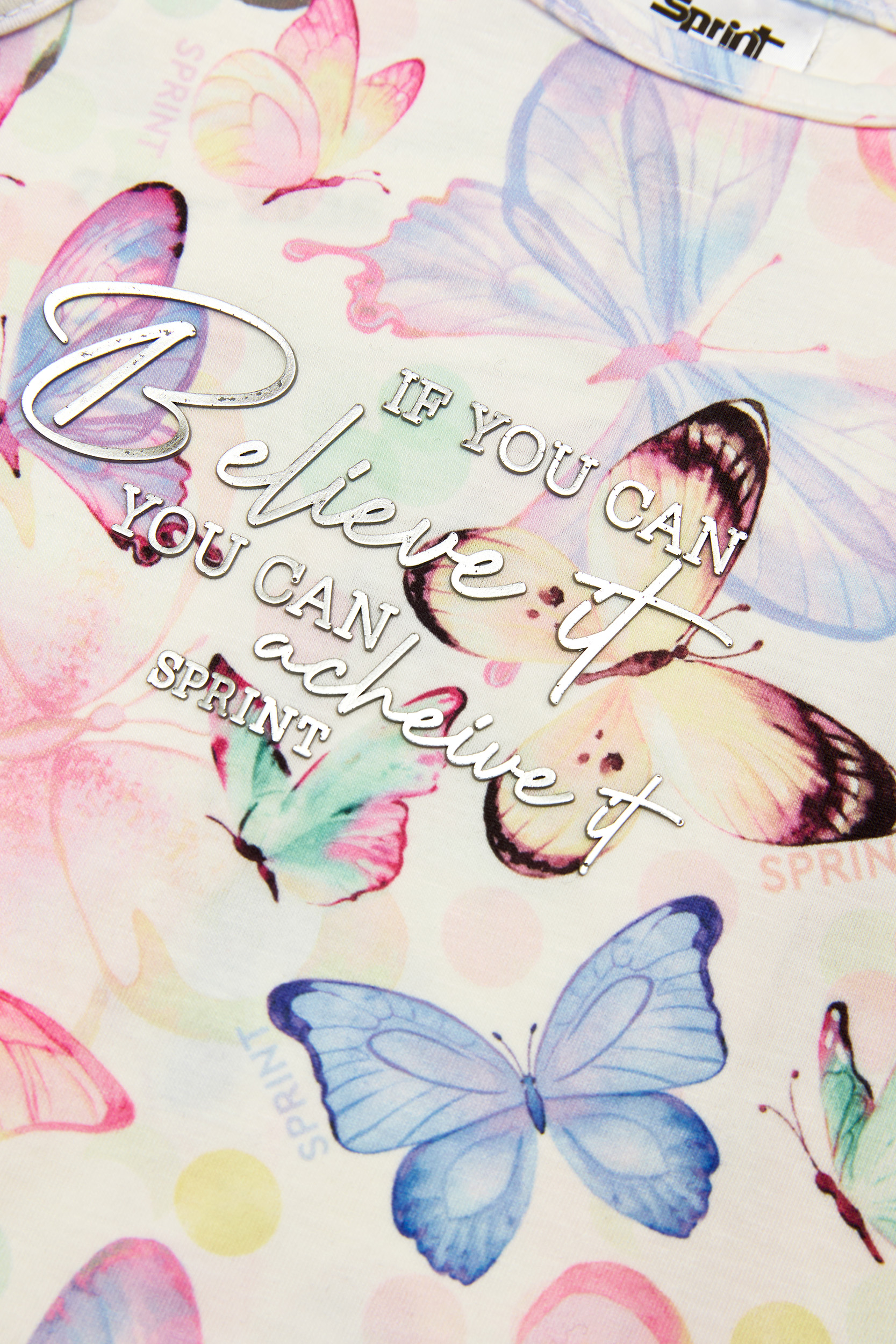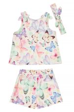 - Children’s set of 2 pieces of lycra. Sleeveless blouse with all-over “Butterflies” pattern in pastel shades and embossed rubber silver print on the front. There are decorative bows on the shoulders and a cross-over opening in the back. Headband accessories. Skort skirt with the same pattern and elastic waistband with decorative bow.