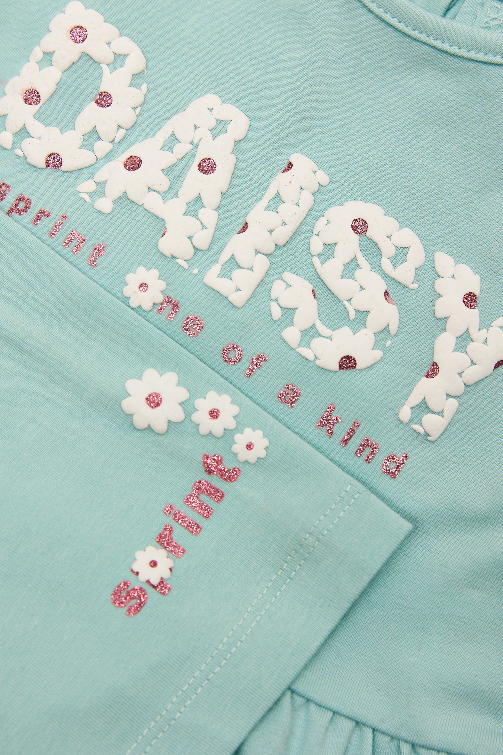 - Children’s set of 2 pieces of lycra. Sleeveless blouse with embossed “DAISY” print with floral details on the chest and elegant ruffles on the bottom for a girly look. Back with opening and decorative bows. Biker leggings with elastic waistband and print.
