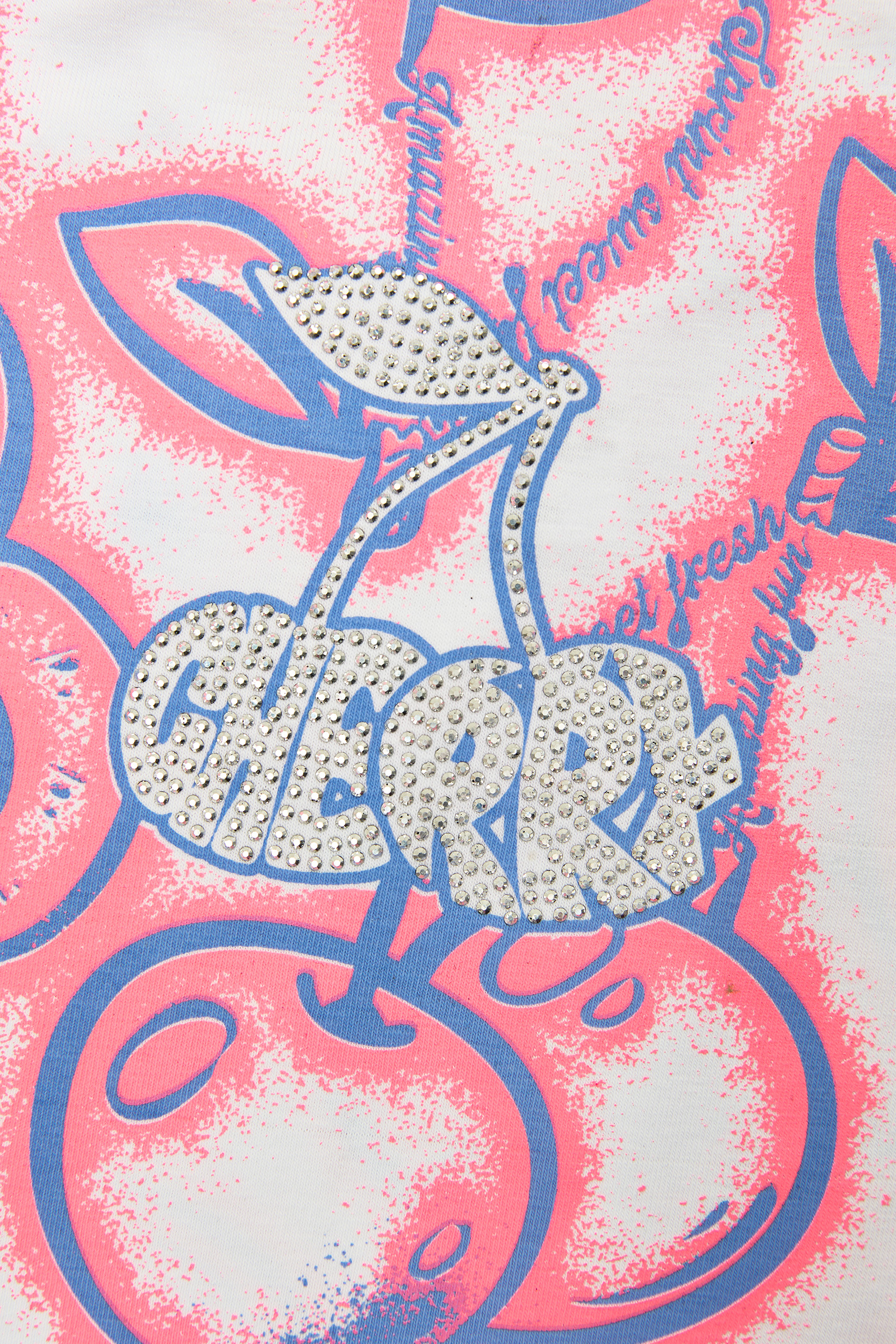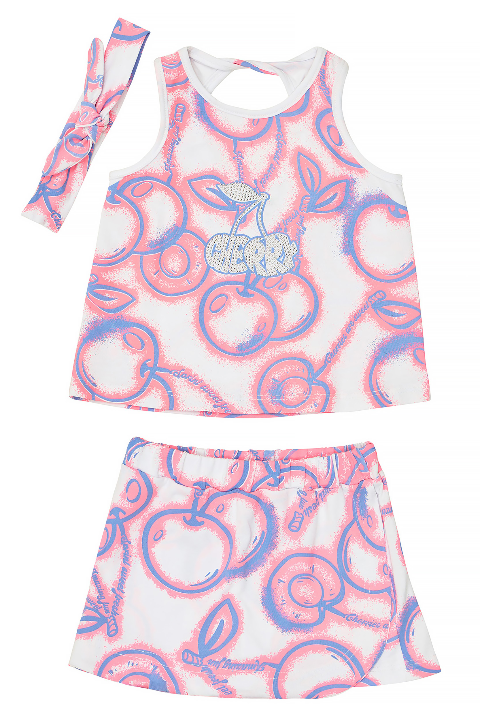- Children’s set of 2 pieces of lycra. Sleeveless blouse with all-over “Cherries” printed pattern and metal rhinestones with back opening. Headband accessory. Skort skirt with the same pattern and elastic waistband.
