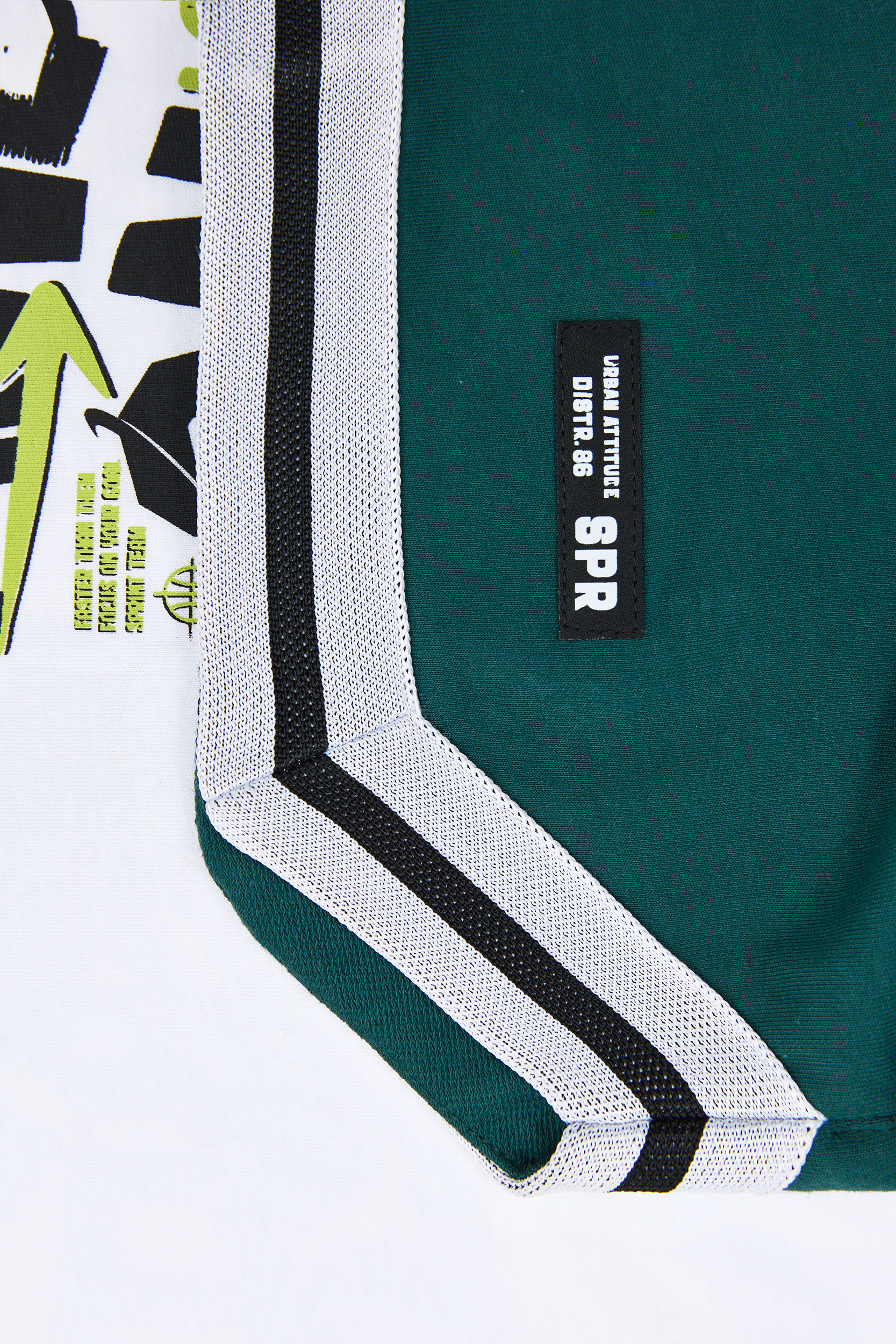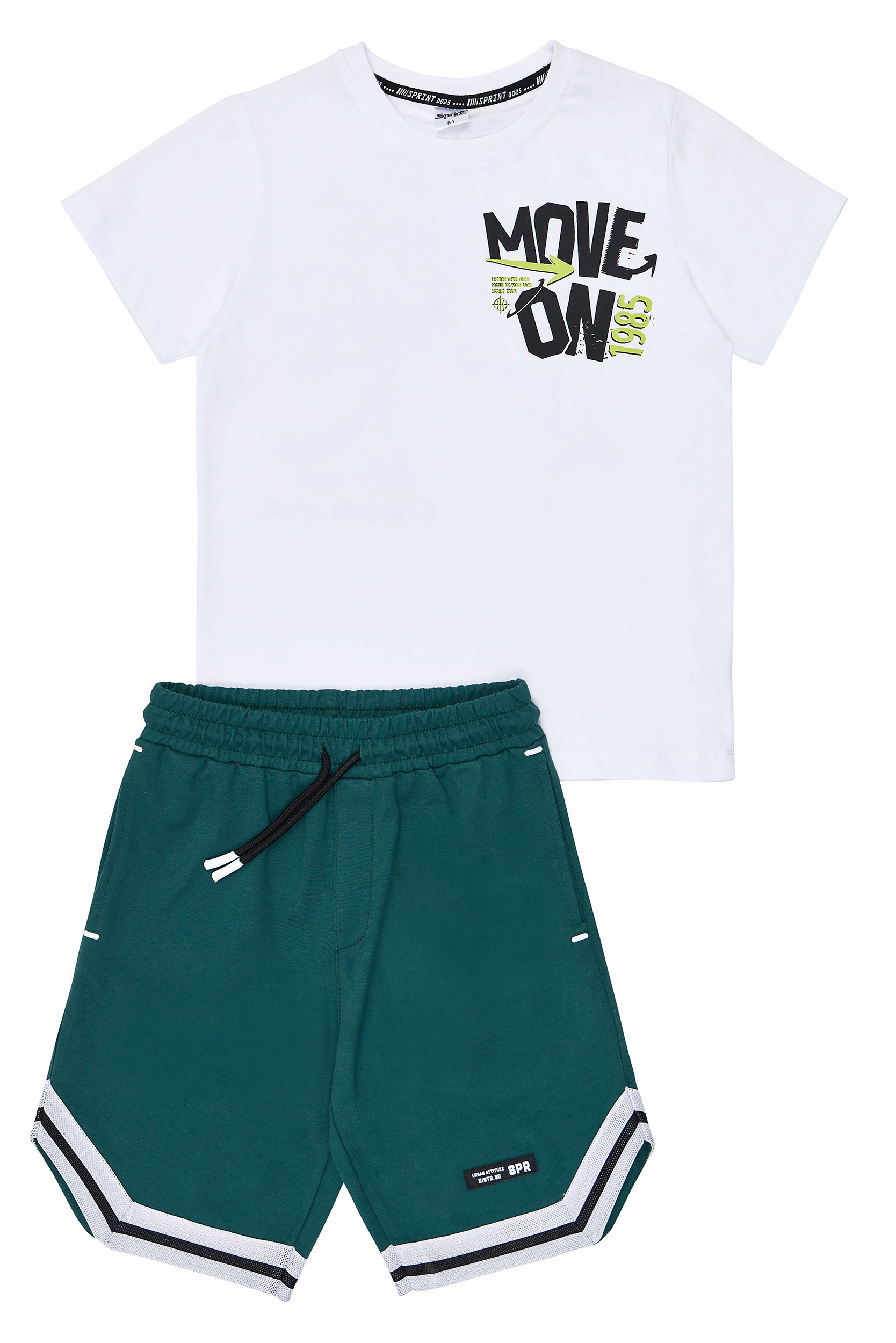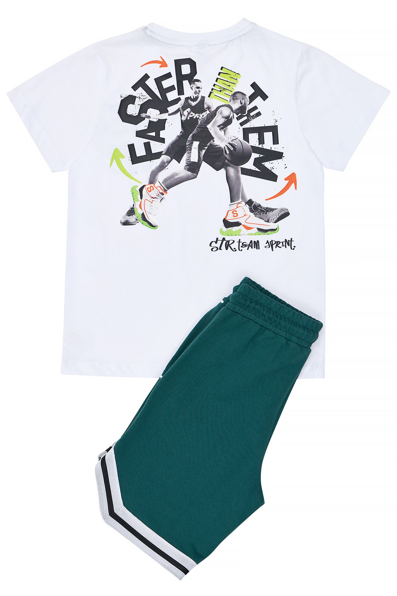 - Children’s set of 2 pieces. T-shirt with basketball print “MOVE ON” on the front and back print with 2 basketball players in action “FASTER THAN THEM”. Sports hoodie shorts with elastic waistband and adjustable drawstrings, side pockets, “Sprint” Logo and sports facings on the bottom.