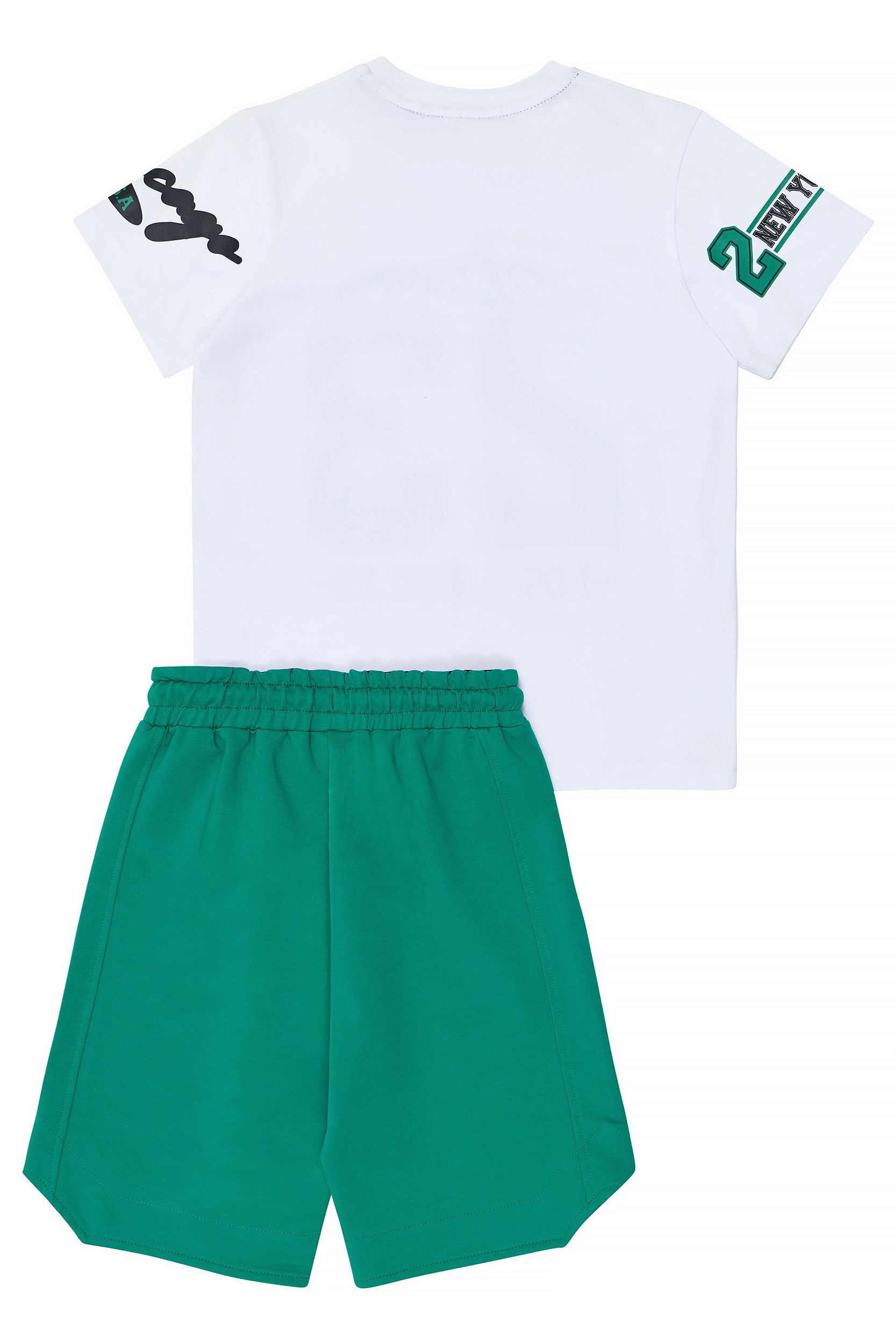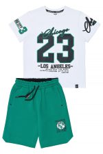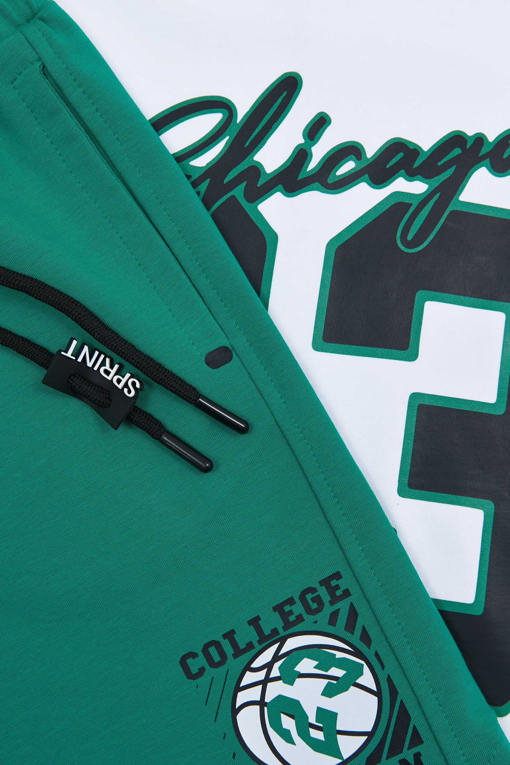- Children’s set of 2 pieces. Blouse with “Chicago 23” print on the front and sleeves. Sweatshirt shorts with contrasting color contrasting elastic waistband inside and adjustable drawstrings with rubber decorative label, side pockets and beveled cut at bottom with College team print.