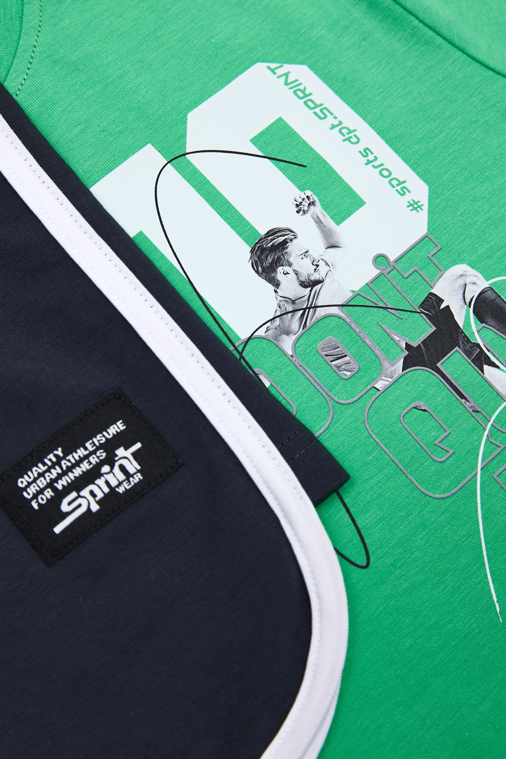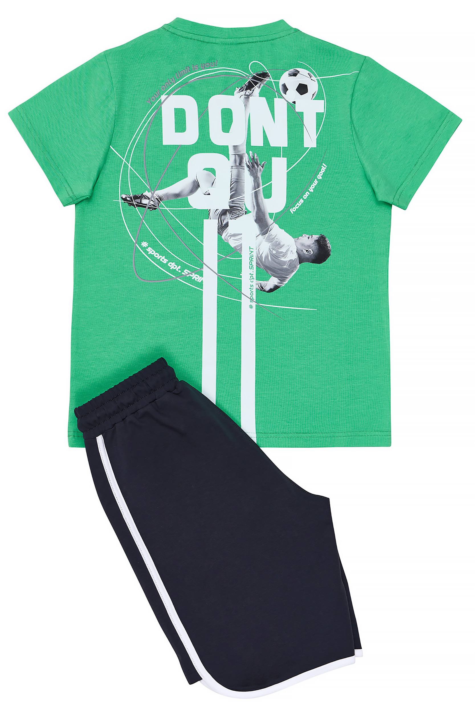 - Children’s set of 2 pieces. T-shirt with “Don’t Quit” print on the front and back with football theme. Sports hoodie shorts with elasticated waistband and adjustable drawstrings, with front round pockets, rubber SPRINT label and two-colour sports facings.
