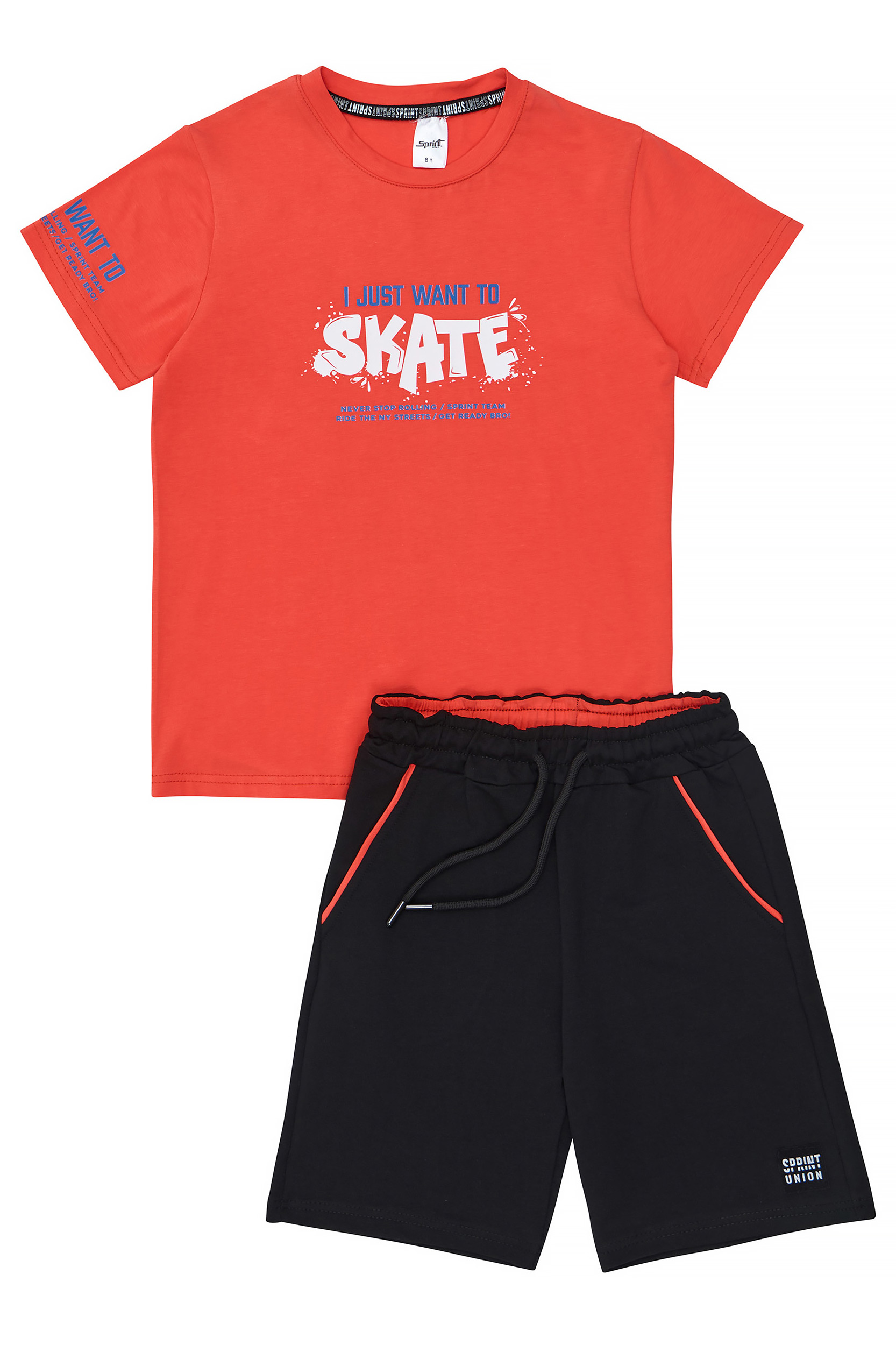 • Children’s set of 2 pieces. Blouse with “Ride the Streets with Sprint” print on the chest, back and sleeve. Sweatshirt shorts with elastic waistband, contrasting colored interior with adjustable drawstrings, front slant pockets and SPRINT logo label on bottom.