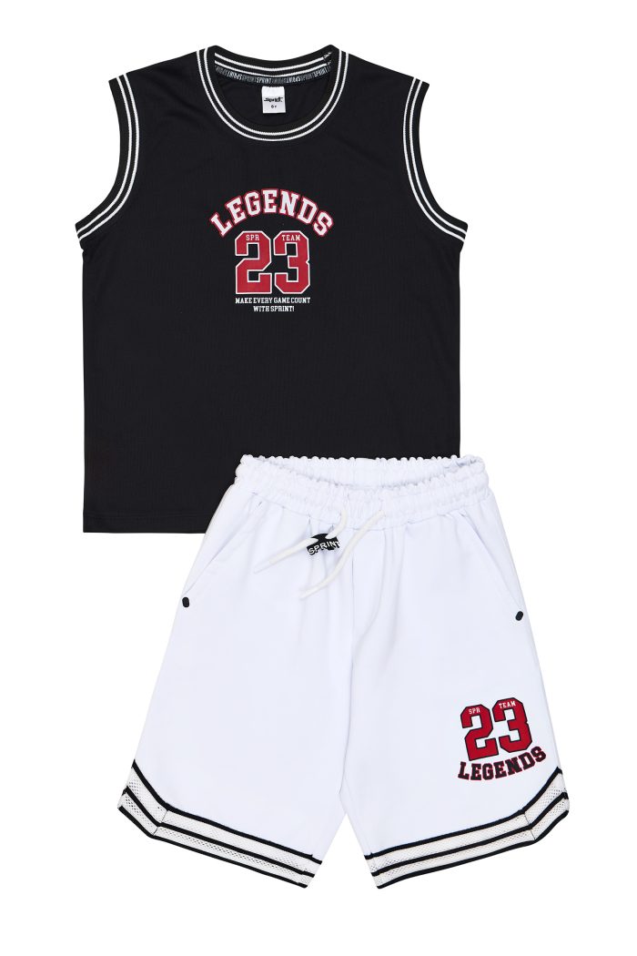 - Children’s set of 2 pieces. Sleeveless basketball shirt, Tech Sport Mesh with “Legends” print on the front and back with two-color ribbing on the neck and armpits. Sports hoodie shorts with elastic waistband and adjustable drawstrings with rubber decorative label, front slant pockets and sports facings on bottom with print.