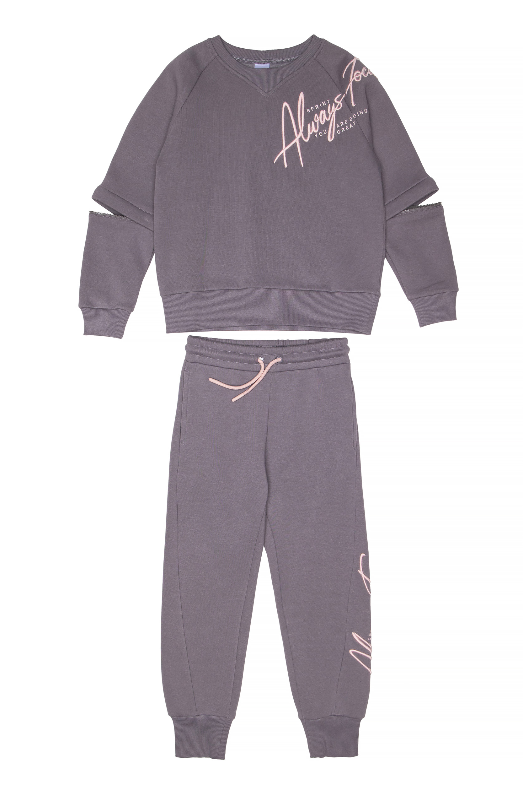 - Children’s 2-piece tracksuit set with fleece. Blouse with round neckline and embroidery on the front and sleeves with embossed texture, zippered openings at the elbows. Pants with elastic waistband and adjustable drawstrings with side pockets and embossed embroidery.