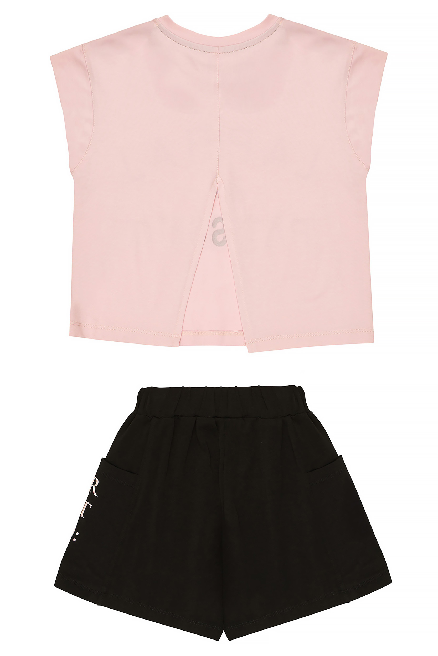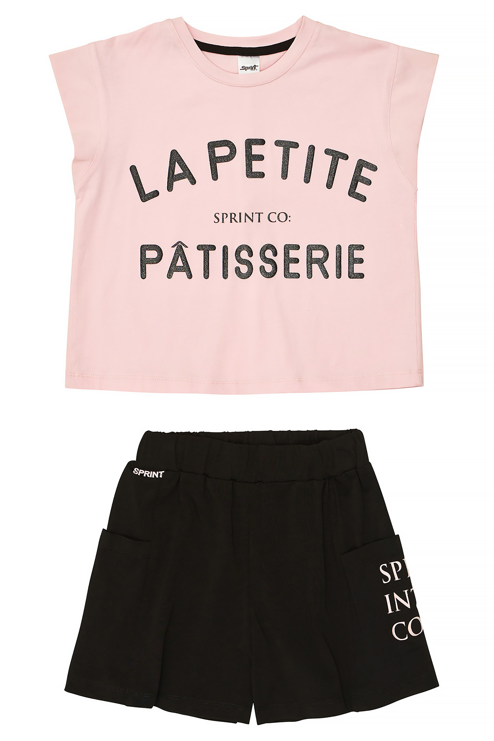 - Children’s set of 2 pieces of lycra. Blouse with embossed glitter print “LA PETITE PÂTISSERIE” on the front and opening on the back. Zip panty shorts with side pockets and glitter embossed print.