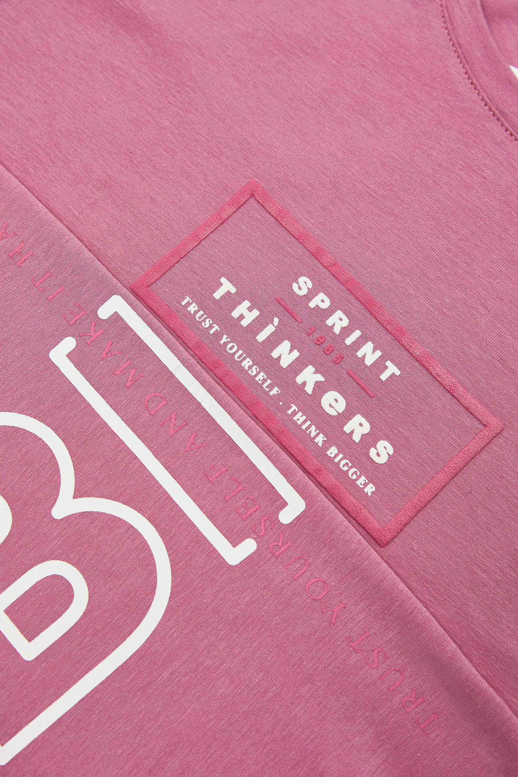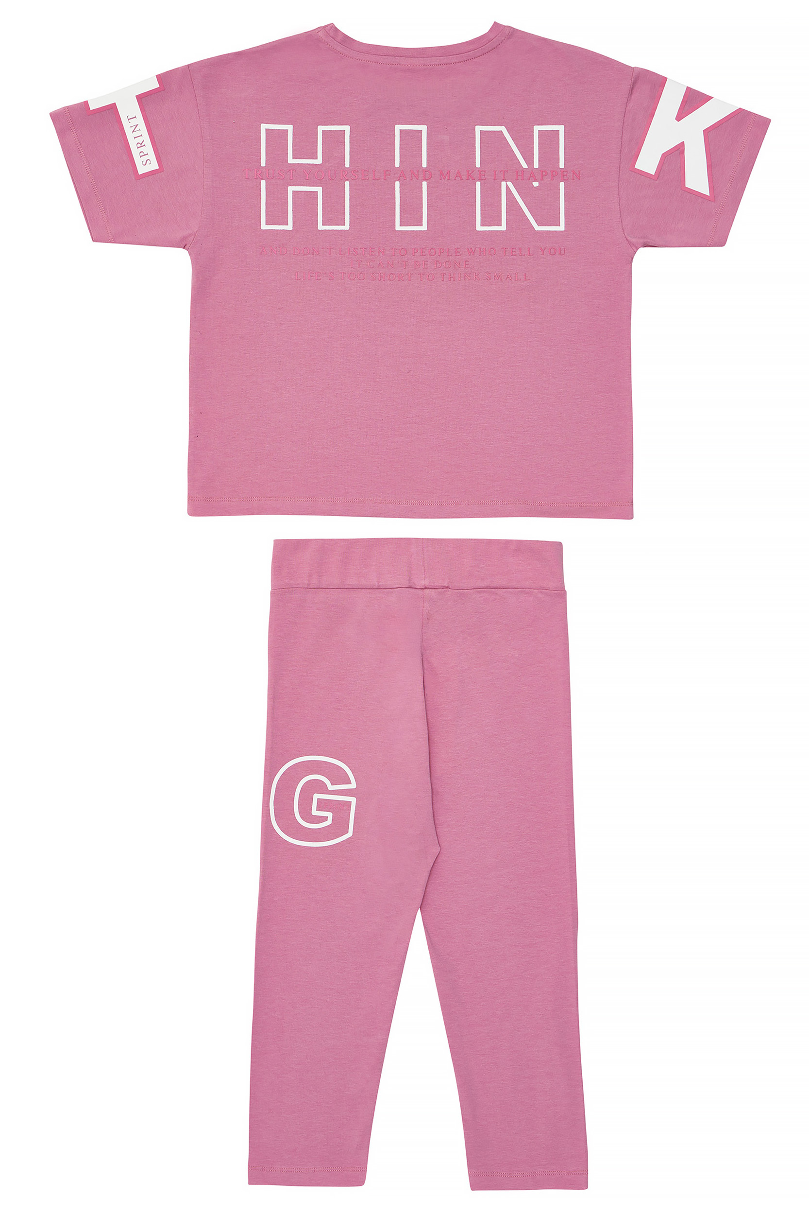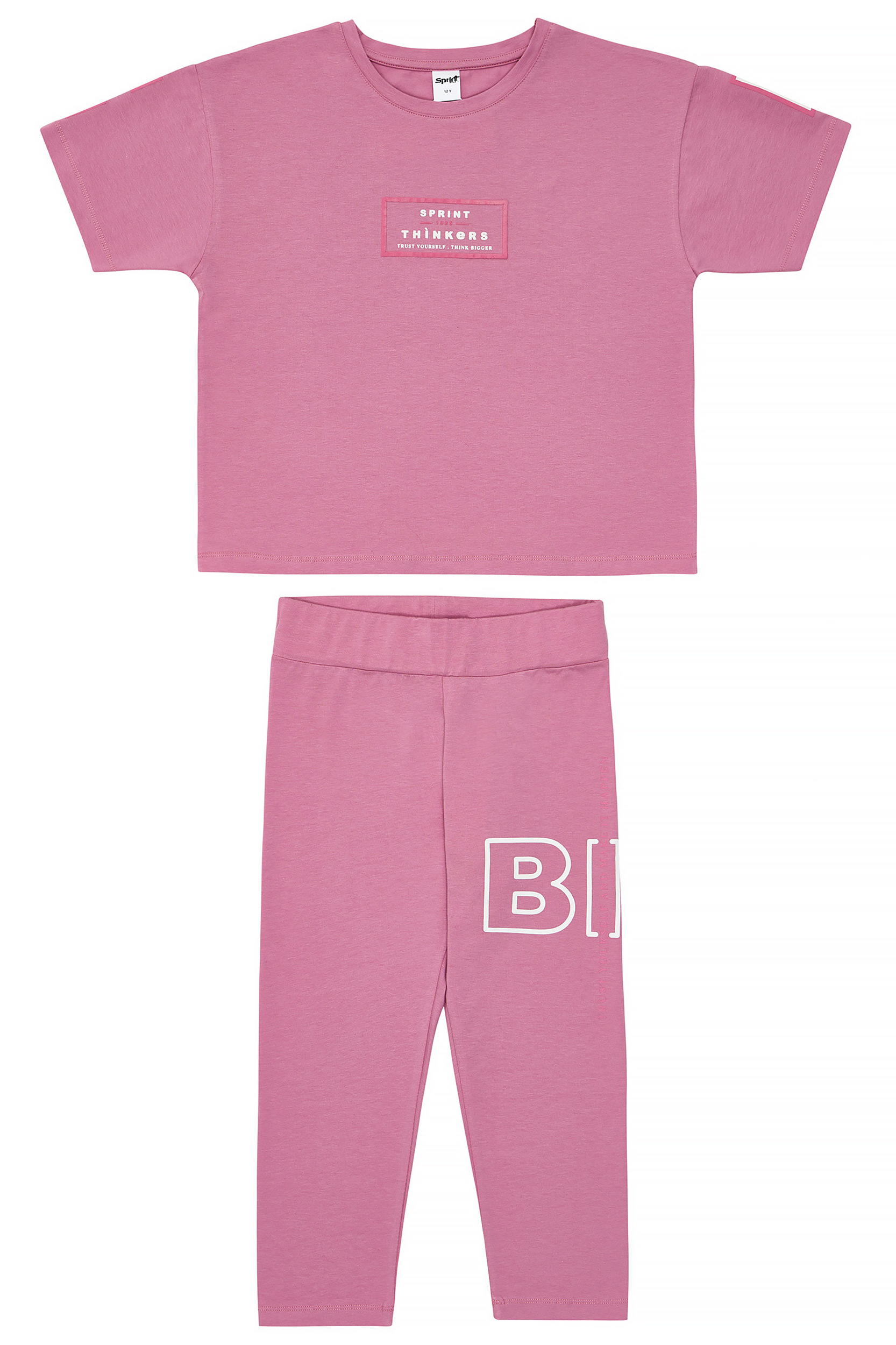 - Children’s set of 2 pieces of lycra. Blouse with “SPRINT THINKERS” logo print on the chest and letters on the sleeves and back with embossed texture. Capri leggings with elastic waistband and print.