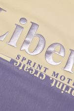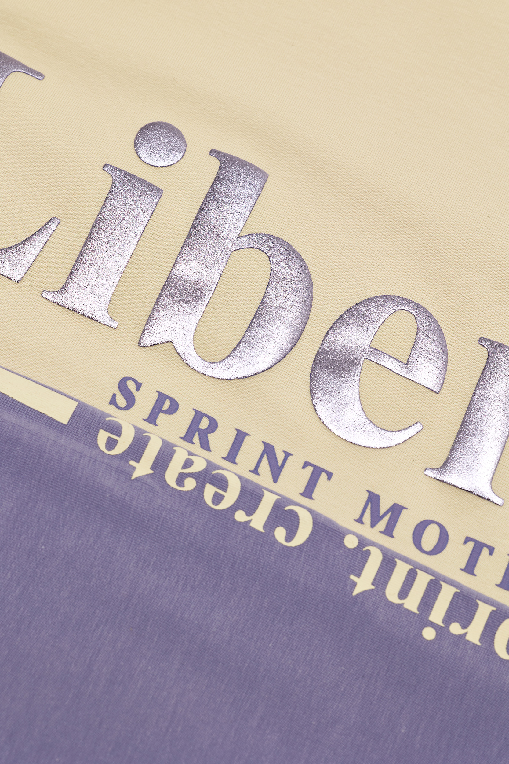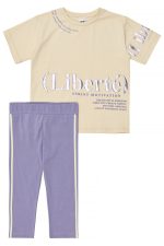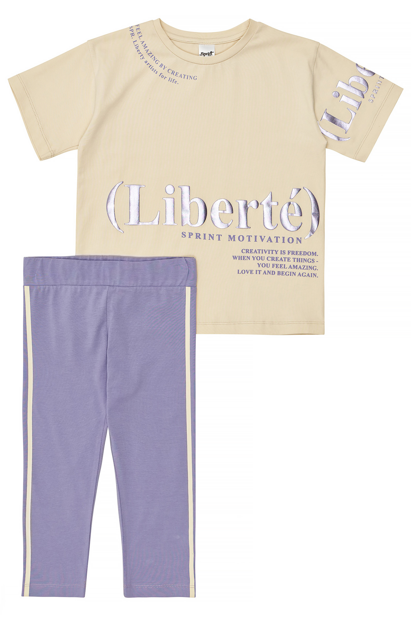 - Children’s set of 2 pieces of lycra. Blouse with embossed metallic print “Liberté” on the front that continues on the back and sleeves. Capri leggings with elastic waistband and thin vertical stripes with print.