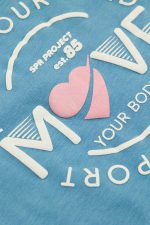 • Children’s set of 2 pieces of lycra. Blouse with embossed circular print “Move Your Body” on the front and perforated heart embroidery on the back. Zip panty shorts with slant pockets and athletic rubber print.