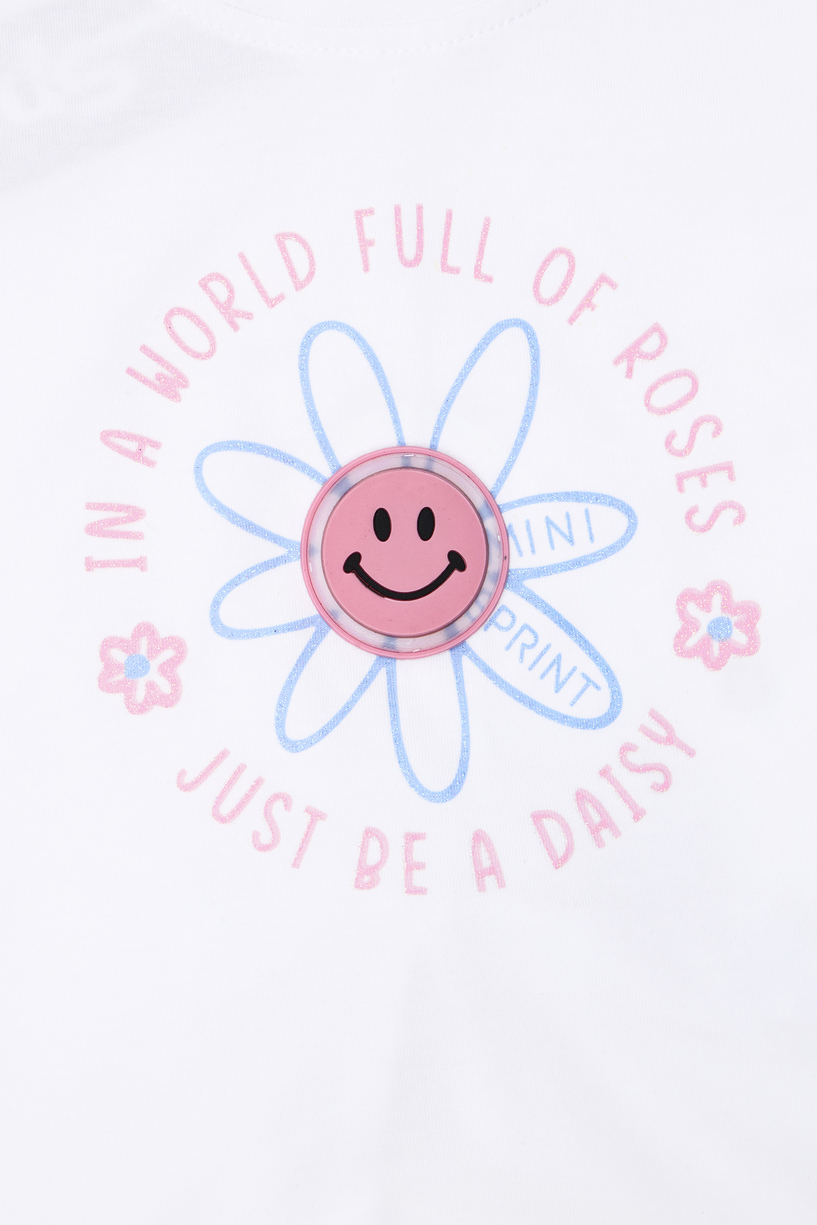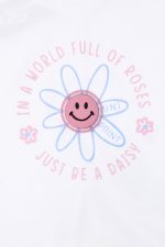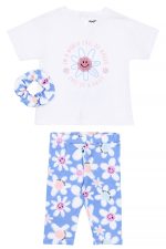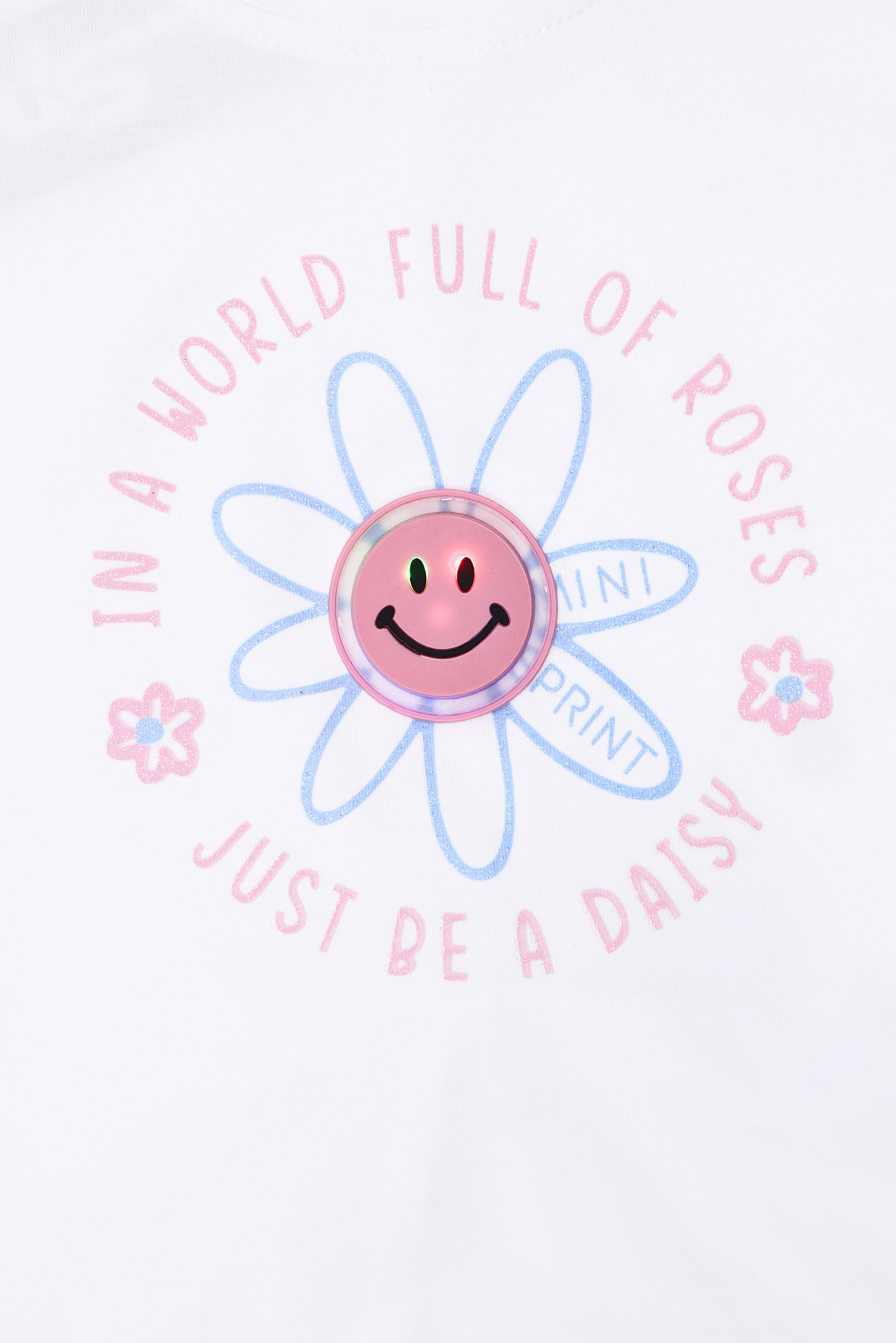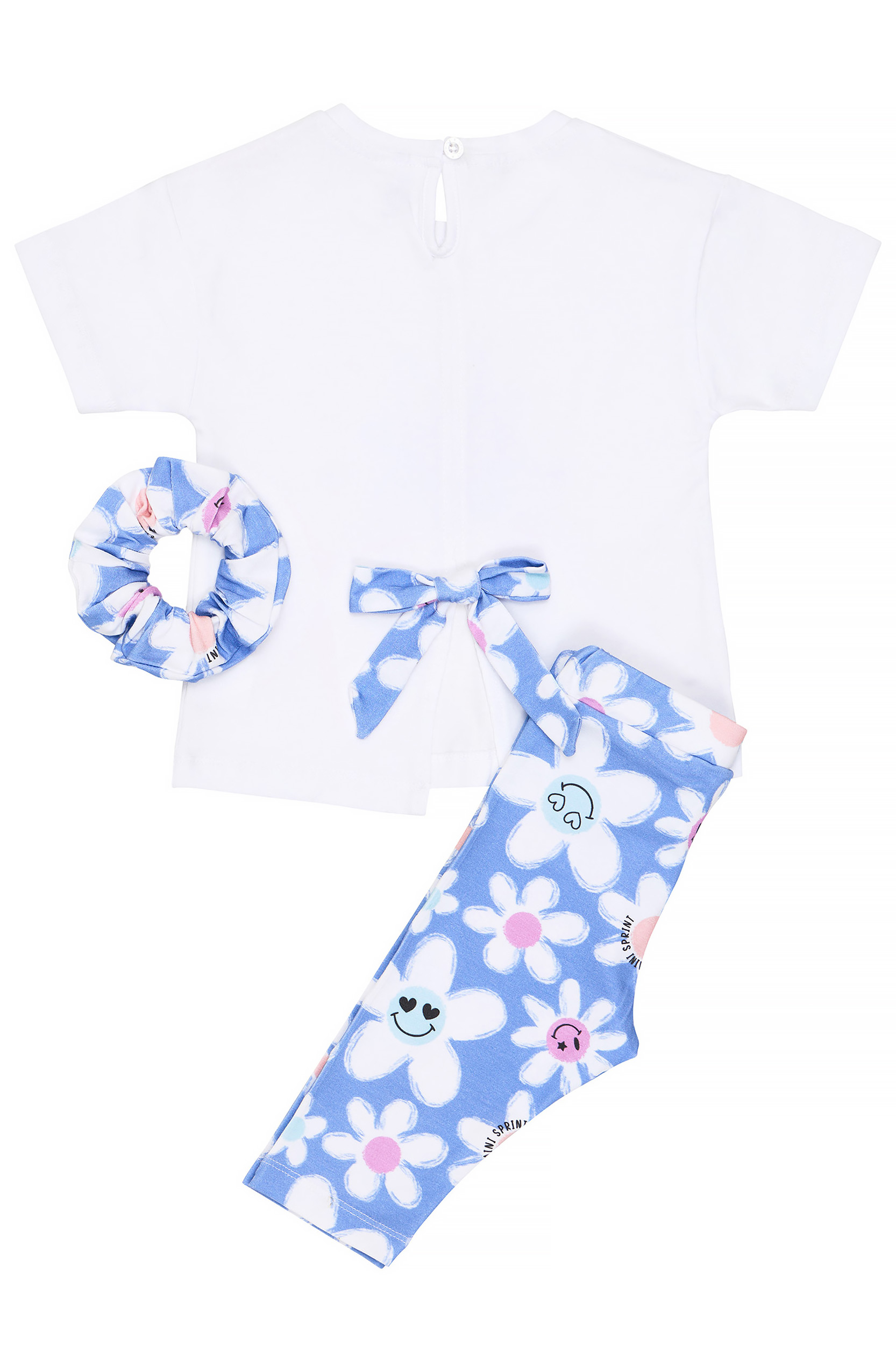 • Set di 2 pezzi in lycra per bambini. Camicetta con stampa frontale di una margherita sorridente con dettagli in glitter di zucchero e luce lampeggiante. Schiena con apertura e fiocco decorativo. Accessorio elastico per capelli. Leggings Capri con elastico in vita e motivo floreale a margherite all-over.