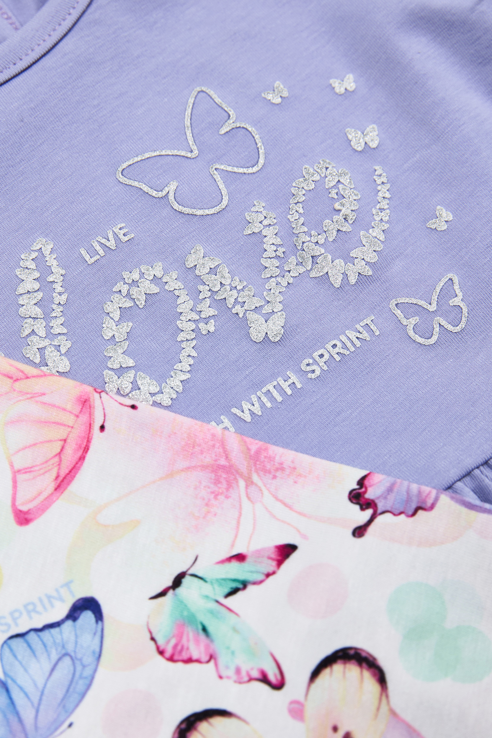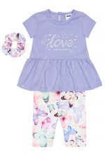 • Set di 2 pezzi in lycra per bambini. Camicetta con volant in vita e stampa love glitter in rilievo con farfalle. Accessorio elastico per capelli. Leggings Capri con elastico in vita e motivo “Farfalle” all-over in tonalità pastello.