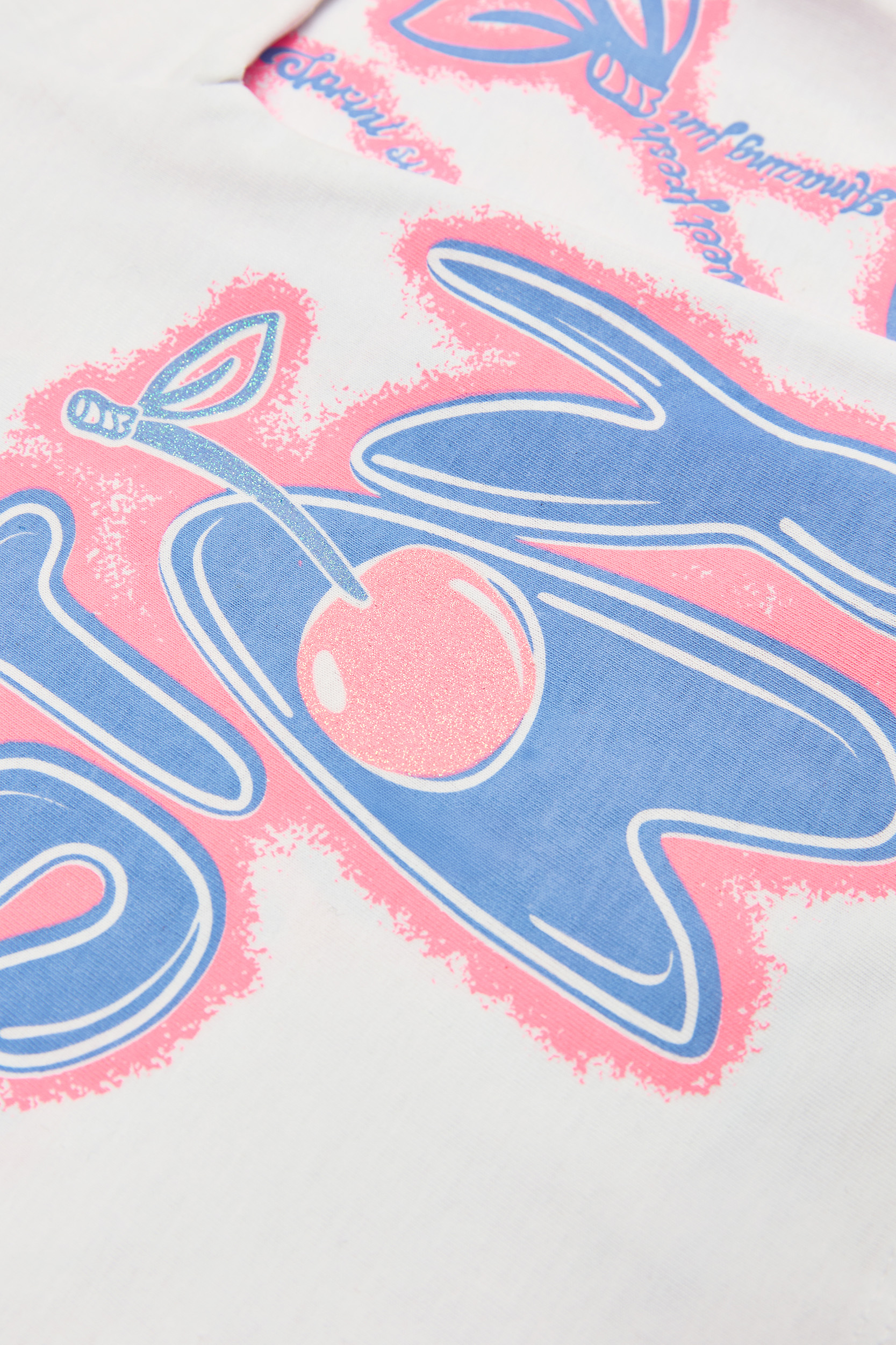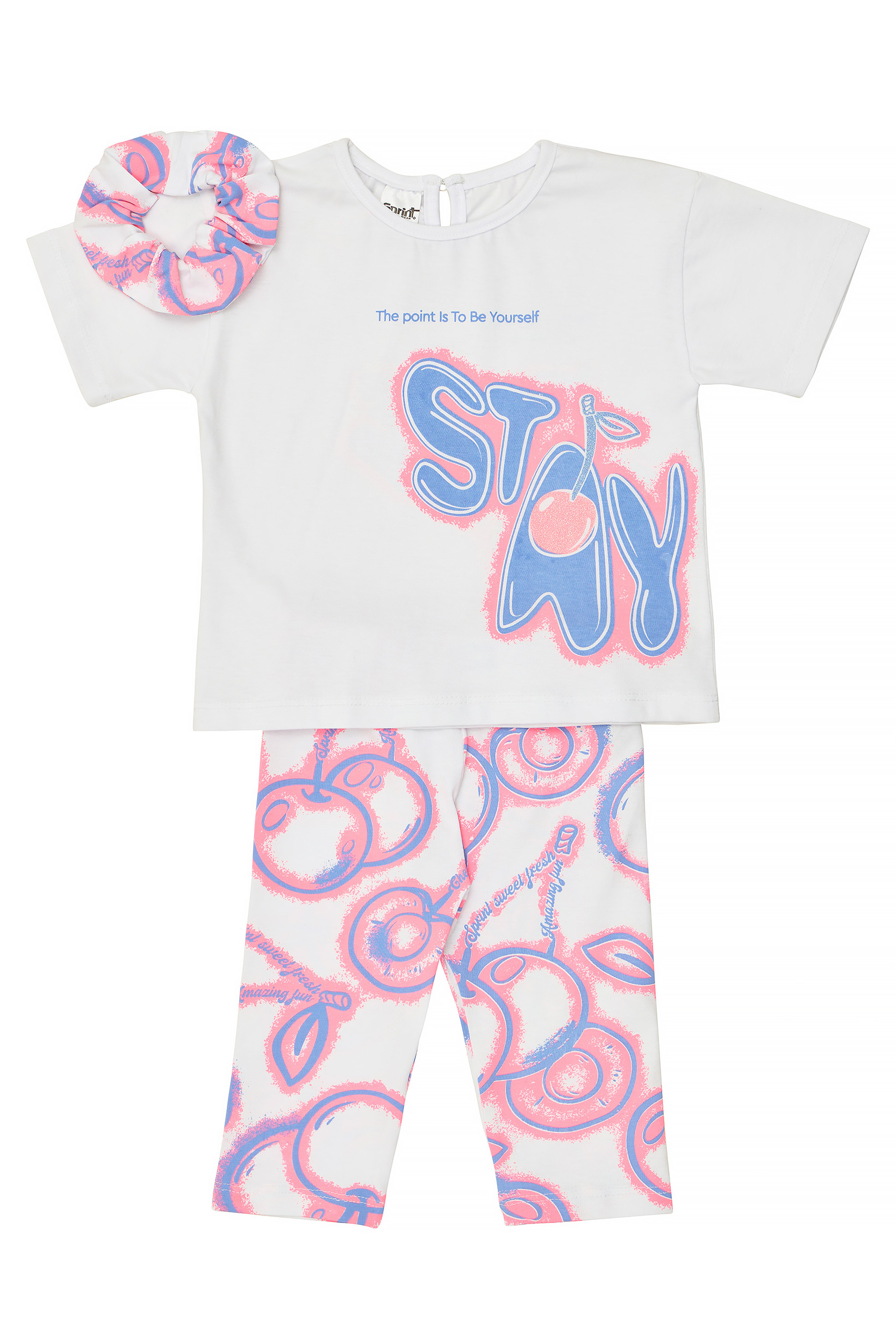 - Set per bambini composto da 2 pezzi di lycra. Camicetta con la scritta “The point is To Be Yourself” stampata sul davanti e sul retro con dettaglio di ciliegie glitterate. Accessorio per capelli con elastico. Leggings Capri con elastico in vita e motivo “Cherries” all-over.