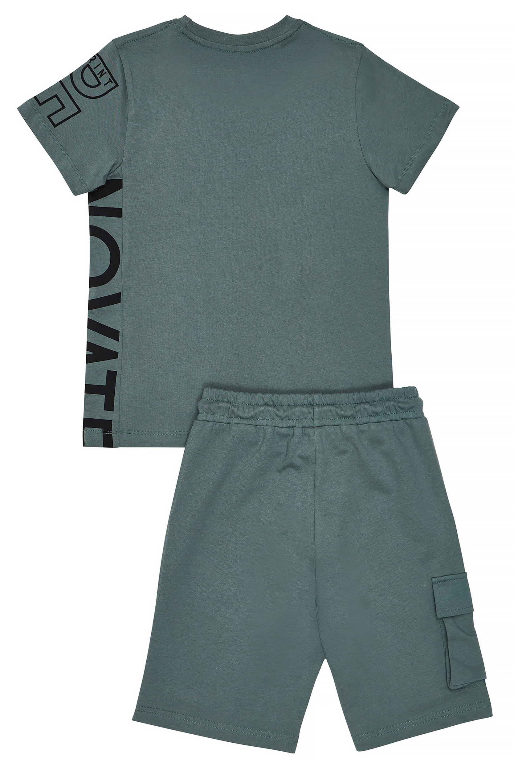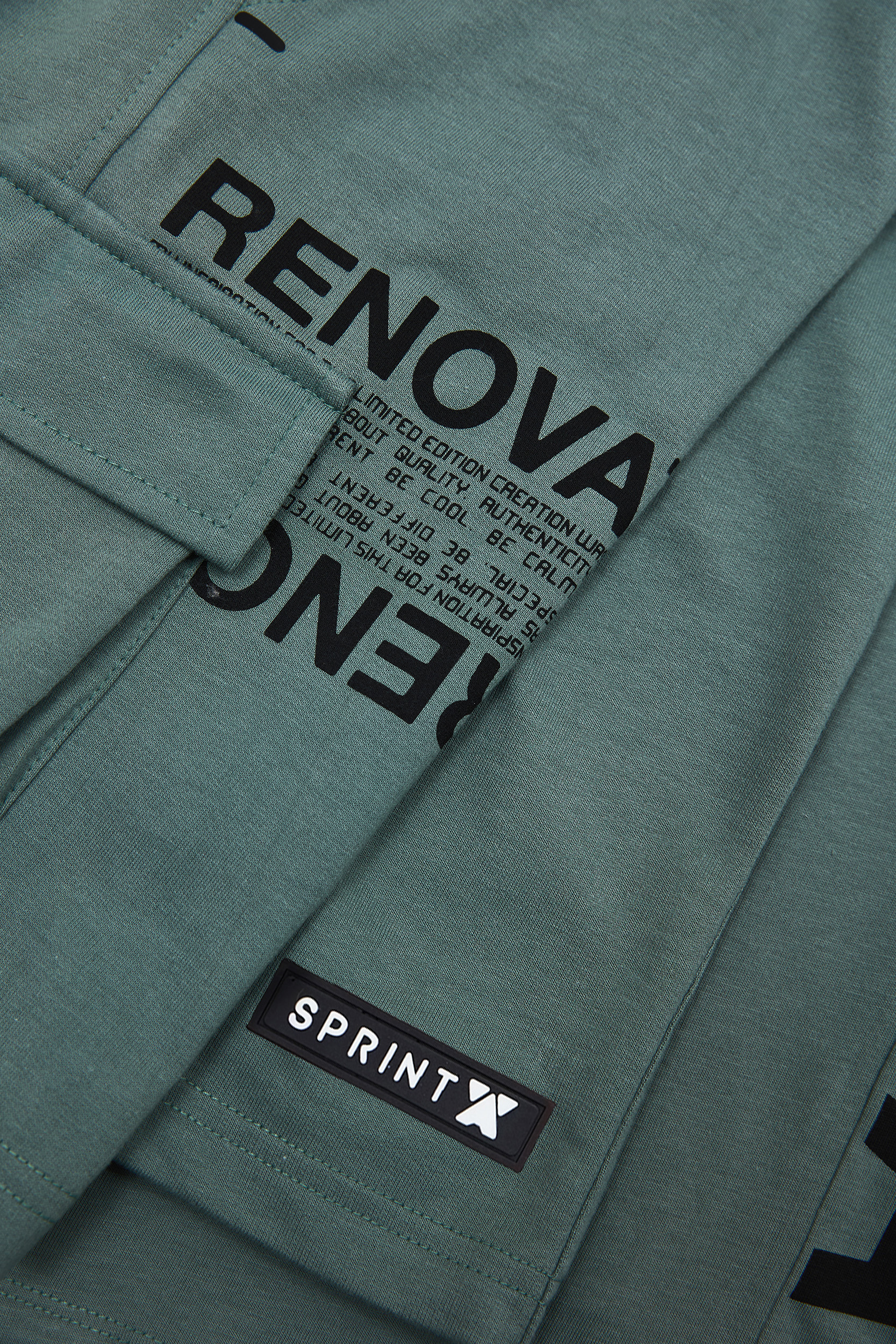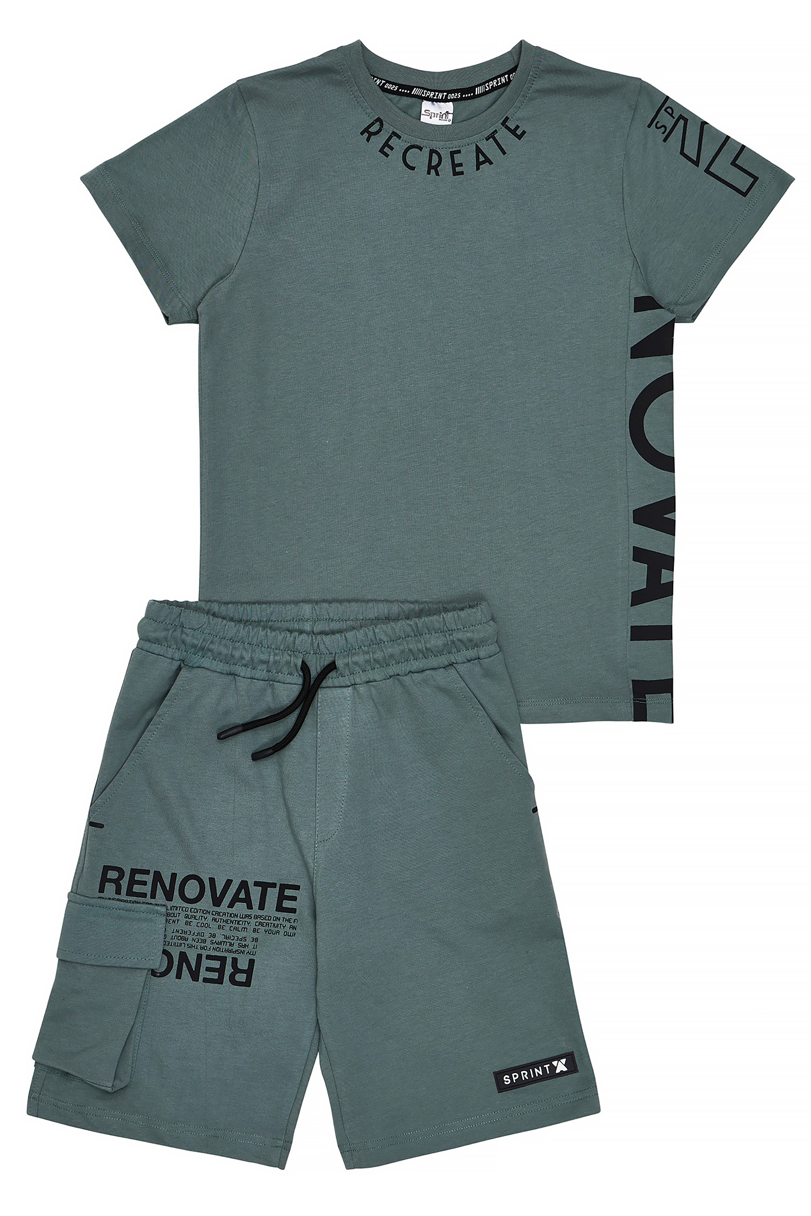 - Set di 2 pezzi per bambini. Camicetta con stampa “RECREATE” e “RENOVATE” sul collo, sul fianco e sulla manica. “RENOVATE” su collo, fianco e manica. Pantaloncini in felpa con elastico in vita e coulisse regolabile, tasche anteriori oblique, tasca cargo laterale con stampa ed etichetta decorativa SPRINT in gomma sul fondo.