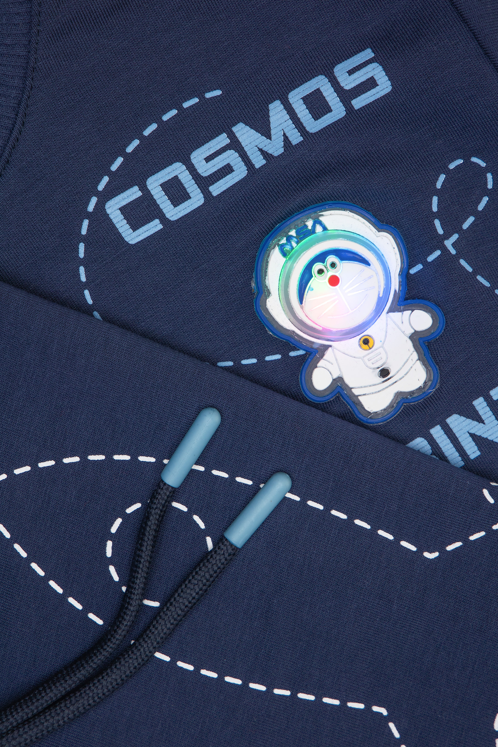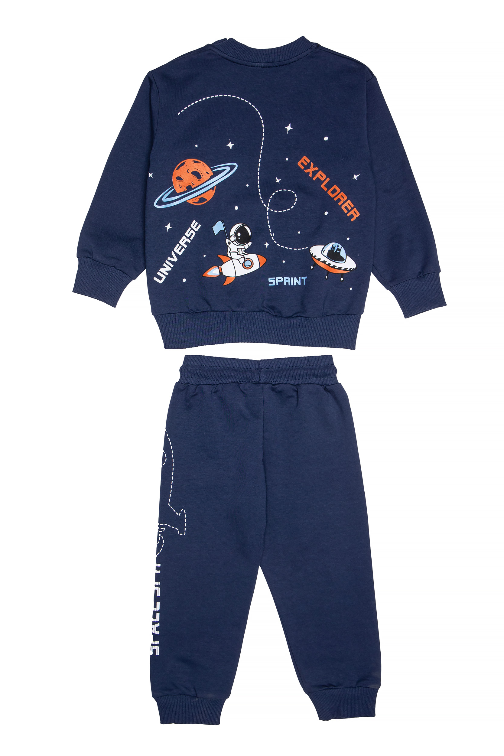• Παιδικό σετ φόρμας 2 τεμαχίων φούτερ χωρίς χνούδι. Μπλούζα με στρογγυλή λαιμόκοψη, τύπωμα μπροστά και στην πλάτη με θέμα SPACE και λαμπάκι που αναβοσβήνει. Παντελόνι με ελαστικό ζωνάρι και ρυθμιζόμενα κορδόνια και τύπωμα διαστημόπλοιο στο πλάι.