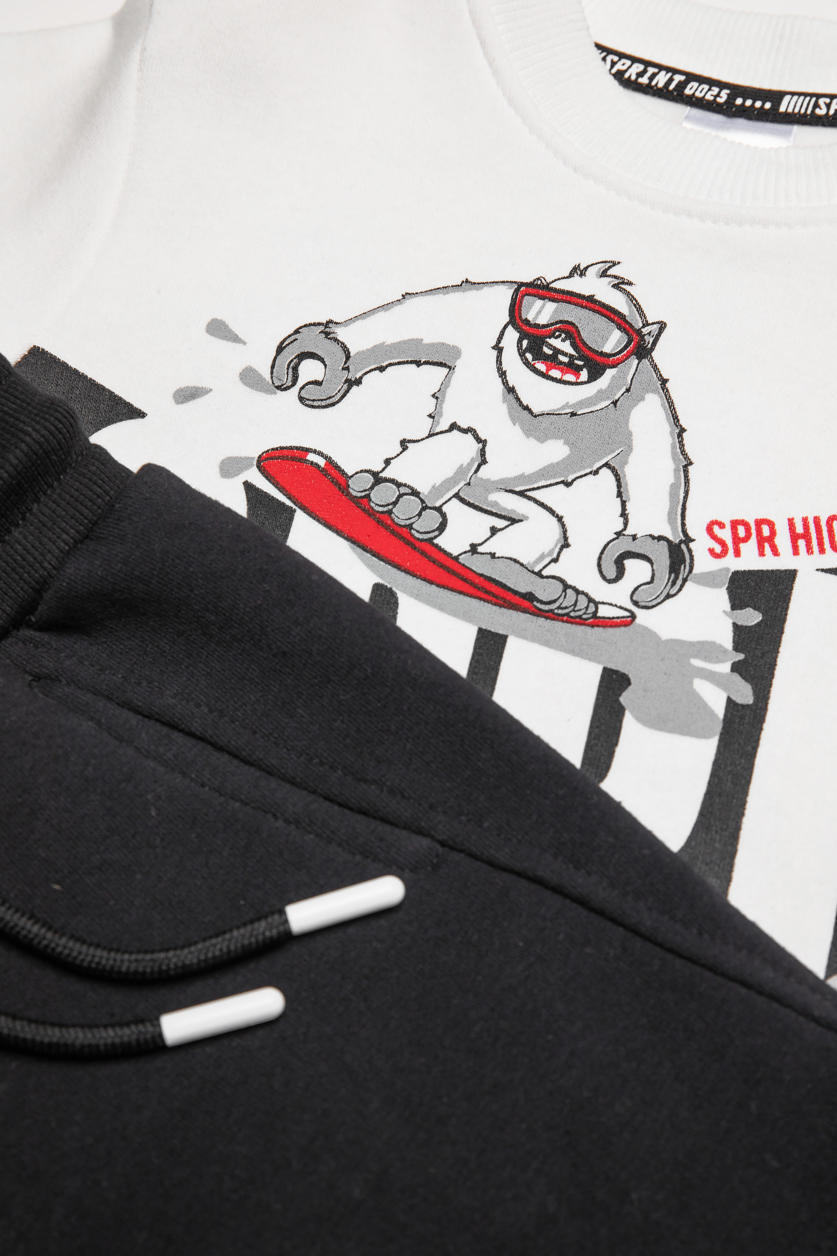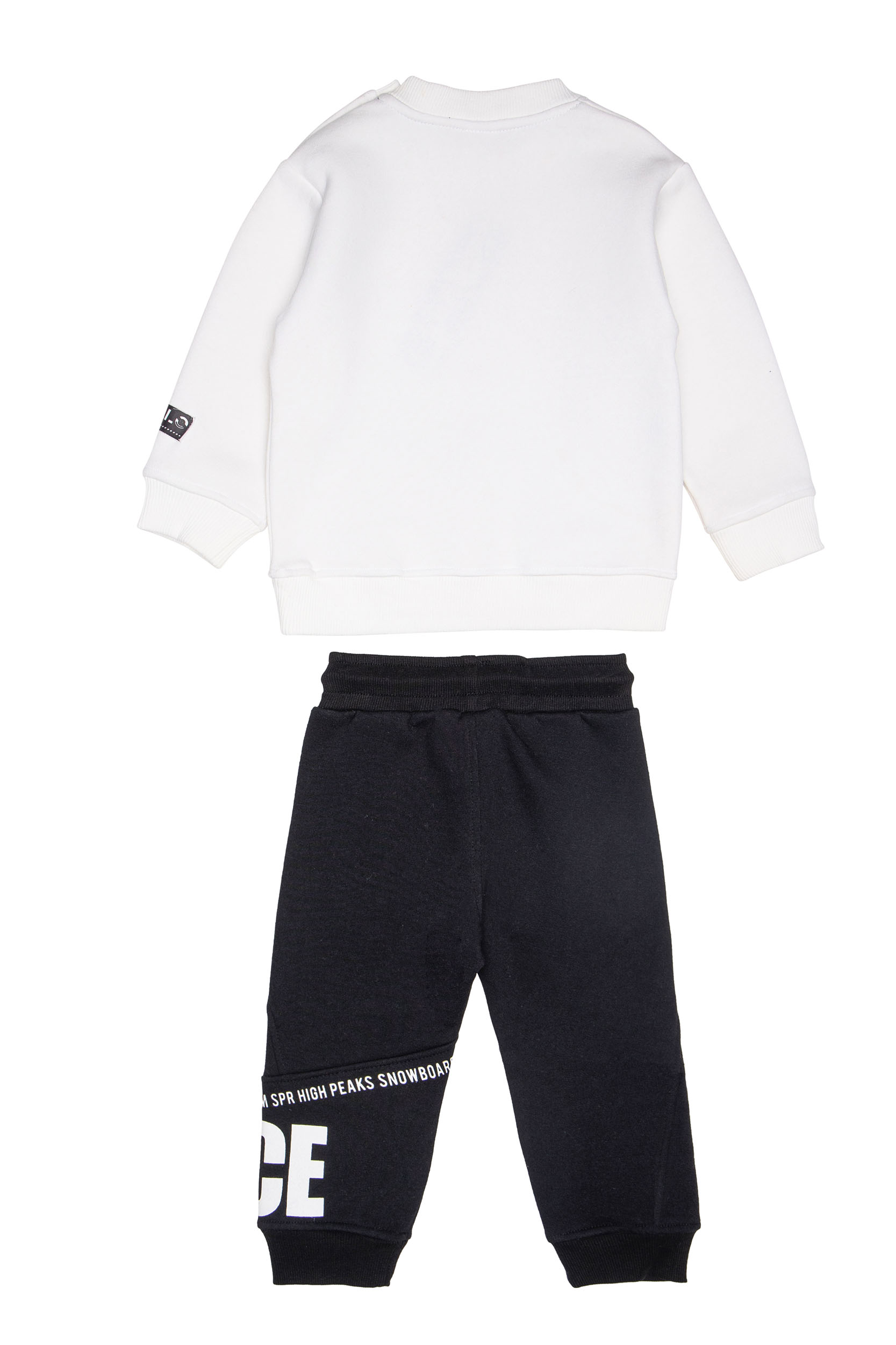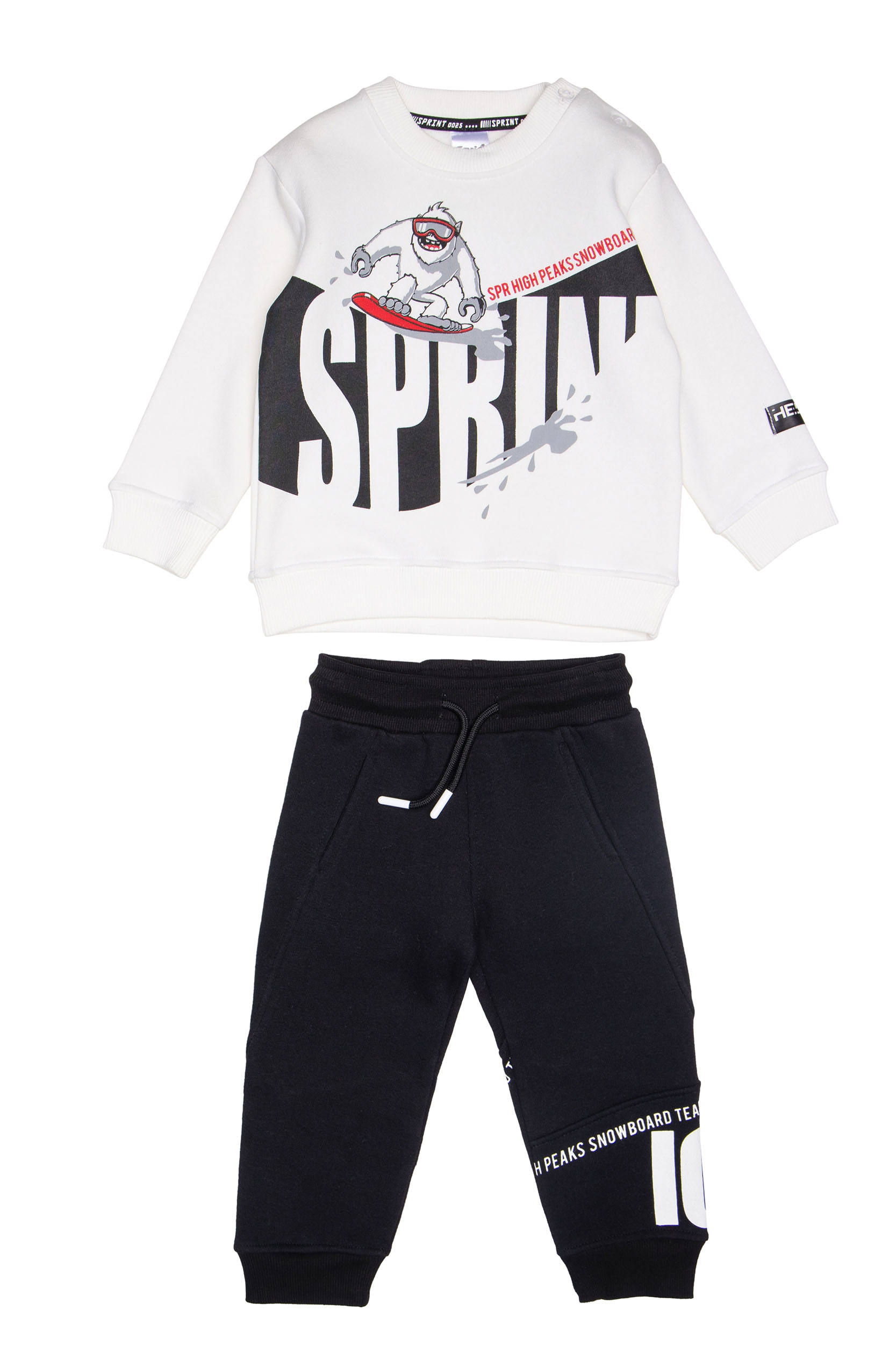 - Παιδικό σετ φόρμας 2 τεμαχίων φούτερ με χνούδι. Μπλούζα με στρογγυλή λαιμόκοψη και τύπωμα εμπρός με θέμα SNOWBOARD και παντελόνι με ελαστικό ζωνάρι με ρυθμιζόμενα κορδόνια. Πλαϊνές τσέπες και τύπωμα στο κάτω μέρος.