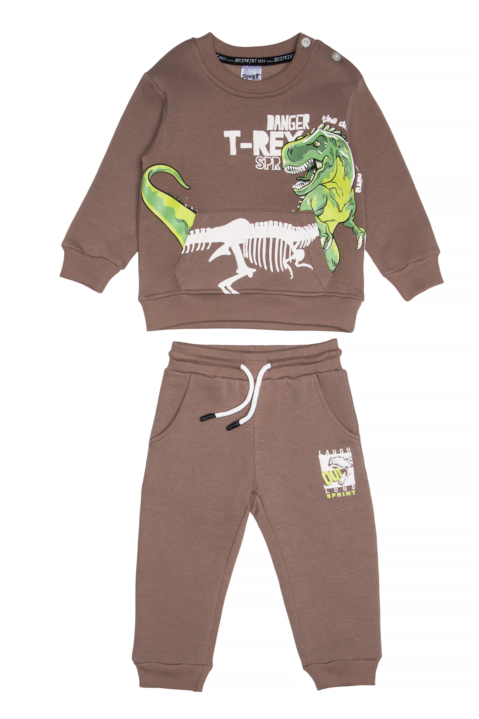 - Παιδικό σετ φόρμας 2 τεμαχίων φούτερ με χνούδι. Μπλούζα με στρογγυλή λαιμόκοψη, τύπωμα εμπρός με ανάγλυφη υφή και θέμα DINOSAUR με τυπωμένη τσέπη. Παντελόνι με ελαστικό ζωνάρι και ρυθμιζόμενα κορδόνια, μπροστινές λοξές τσέπες και τύπωμα εμπρός.