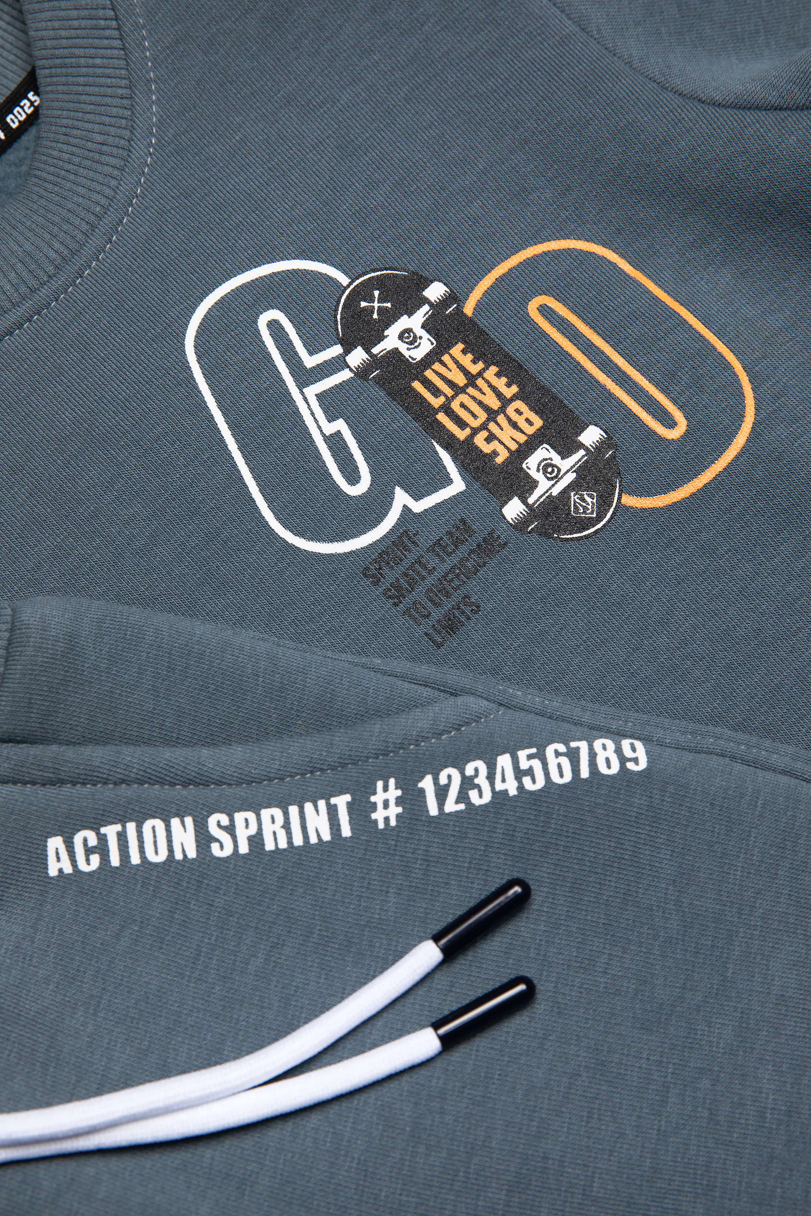 - Παιδικό σετ φόρμας 2 τεμαχίων φούτερ με χνούδι. Μπλούζα με στρογγυλή λαιμόκοψη, τύπωμα μπροστά, στα μανίκια και στην πλάτη με θέμα SKATE. Παντελόνι με ελαστικό ζωνάρι και ρυθμιζόμενα κορδόνια, μπροστινές λοξές τσέπες με τύπωμα.