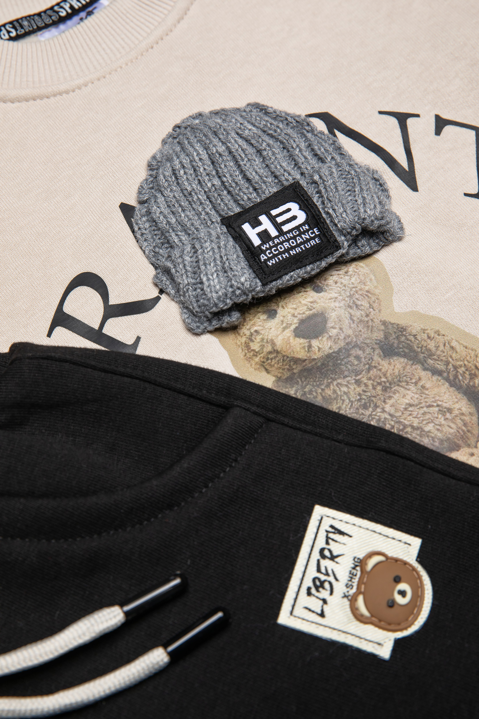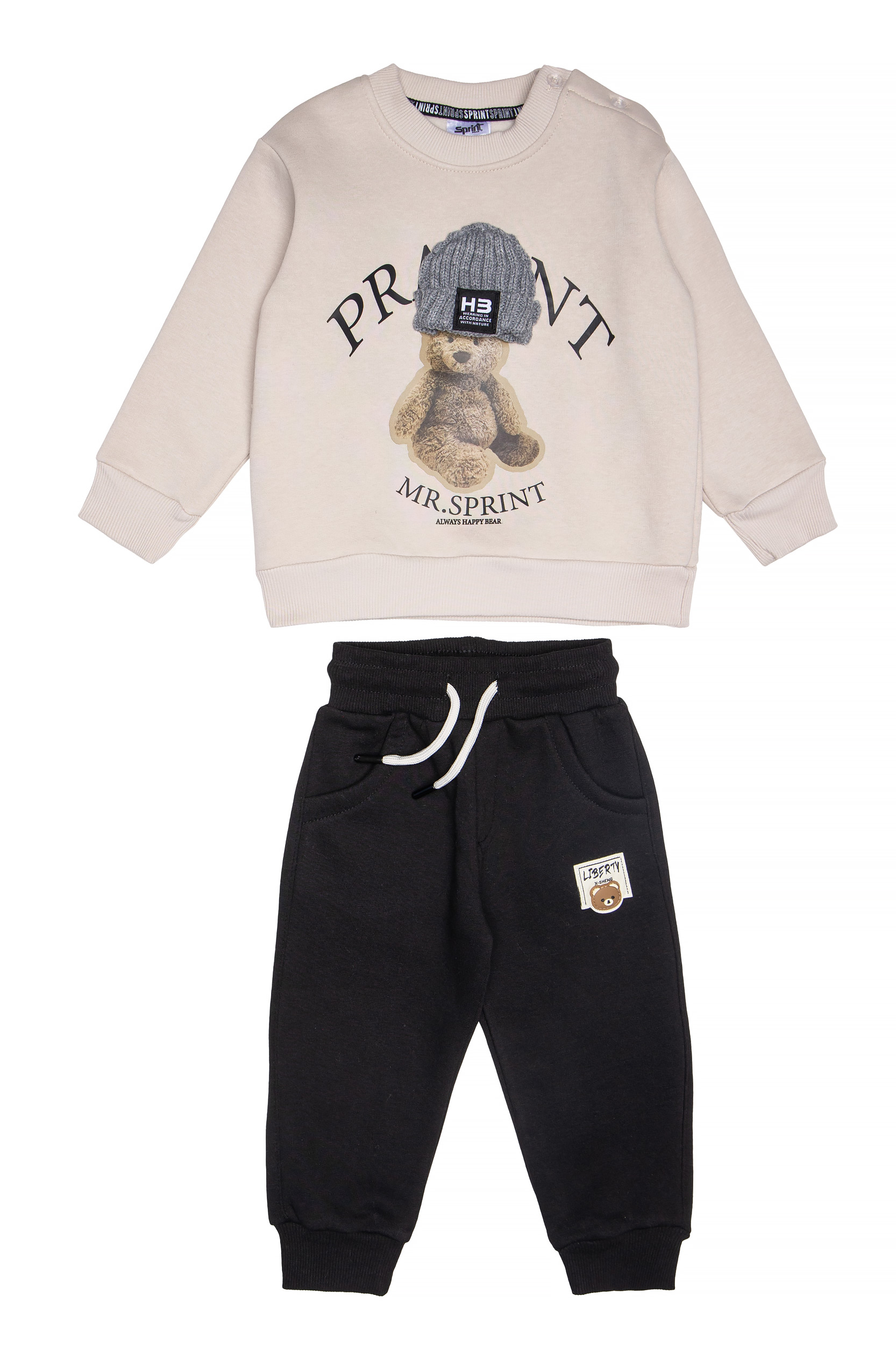 • Παιδικό σετ φόρμας 2 τεμαχίων φούτερ με χνούδι. Μπλούζα με στρογγυλή λαιμόκοψη, τύπωμα εμπρός με θέμα MR. SPRINT BEAR και πλεκτό απλικέ μάλλινο σκουφάκι. Παντελόνι με ελαστικό ζωνάρι και ρυθμιζόμενα κορδόνια με μπροστινές στρογγυλές τσέπες και ετικέτα.