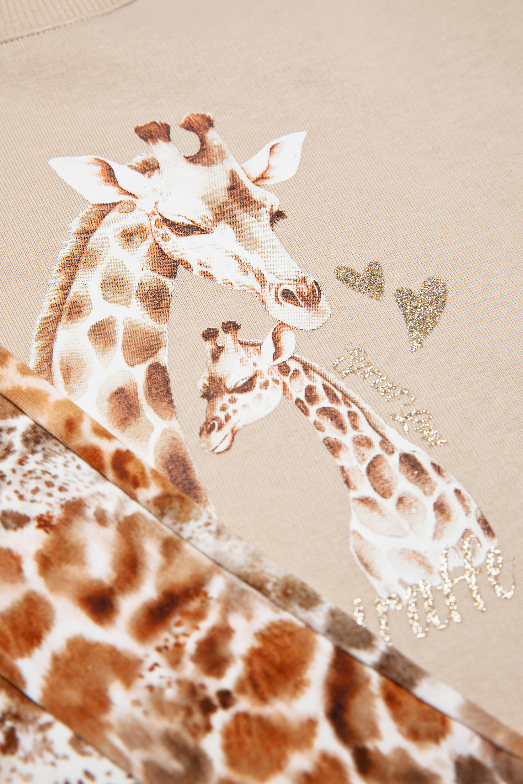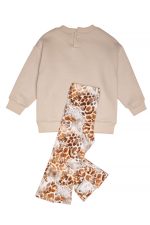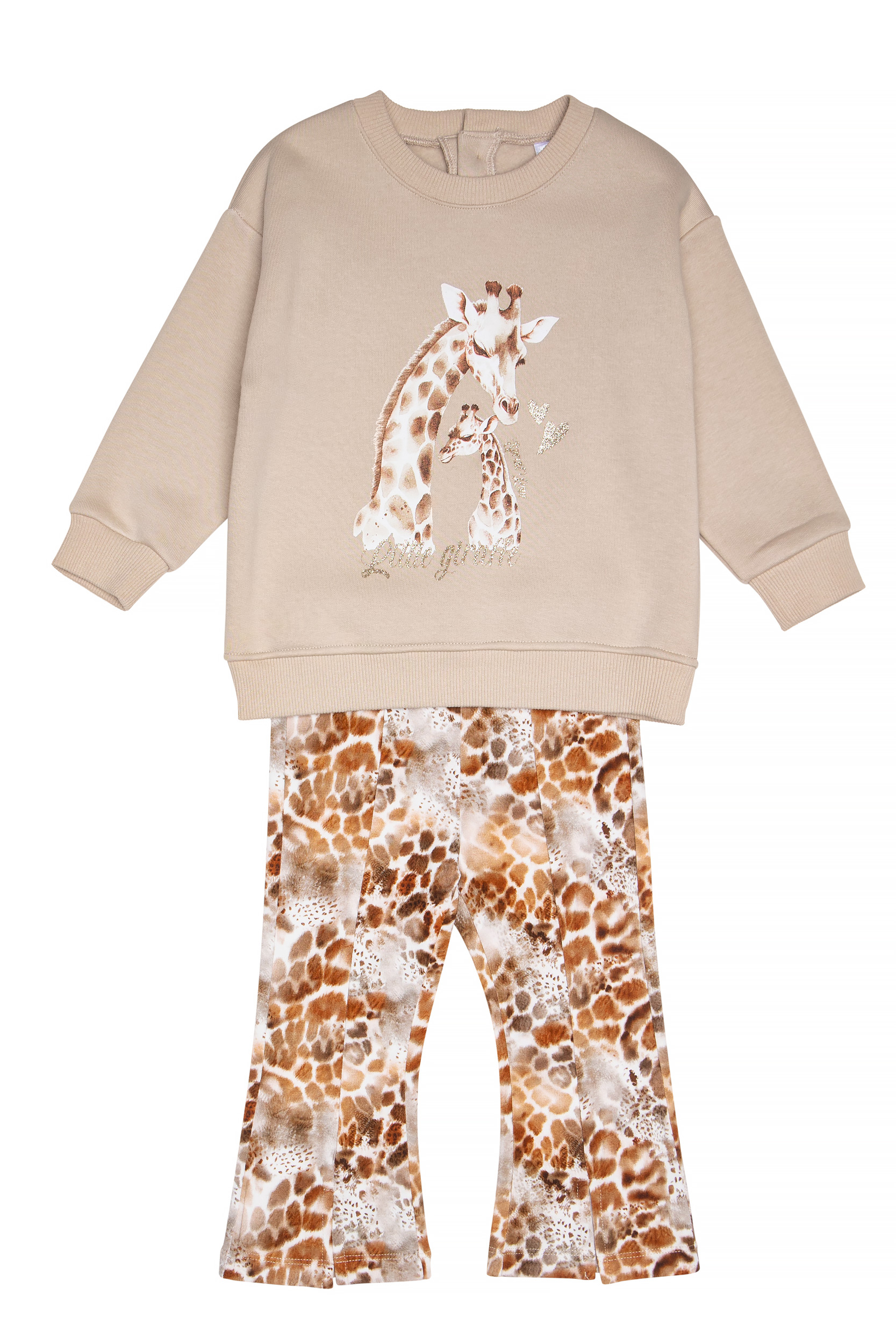 - Παιδικό σετ 2 τεμαχίων. Μπλούζα φούτερ με χνούδι και στρογγυλή λαιμόκοψη, με τύπωμα εμπρός καμηλοπάρδαλη και gold glitter. Κολάν λύκρα animal print τύπου καμπάνα με ανοίγματα.