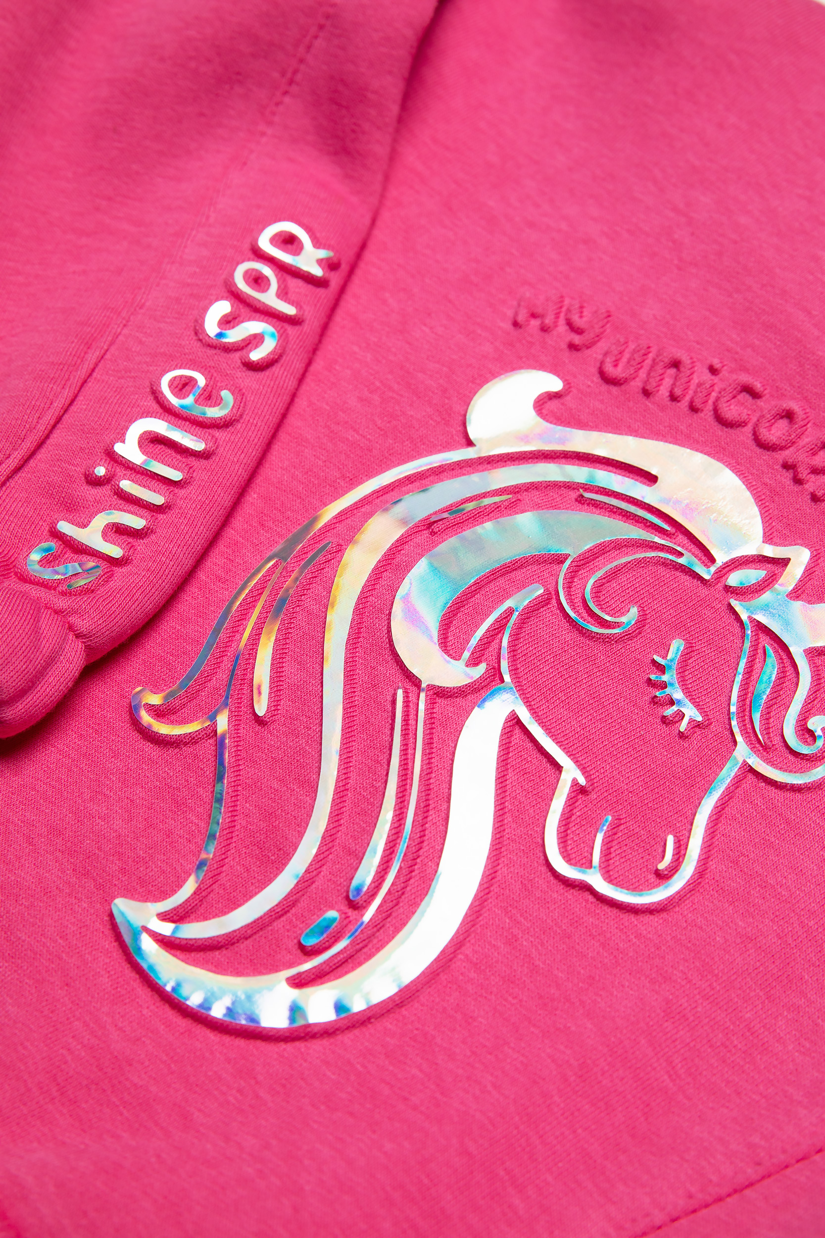 - Παιδικό σετ φόρμας 2 τεμαχίων φούτερ με χνούδι. Μπλούζα με στρογγυλή λαιμόκοψη, τύπωμα εμπρός ιριδίζον με ανάγλυφη υφή και θέμα UNICORN. Παντελόνι με ελαστικό ζωνάρι και ρυθμιζόμενα κορδόνια με μπροστινές λοξές τσέπες και ιριδίζον ανάγλυφο τύπωμα.