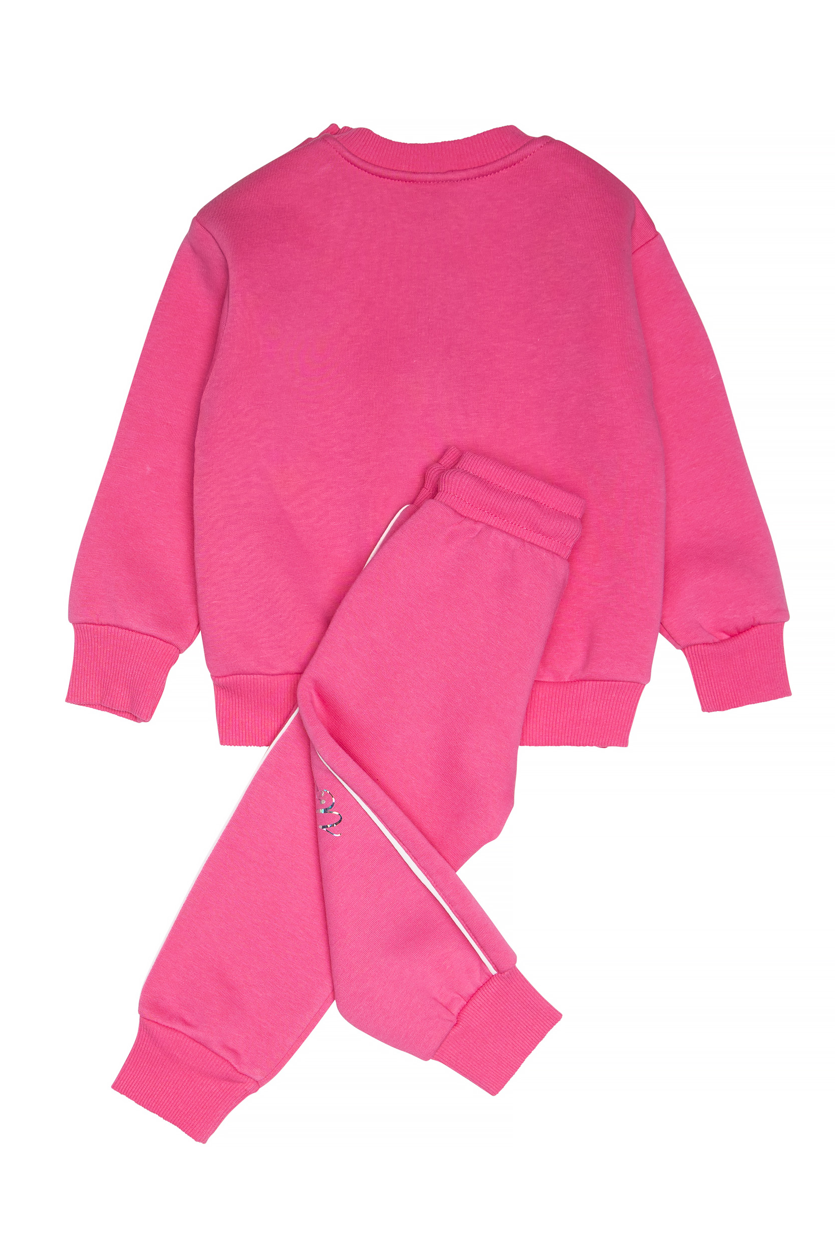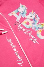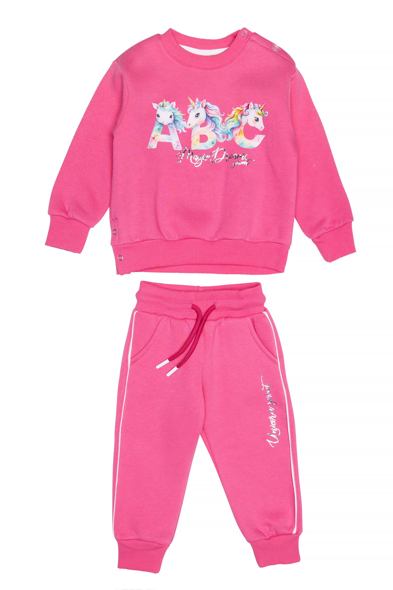 - Παιδικό σετ φόρμας 2 τεμαχίων φούτερ με χνούδι. Μπλούζα με στρογγυλή λαιμόκοψη και τύπωμα UNICORNS με ιριδίζον γράμματα και άνοιγμα με τρούκ στο πλάι. Παντελόνι με ελαστικό ζωνάρι και ρυθμιζόμενα κορδόνια με μπροστινές λοξές τσέπες, δίχρωμα ρέλια στο πλάι και ιριδίζον τύπωμα.