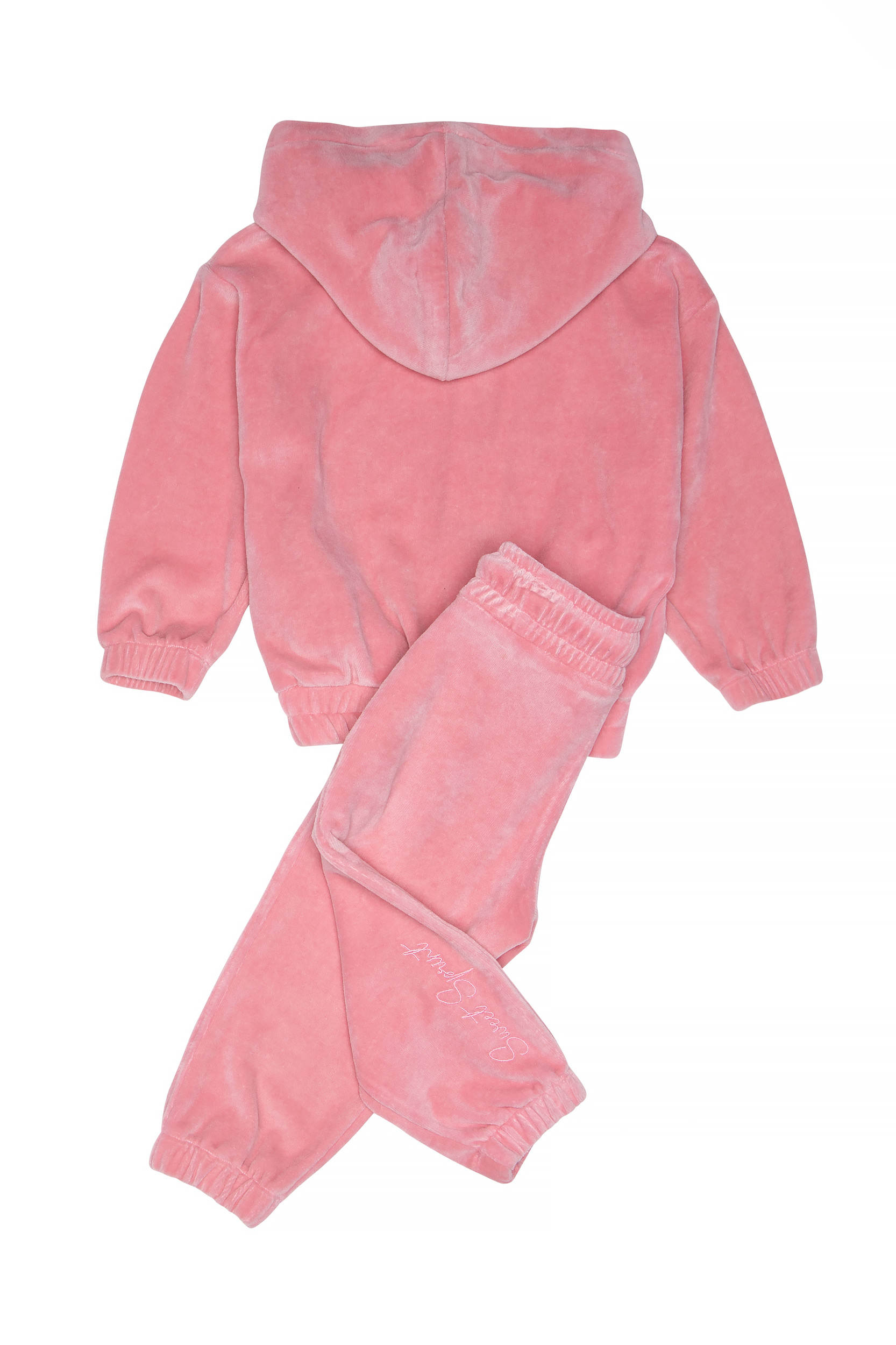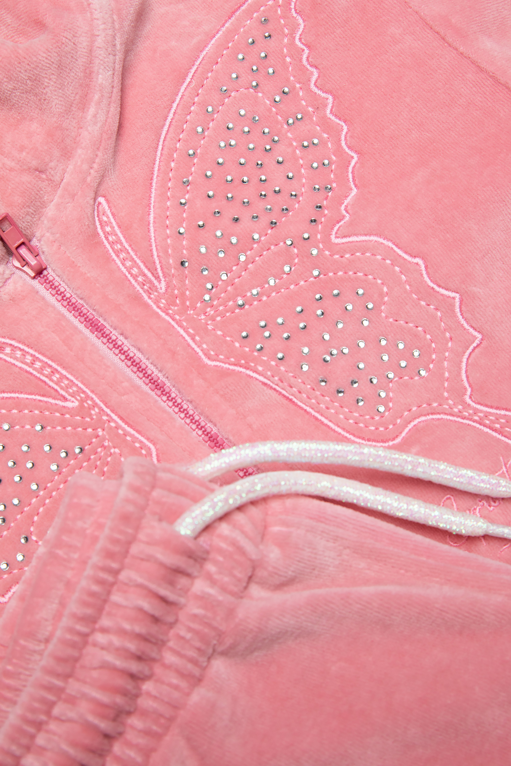 - Παιδικό σετ 2 τεμαχίων βελουτέ. Ζακέτα με κουκούλα, κλείσιμο με φερμουάρ στο μπροστινό μέρος και τσέπες στο πλάι. Κέντημα πεταλούδα με στρας. Παντελόνι με ελαστικό ζωνάρι και ρυθμιζόμενα κορδόνια, πλαϊνές τσέπες και κέντημα.