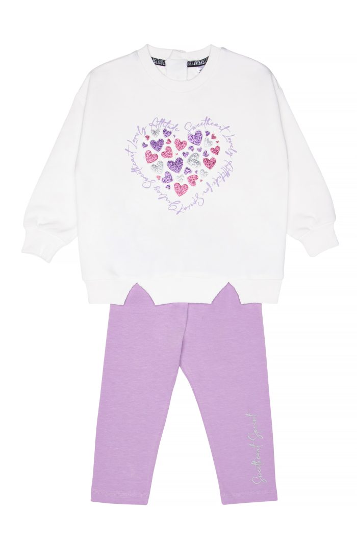 - Παιδικό σετ 2 τεμαχίων. Μπλούζα φούτερ χωρίς χνούδι με στρογγυλή λαιμόκοψη και τύπωμα glitter καρδιές με ανάγλυφη υφή. Κολάν με ελαστικό ζωνάρι και τύπωμα.