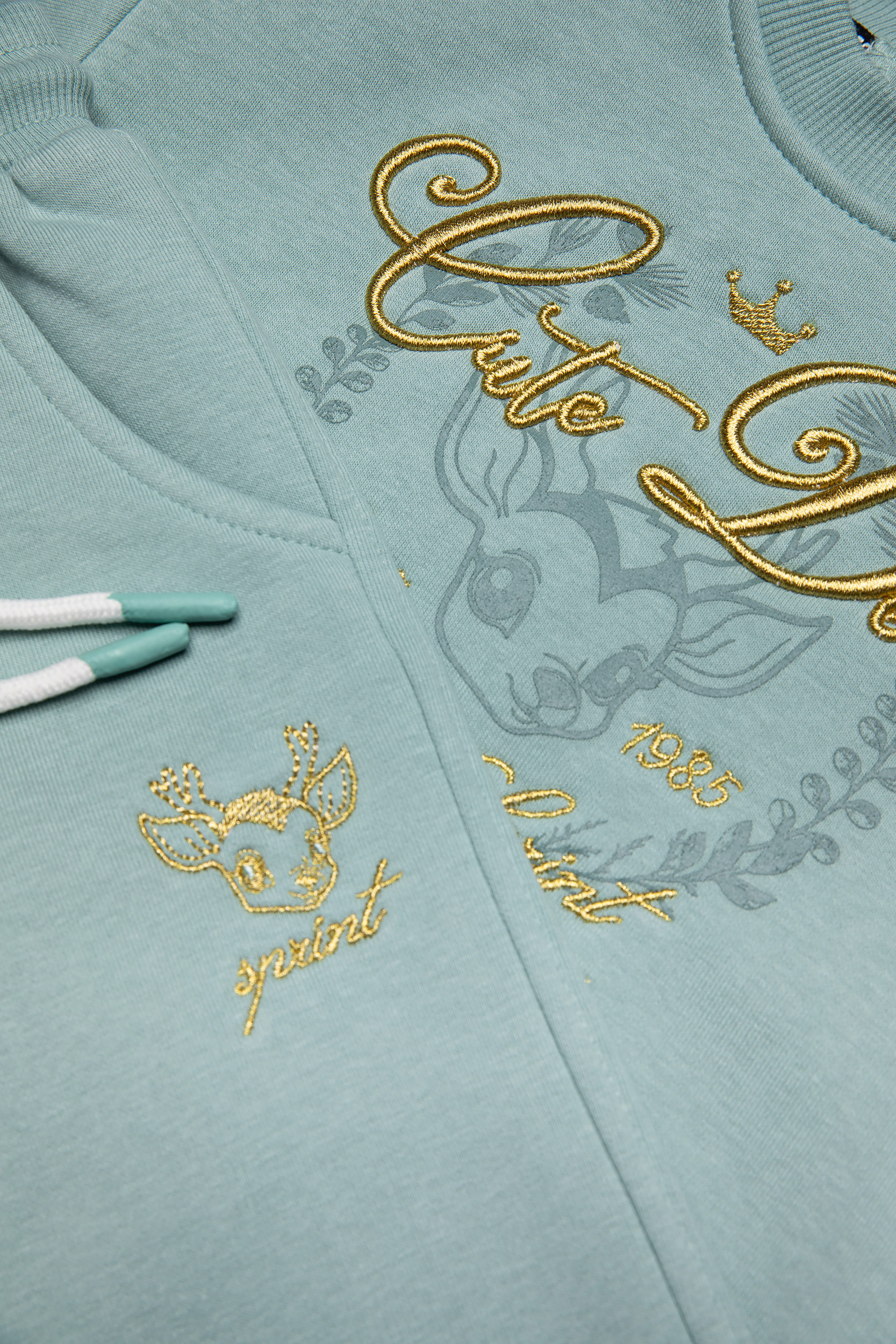 - Παιδικό σετ φόρμας 2 τεμαχίων φούτερ με χνούδι. Μπλούζα με στρογγυλή λαιμόκοψη, τύπωμα και gold κέντημα με ανάγλυφη υφή. Παντελόνι με ελαστικό ζωνάρι και ρυθμιζόμενα κορδόνια με μπροστινές λοξές τσέπες και κέντημα.