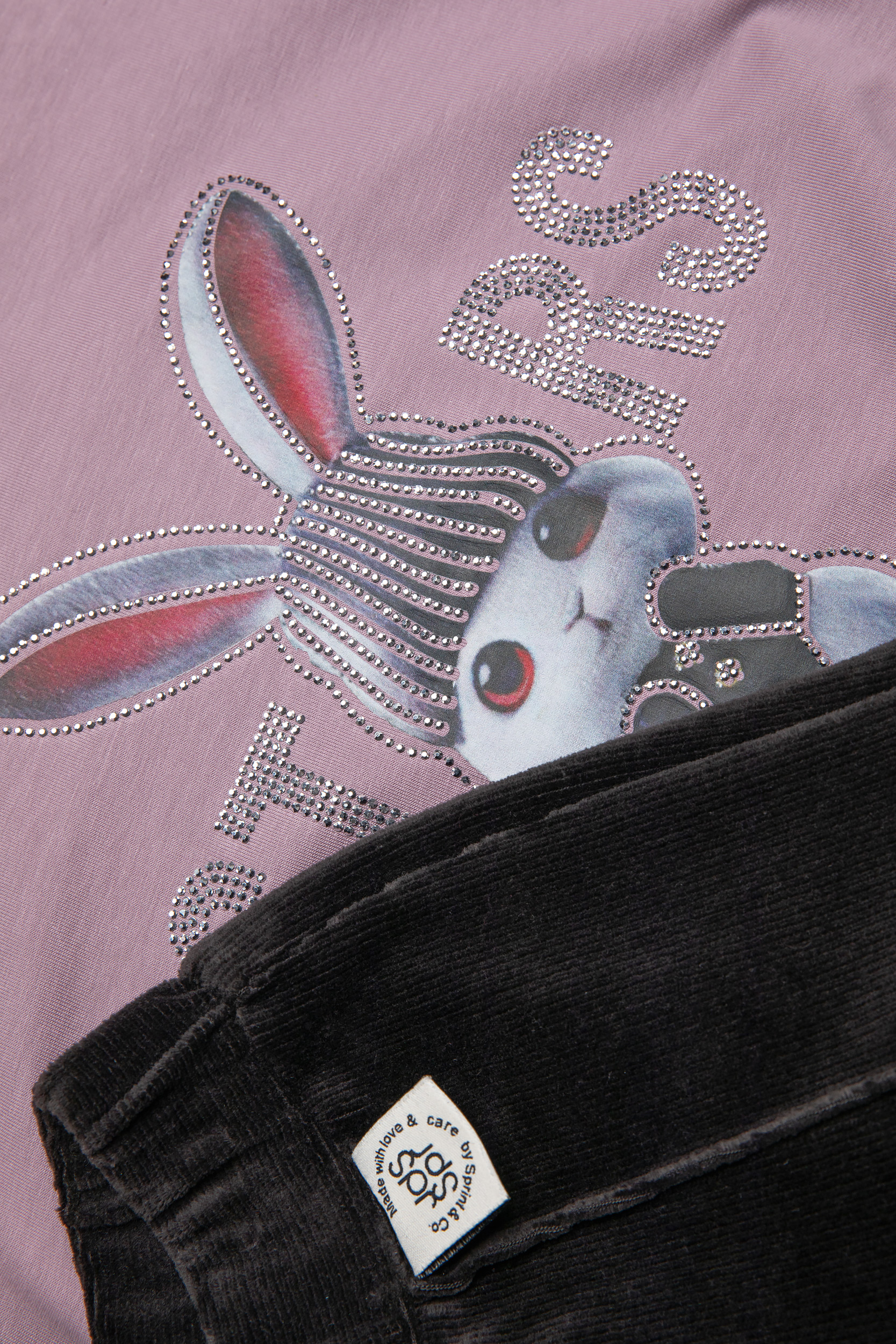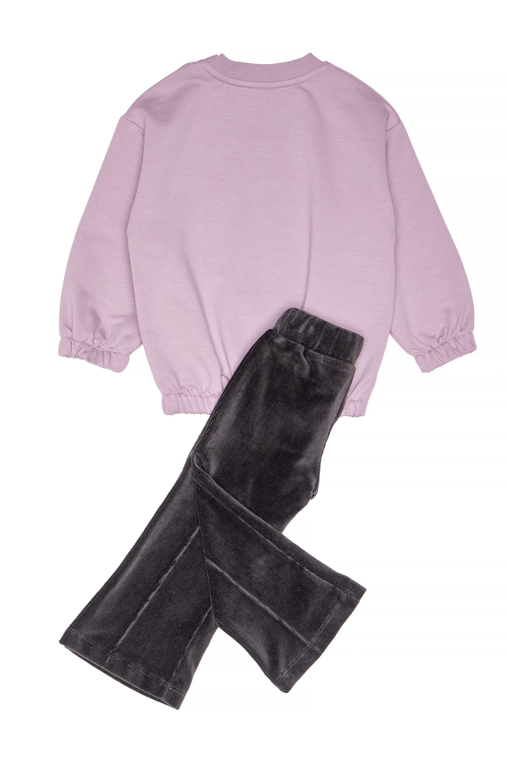 • Παιδικό σετ 2 τεμαχίων. Μπλούζα φούτερ χωρίς χνούδι με στρογγυλή λαιμόκοψη και τύπωμα εμπρός BUNNY με στρας. Κολάν βελουτέ κοτλέ τύπου καμπάνα.