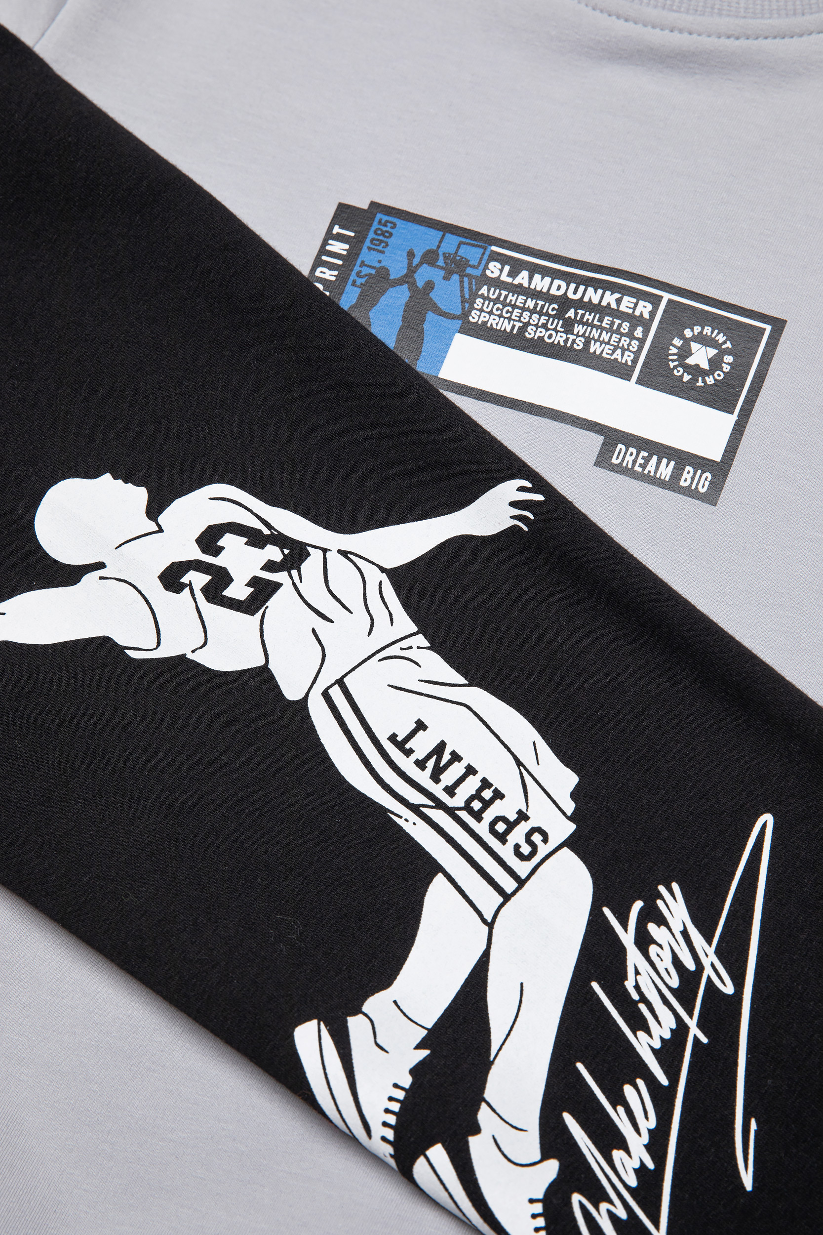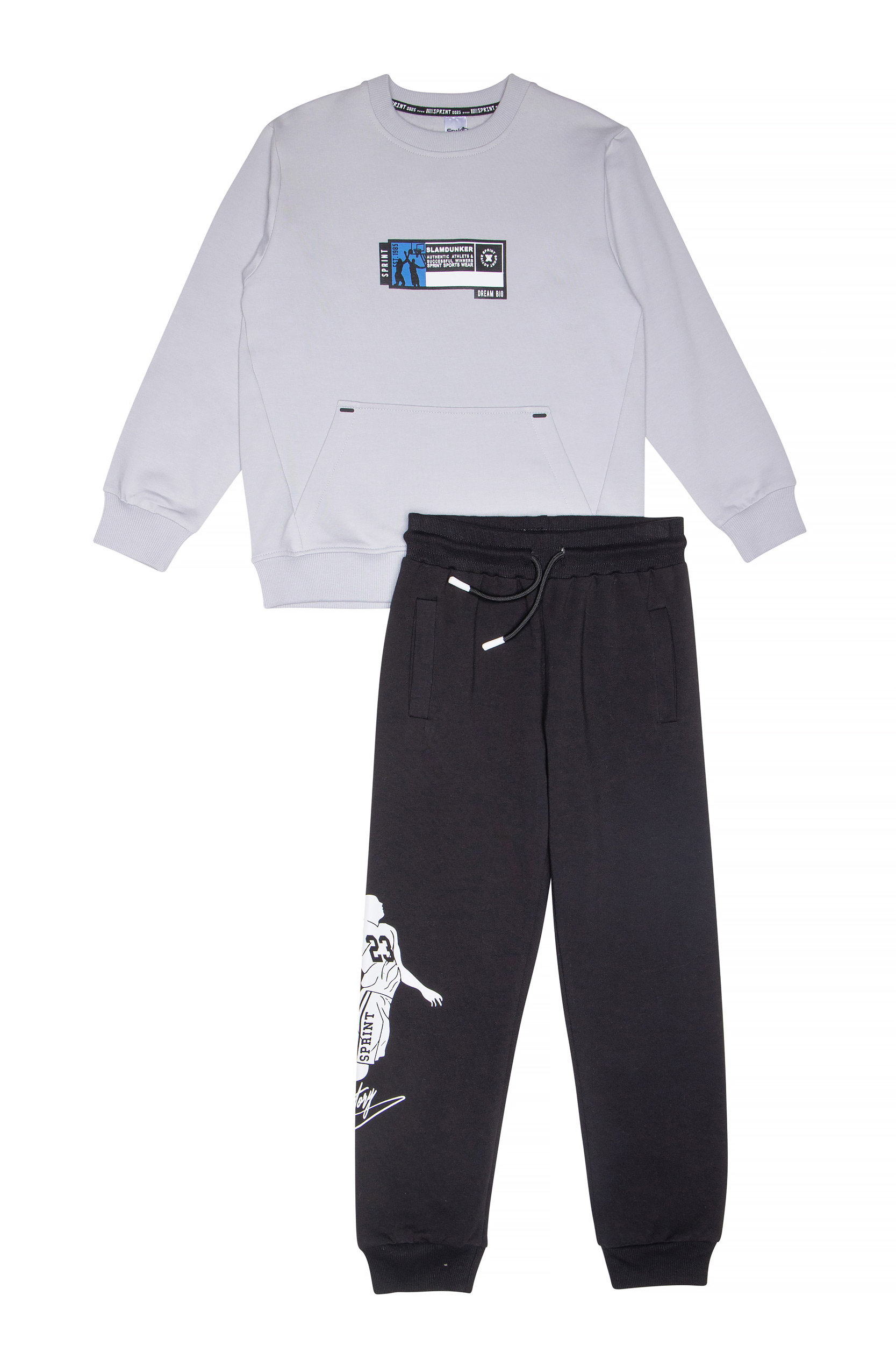 - Παιδικό σετ φόρμας 2 τεμαχίων φούτερ χωρίς χνούδι. Μπλούζα με στρογγυλή λαιμόκοψη και τσέπη, τύπωμα μπροστά και στην πλάτη με θέμα BASKET. Παντελόνι με ελαστικό ζωνάρι και ρυθμιζόμενα κορδόνια με μπροστινές τσέπες φιλέτο και τύπωμα.