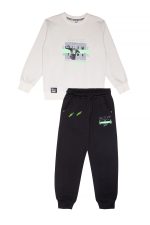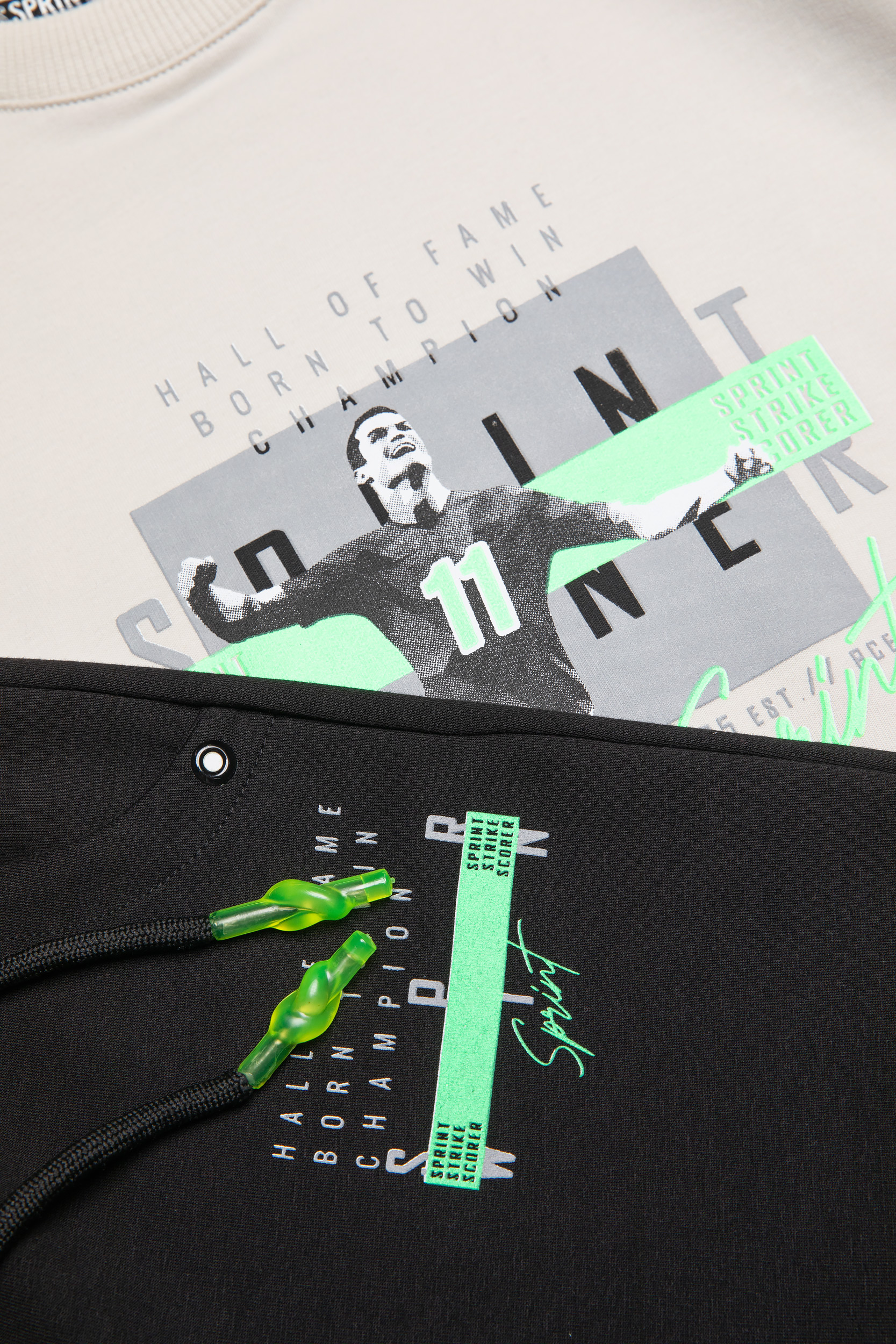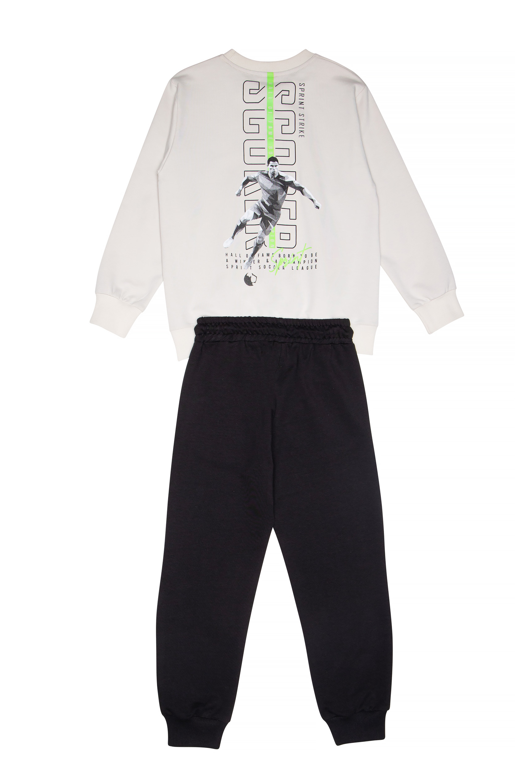 - Παιδικό σετ φόρμας 2 τεμαχίων φούτερ χωρίς χνούδι. Μπλούζα με στρογγυλή λαιμόκοψη, τύπωμα μπροστά και στην πλάτη με θέμα SOCCER. Παντελόνι με ελαστικό ζωνάρι και ρυθμιζόμενα κορδόνια με μπροστινές λοξές τσέπες και τύπωμα.
