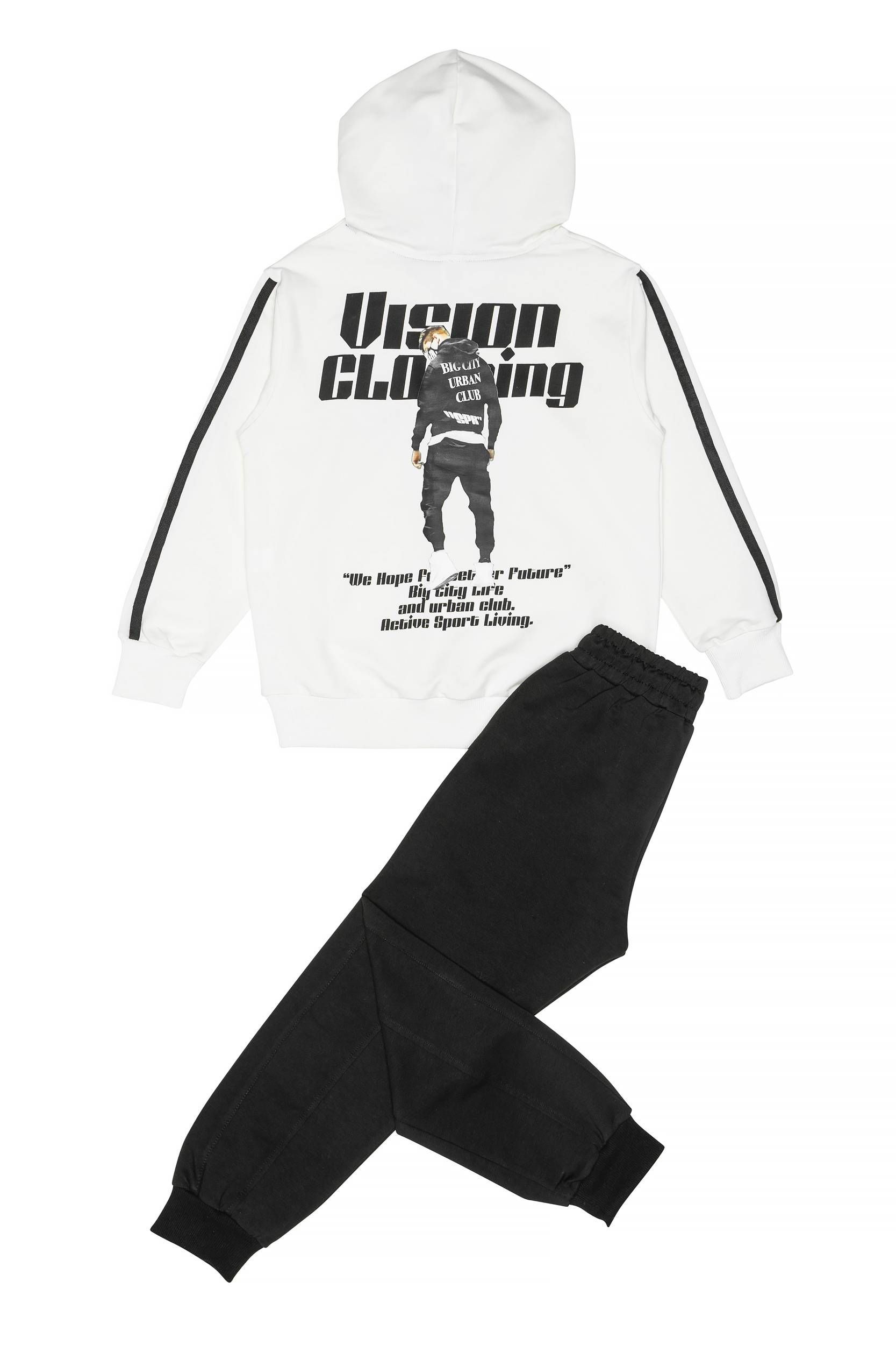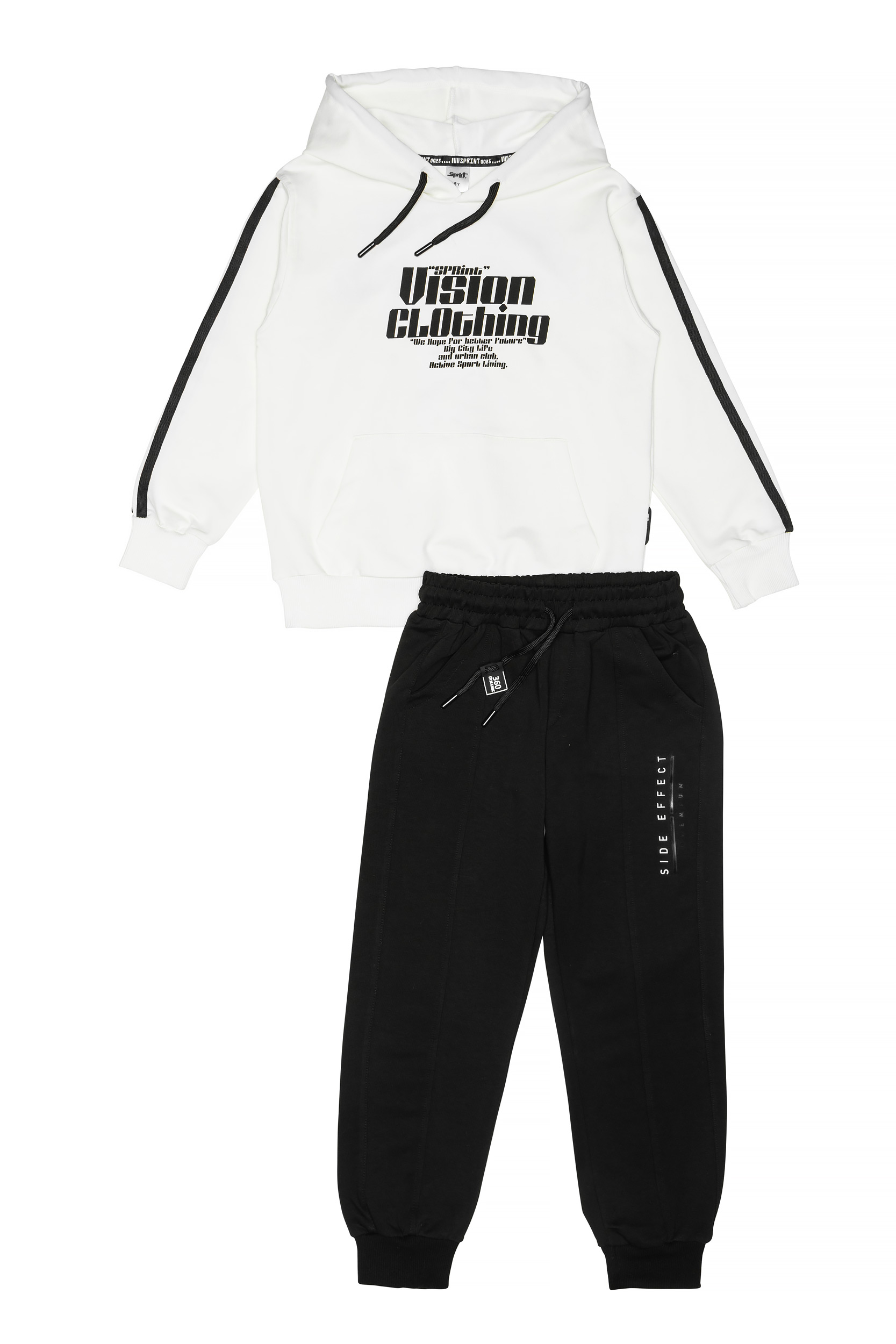 - Παιδικό σετ φόρμας 2 τεμαχίων φούτερ χωρίς χνούδι. Μπλούζα με κουκούλα και τσέπη, τύπωμα μπροστά και πίσω και αθλητικές δίχρωμες φάσες στα μανίκια. Παντελόνι με ελαστικό ζωνάρι και ρυθμιζόμενα κορδόνια με μπροστινές λοξές τσέπες και ανάγλυφο τύπωμα.