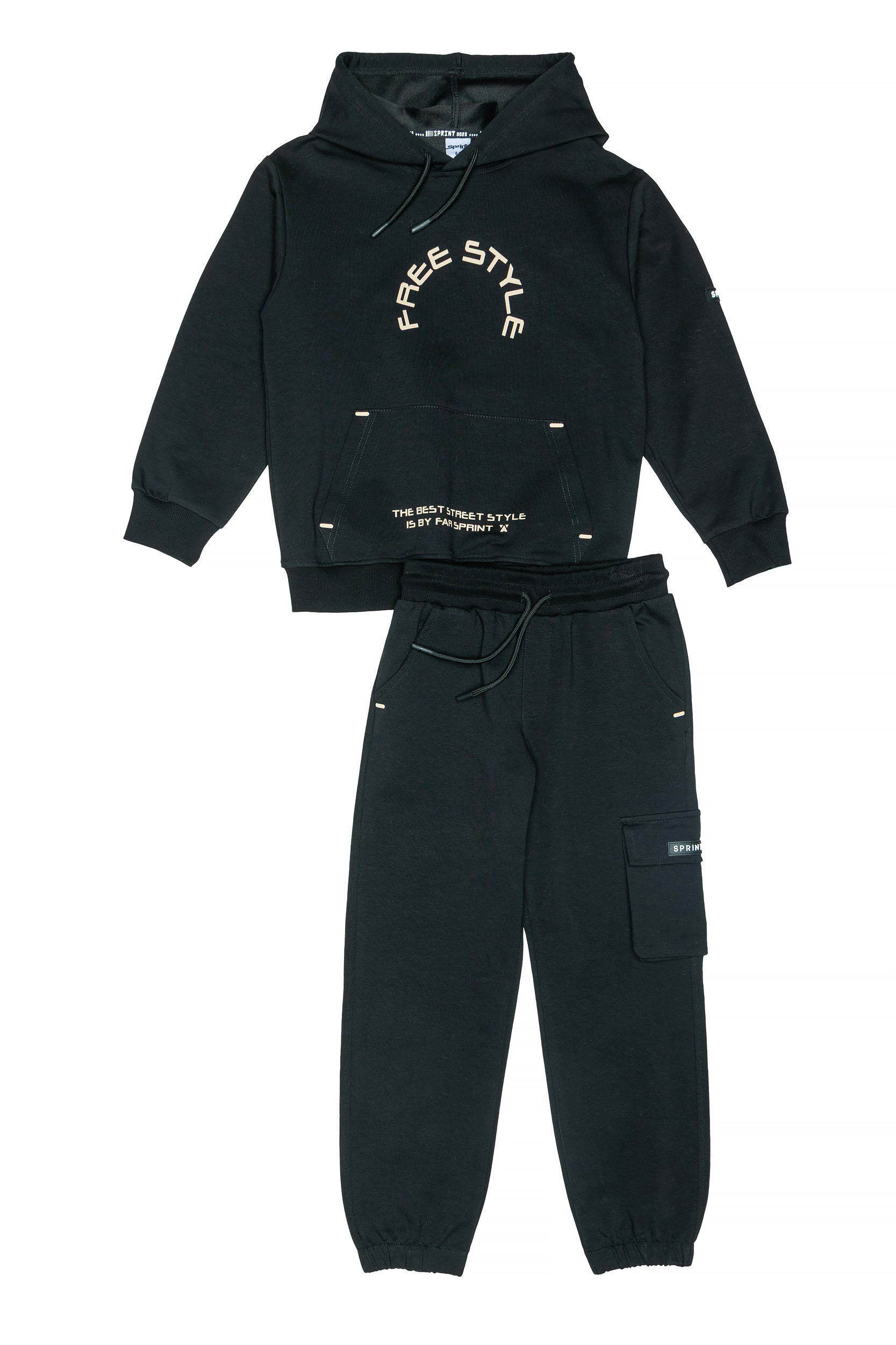 - Παιδικό σετ φόρμας 2 τεμαχίων φούτερ χωρίς χνούδι. Μπλούζα με κουκούλα και τσέπη, τύπωμα μπροστά και απλικέ rubber ανάγλυφη SPRINT ετικέτα. Παντελόνι τύπου cargo με ελαστικό ζωνάρι και ρυθμιζόμενα κορδόνια. Τσέπες λοξές επάνω και τσέπη με πατ και απλικέ ετικέτα.