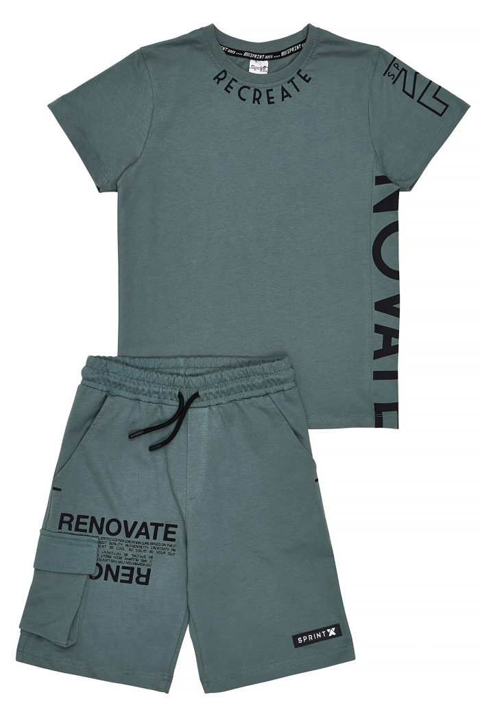 - Παιδικό σετ 2 τεμαχίων. Μπλούζα με τύπωμα “RECREATE” & “RENOVATE” στον λαιμό, στο πλάι και στο μανίκι. Βερμούδα φούτερ με ελαστικό ζωνάρι και ρυθμιζόμενα κορδόνια, μπροστινές λοξές τσέπες, πλαϊνή τσέπη τύπου cargo με τύπωμα και διακοσμητική ετικέτα rubber SPRINT στο κάτω μέρος.