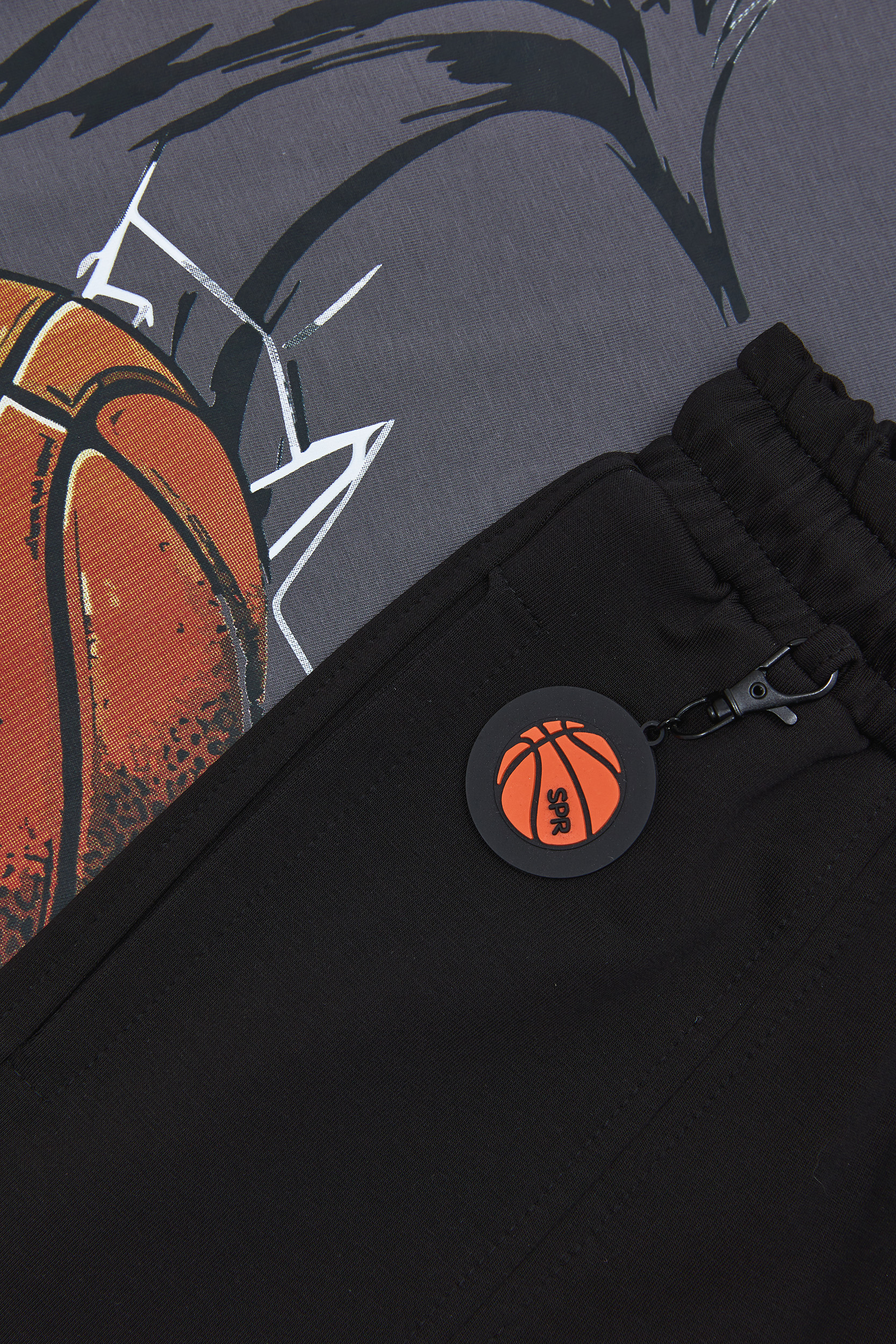 - Παιδικό σετ 2 τεμαχίων. Μπλούζα με εντυπωσιακό graphic print μιας μπάλας μπάσκετ που «σπάει» τα όρια! Βερμούδα φούτερ με ελαστικό ζωνάρι και ρυθμιζόμενα κορδόνια, πλαϊνές τσέπες, κάθετο διακοσμητικό κόψιμο με ανάγλυφο τύπωμα “SPR/// ATHLETIC CLUB” και αξεσουάρ μπρελόκ-μπάλα.