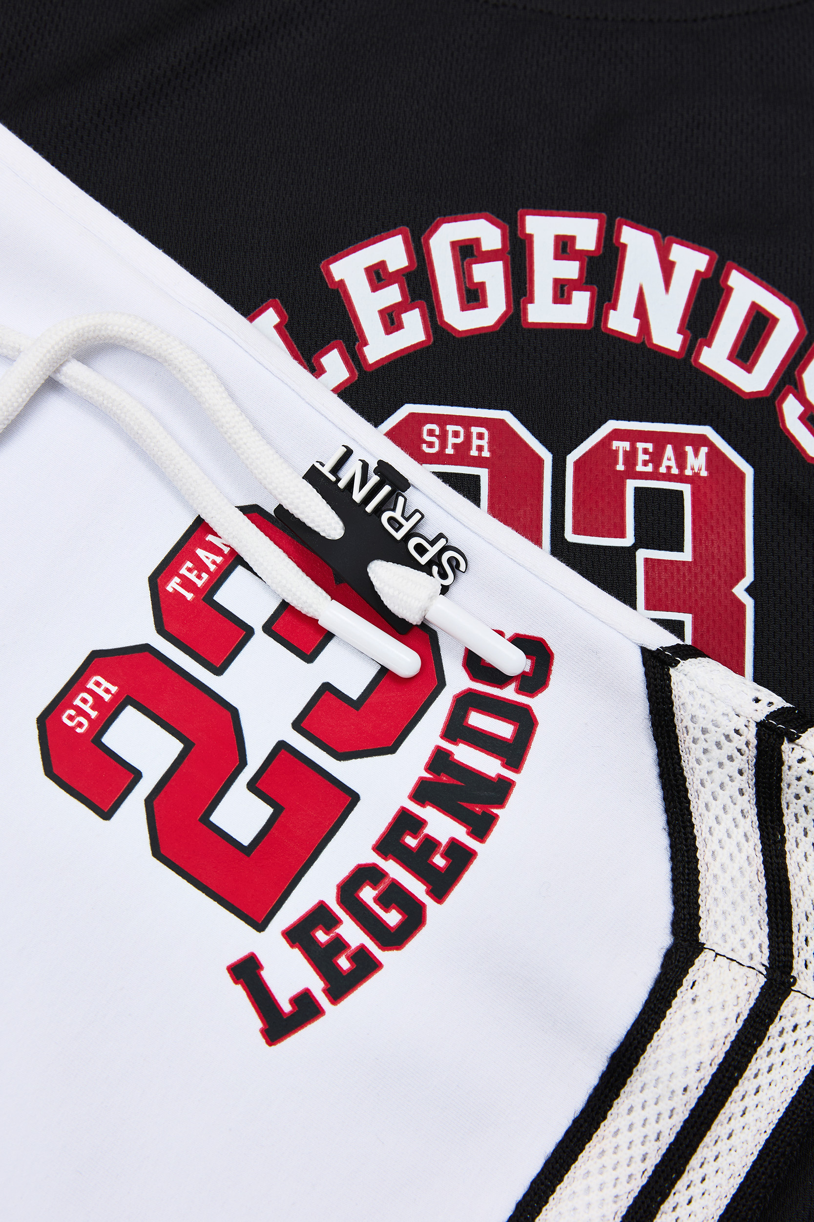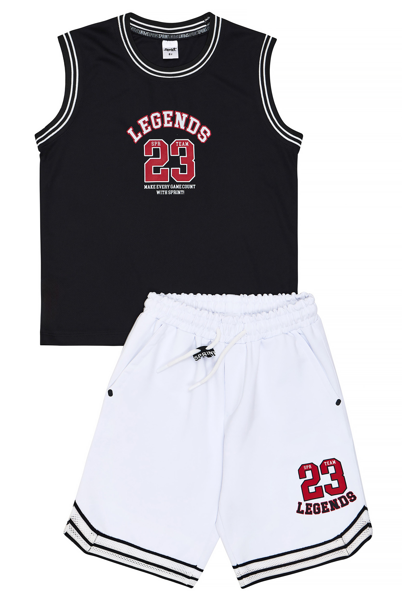 - Παιδικό σετ 2 τεμαχίων. Μπλούζα αμάνικη μπασκετική, Tech Sport Mesh με τύπωμα “Legends” μπροστά και στην πλάτη με δίχρωμες φάσες ρίμπ στον λαιμό και μασχάλες. Αθλητική βερμούδα φούτερ με ελαστικό ζωνάρι και ρυθμιζόμενα κορδόνια με rubber διακοσμητική ετικέτα, μπροστινές λοξές τσέπες και αθλητικές φάσες στο κάτω μέρος με τύπωμα.